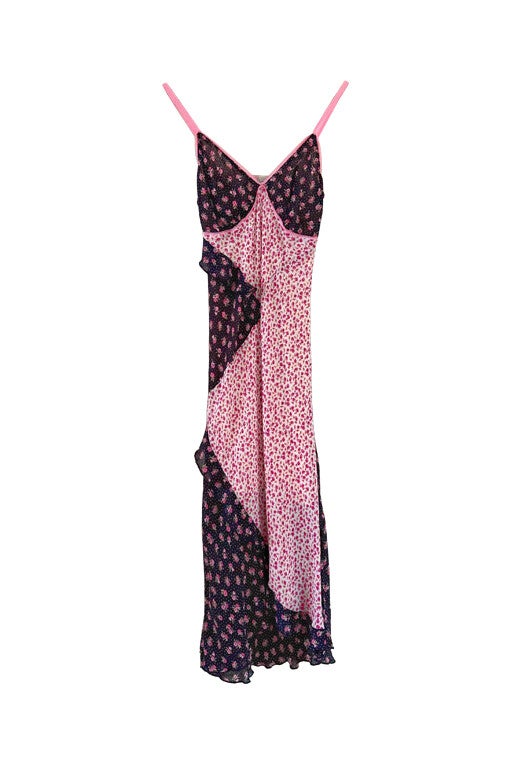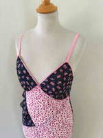 Prix unitaire parRobe nuisette à fleurs, en voile viscose doublée, imprimé patchwork de petites fleurs roses fond blanc et noir, bretelles spaghettis et poitrine en dentelle élastique rose, fabriquée en France, taille 36 portée ici sur un mannequin T36, aisselles 43 cm.