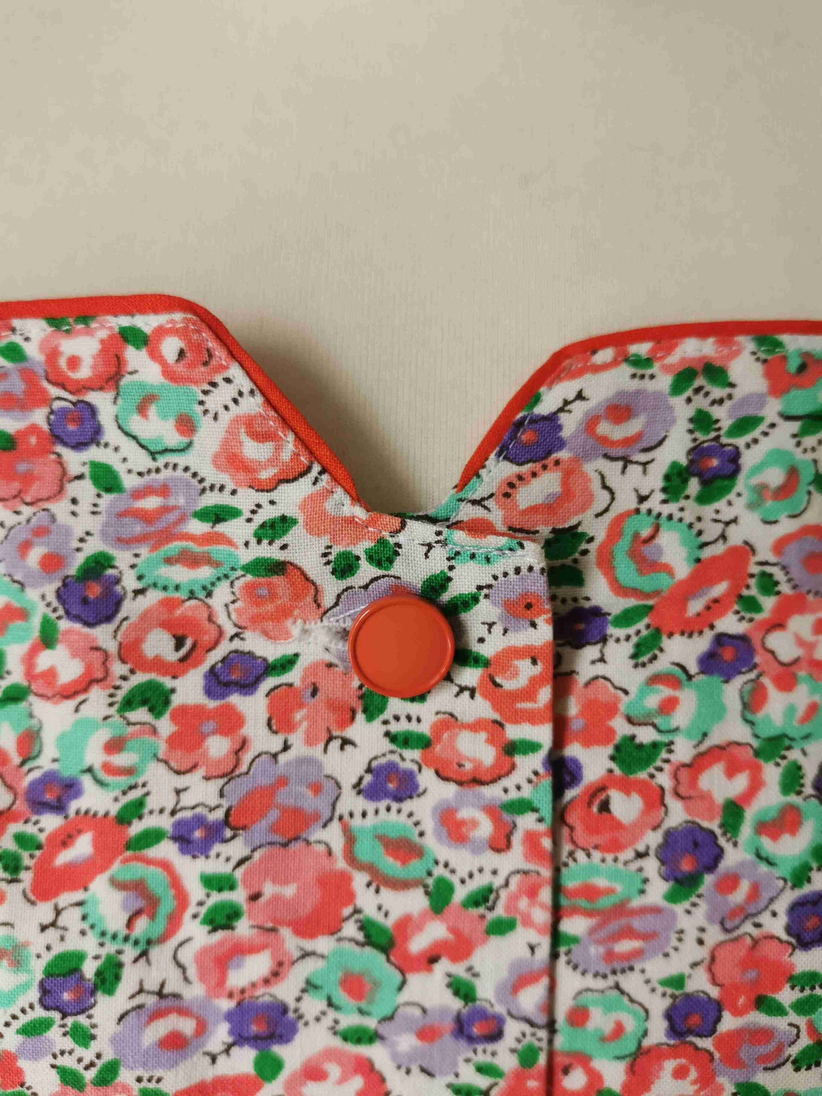 En coton au fond blanc avec motif floral vert, corail et violet
