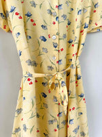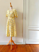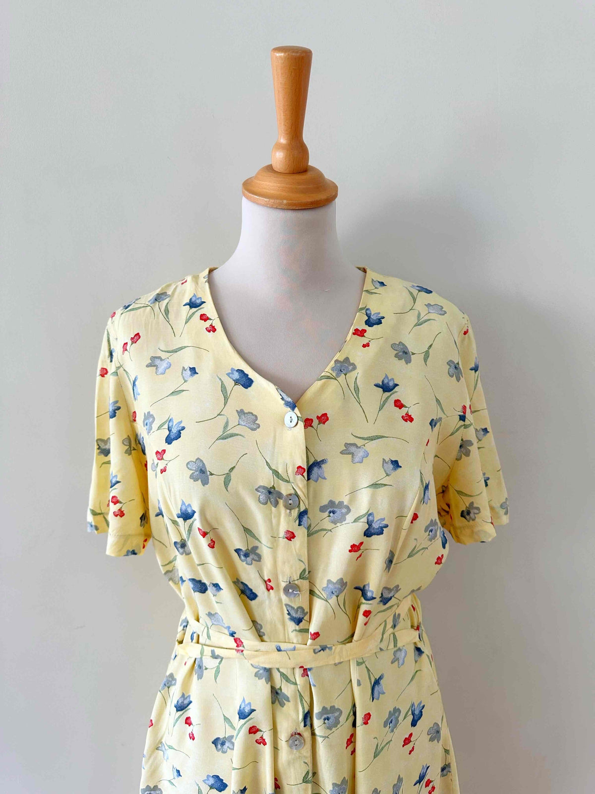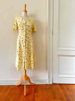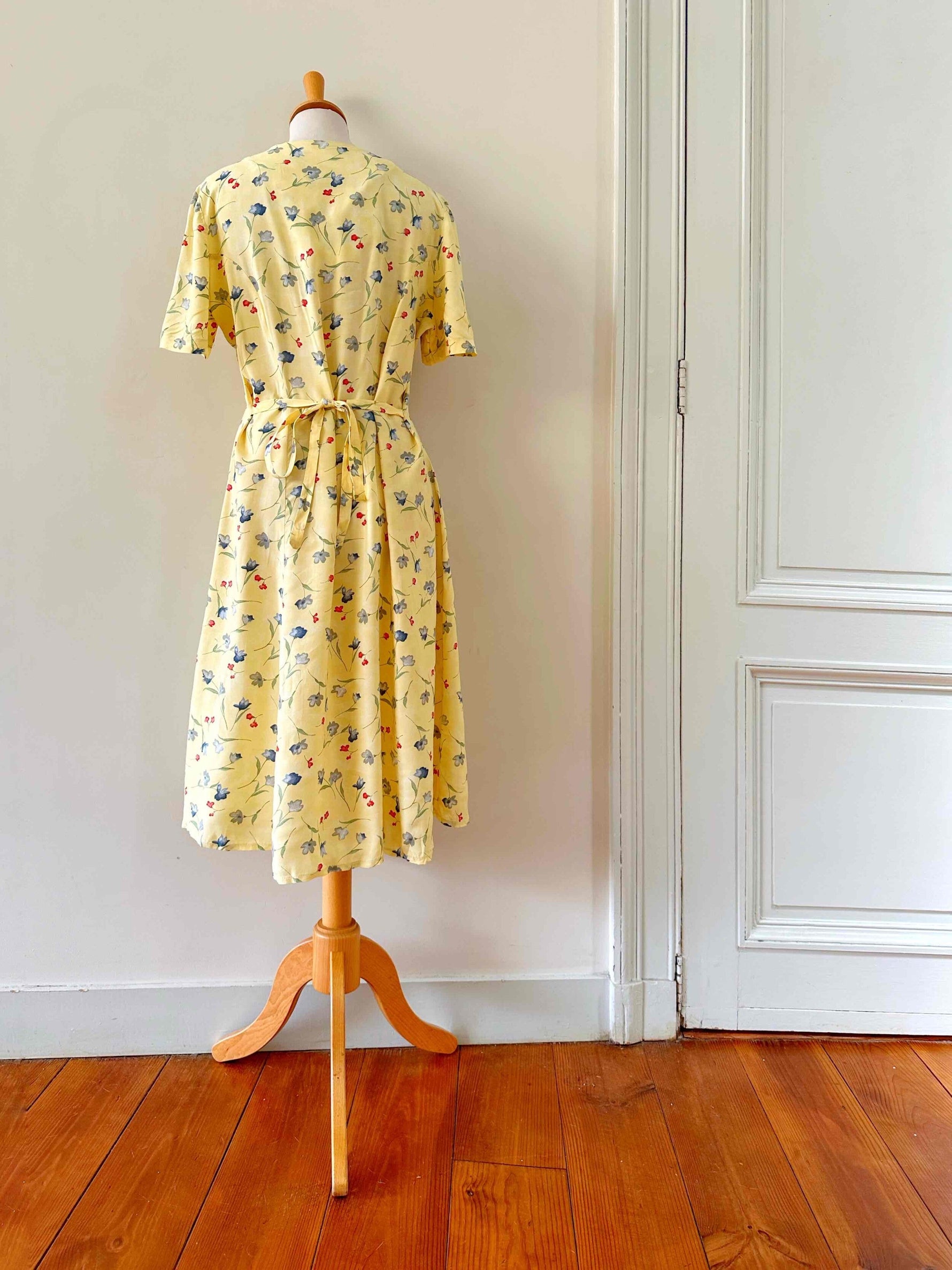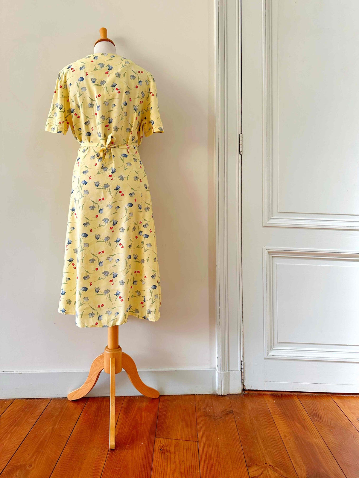 Prix unitaire parRobe longue à fleurs, en viscose jaune poussin imprimée petites fleurs bleues, rouges, et vertes, boutonnée en nacre, manches courtes, lien à nouer ou double noué taille, années 90s, taille 36 et 38, portée ici sur un mannequin T36. Aisselles 45 cm.