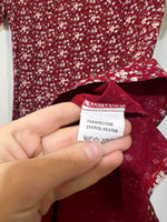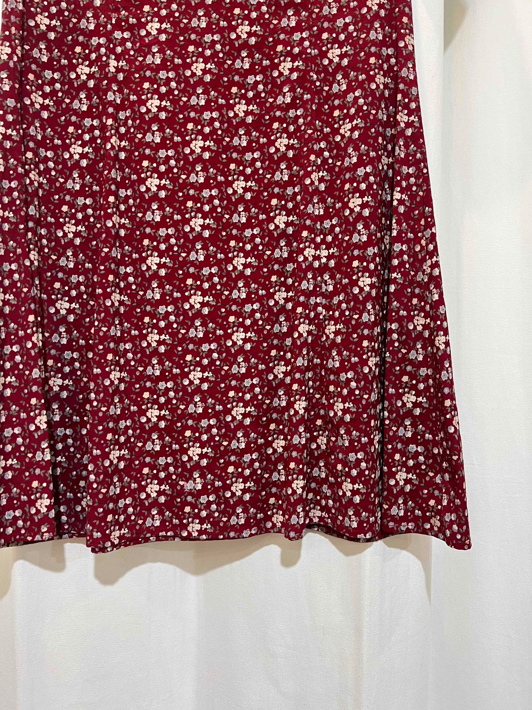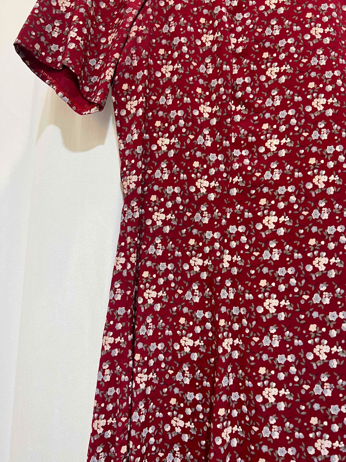 Prix unitaire parRobe droite à manches courtes, rouge bordeaux avec des fleurs grises et beiges. Années 90s.