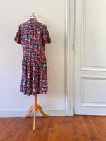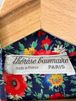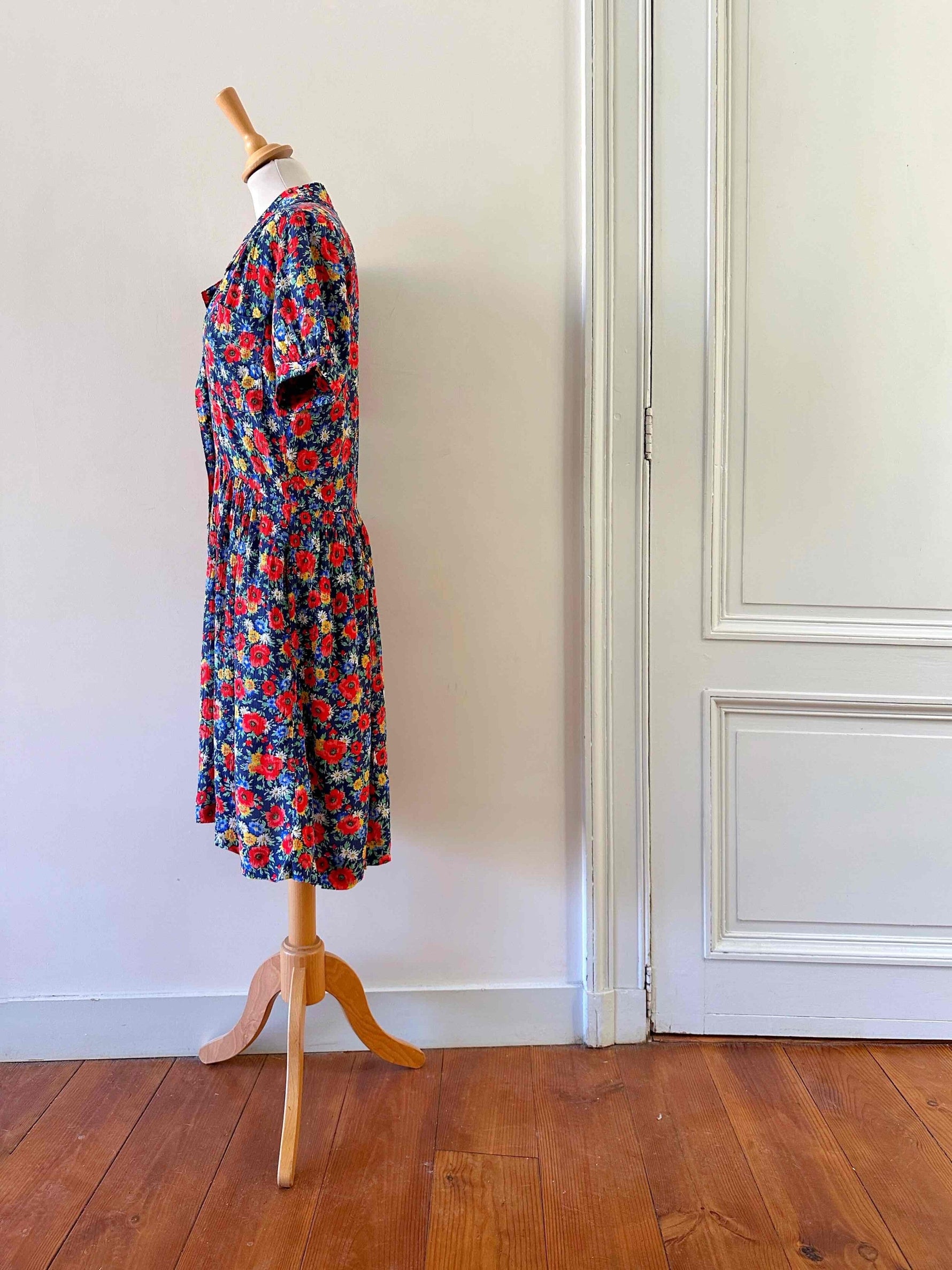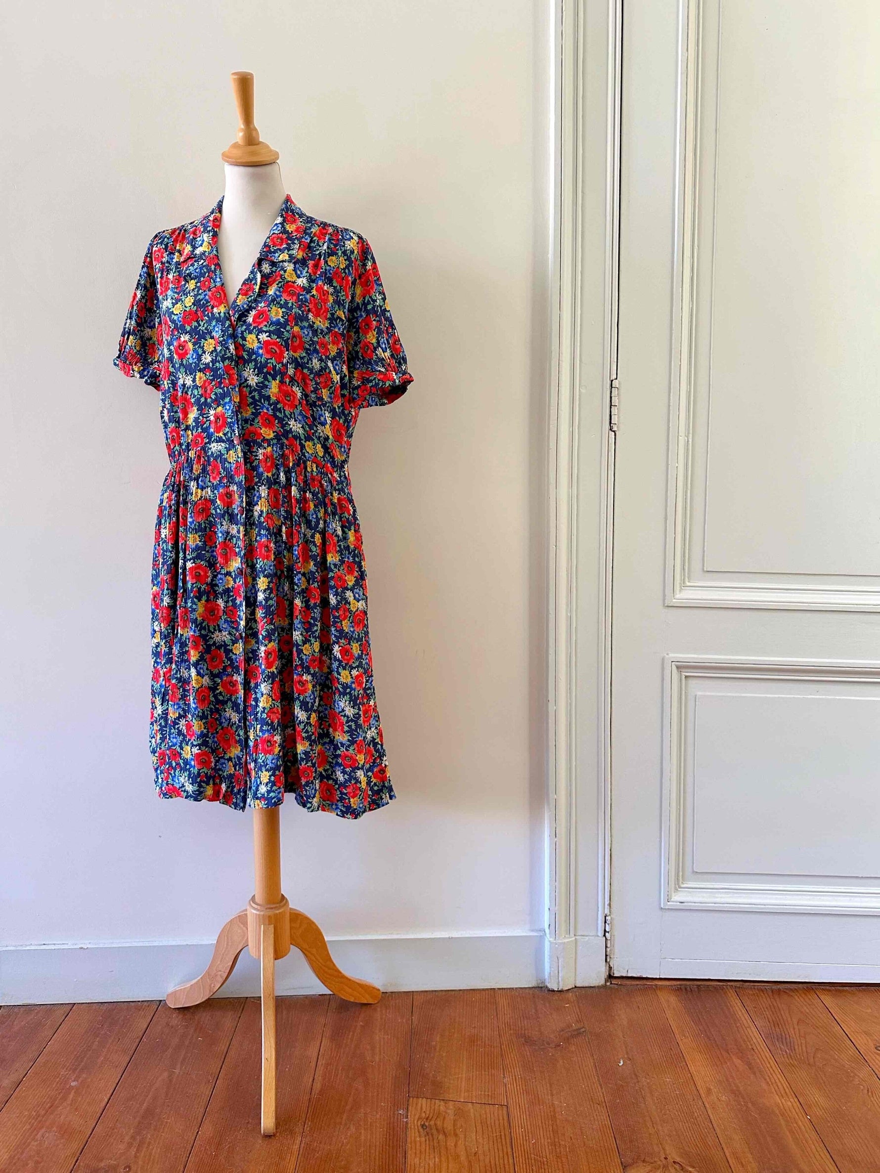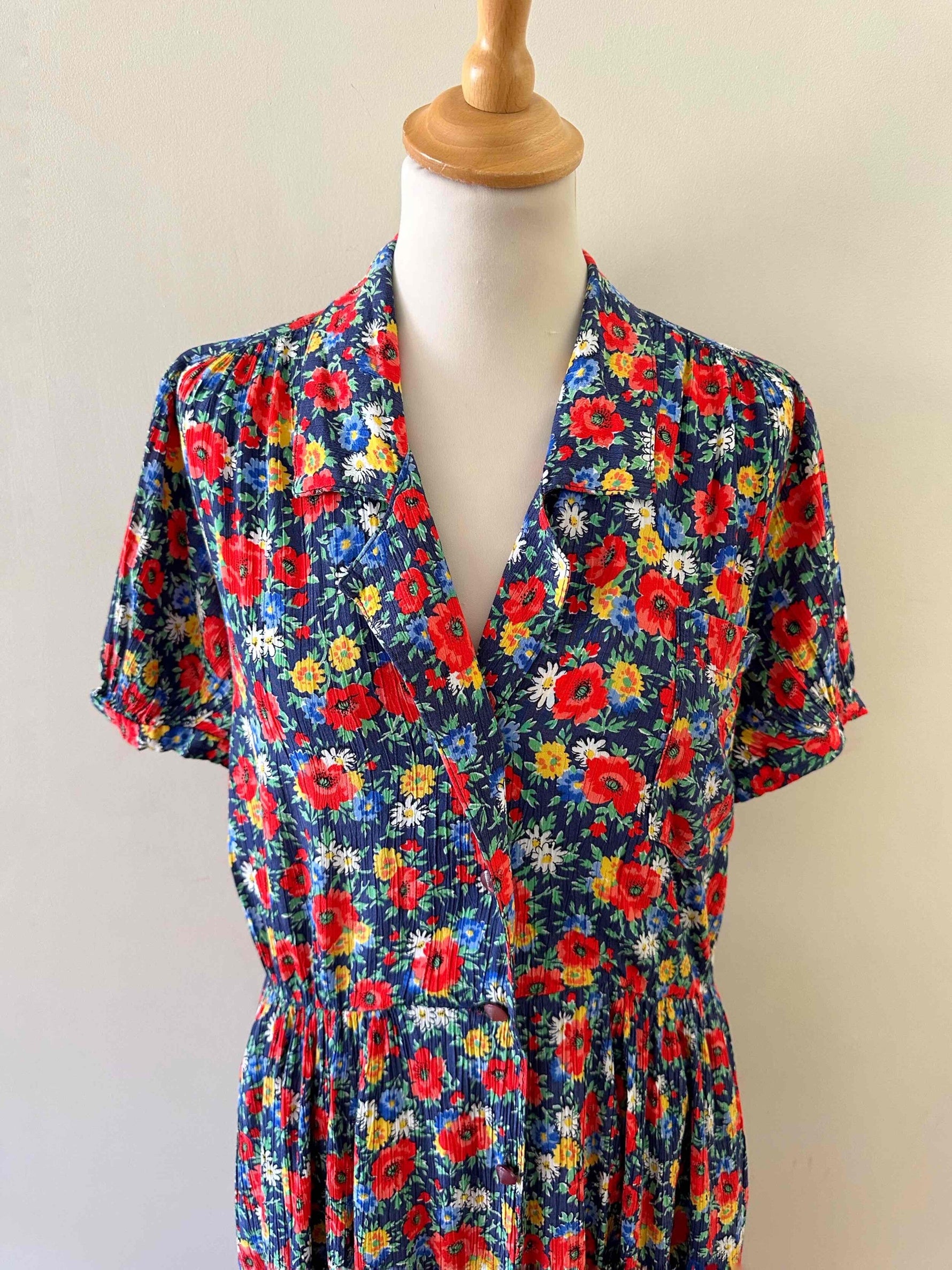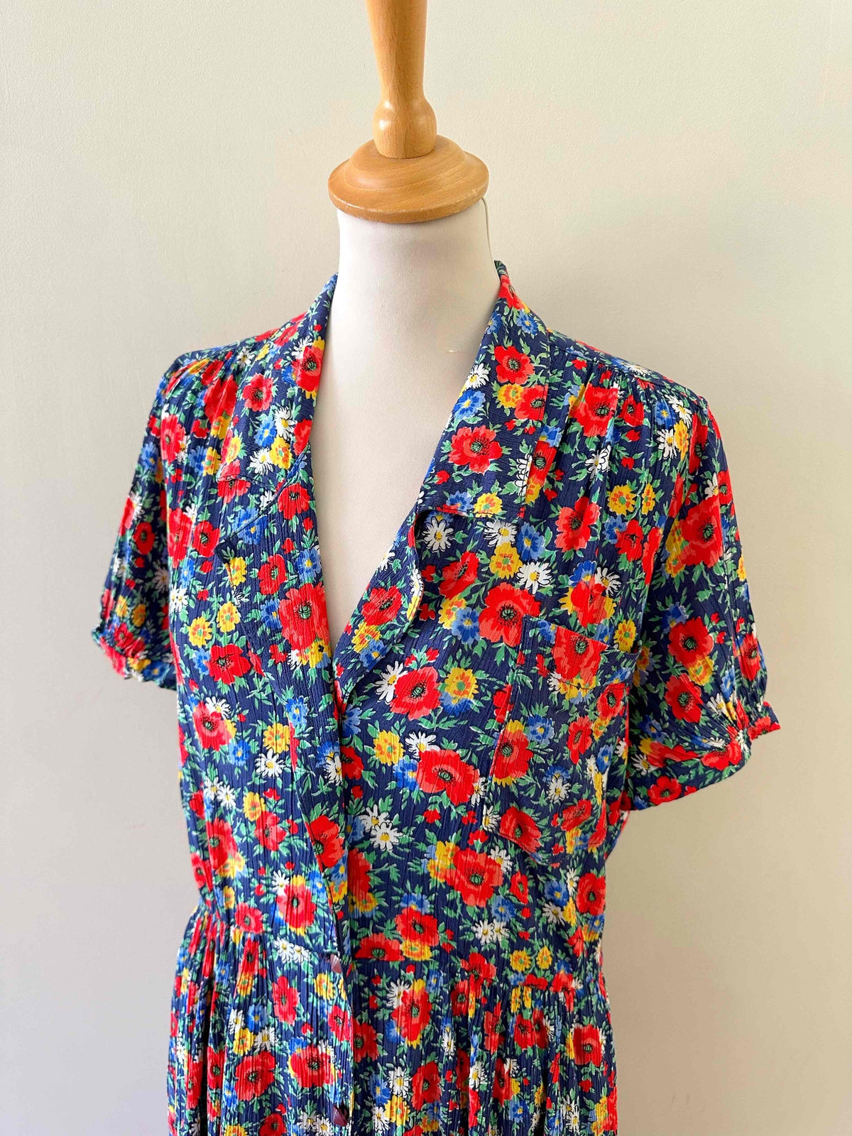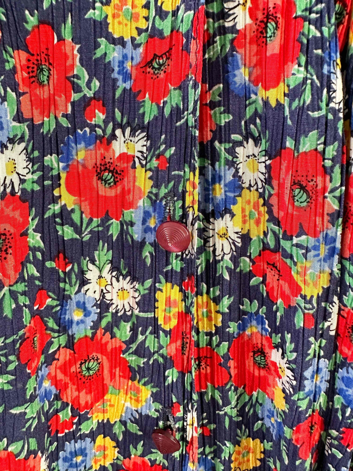 Prix unitaire parRobe chemise à fleurs, en viscose plissée imprimée fleurs de prairie, coquelicots, pâquerettes, col chemisier, boutonnée, manches ballons, fabriquée en France, taille 38 portée ici sur un mannequin T36, aisselles 45cm.