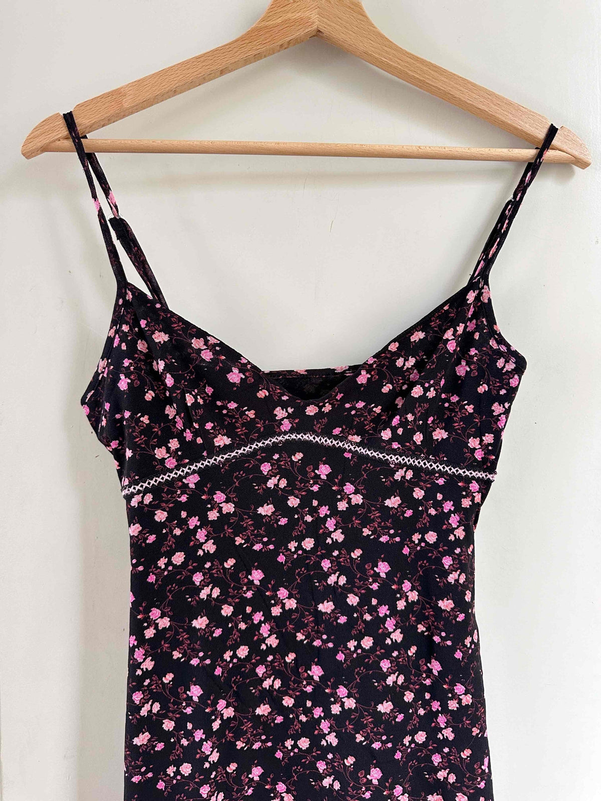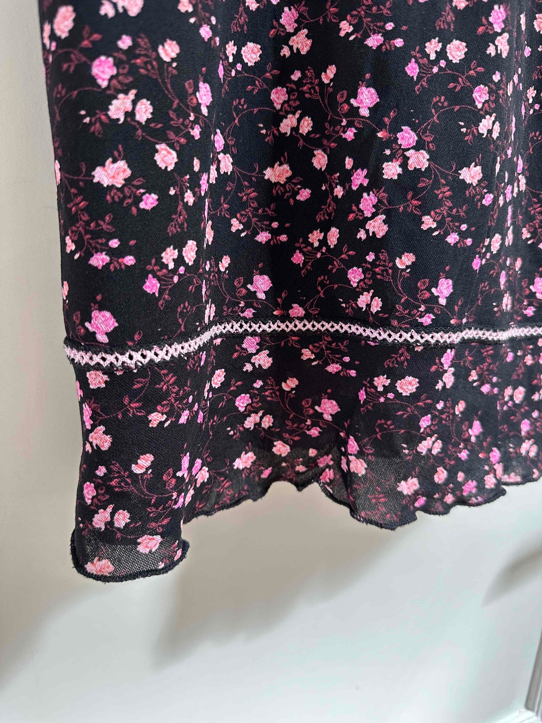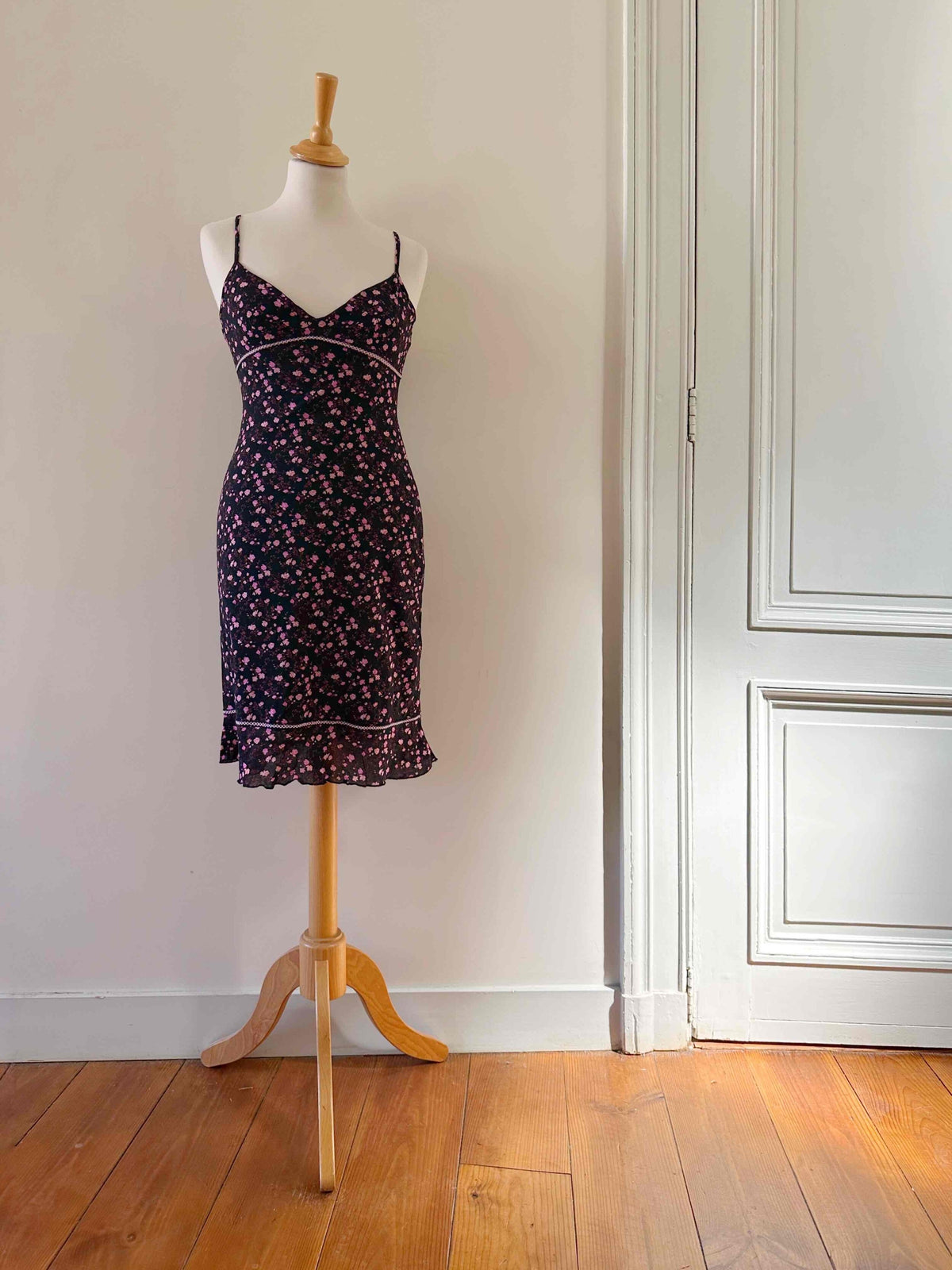 Robe nuisette à fleurs, en mesh noire imprimée petites fleurs roses, bretelles spaghettis réglables, détails de broderies roses, taille 34 et 36 portée ici sur un mannequin T36.