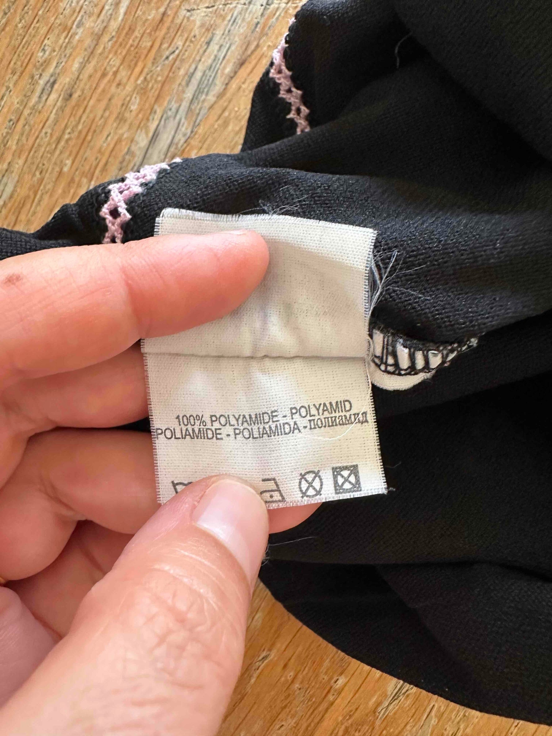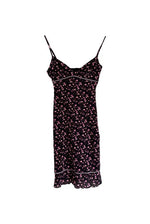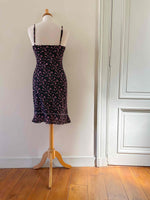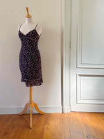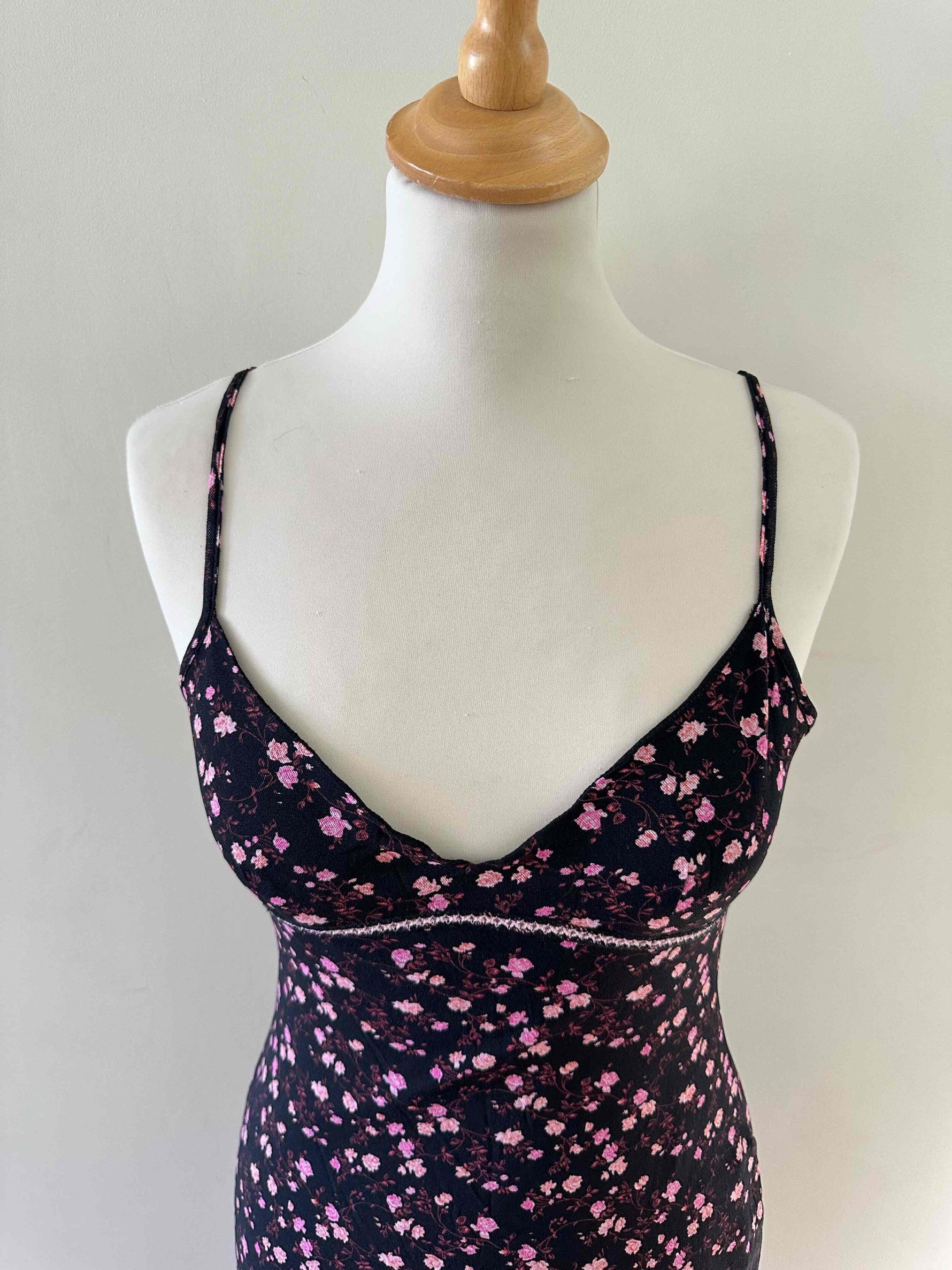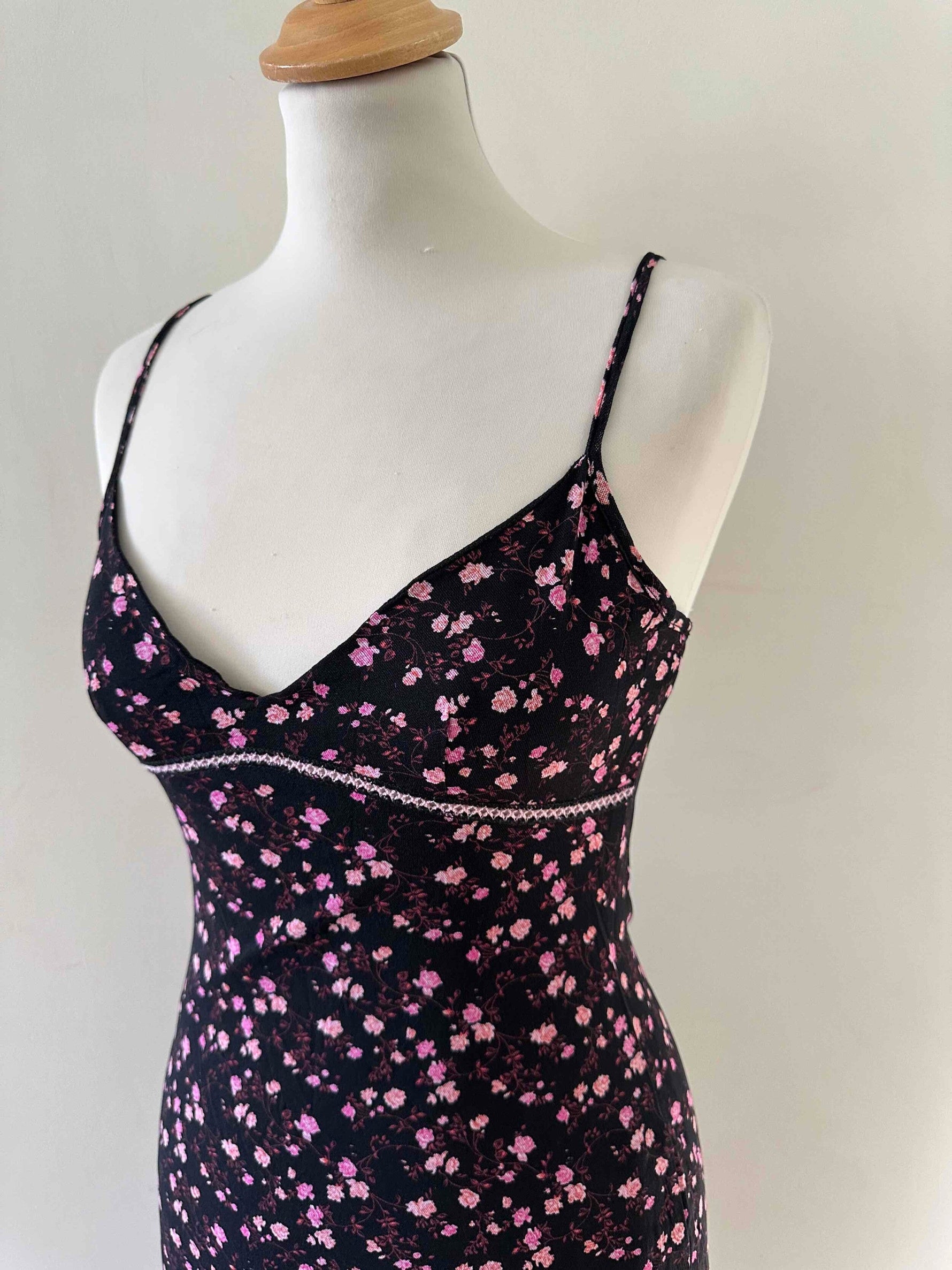Robe nuisette à fleurs, en mesh noire imprimée petites fleurs roses, bretelles spaghettis réglables, détails de broderies roses, taille 34 et 36 portée ici sur un mannequin T36.