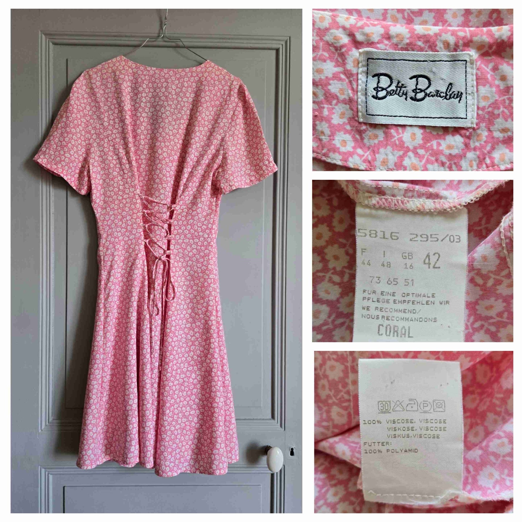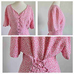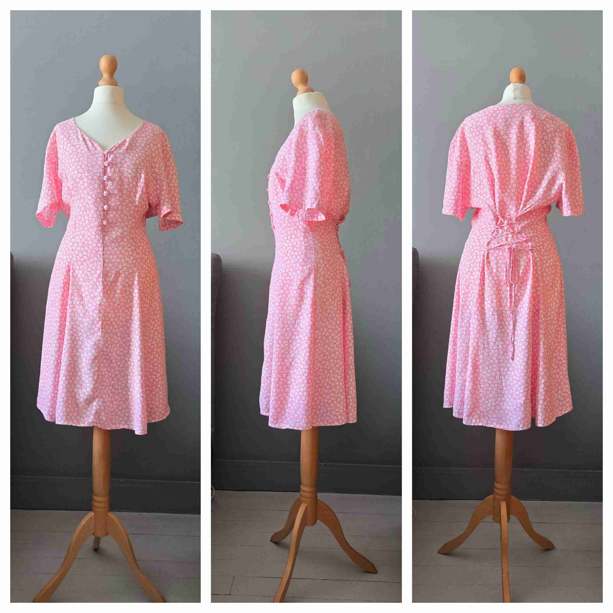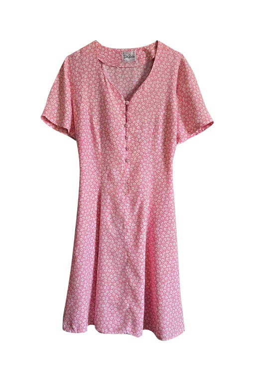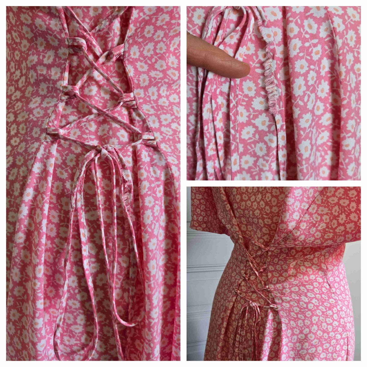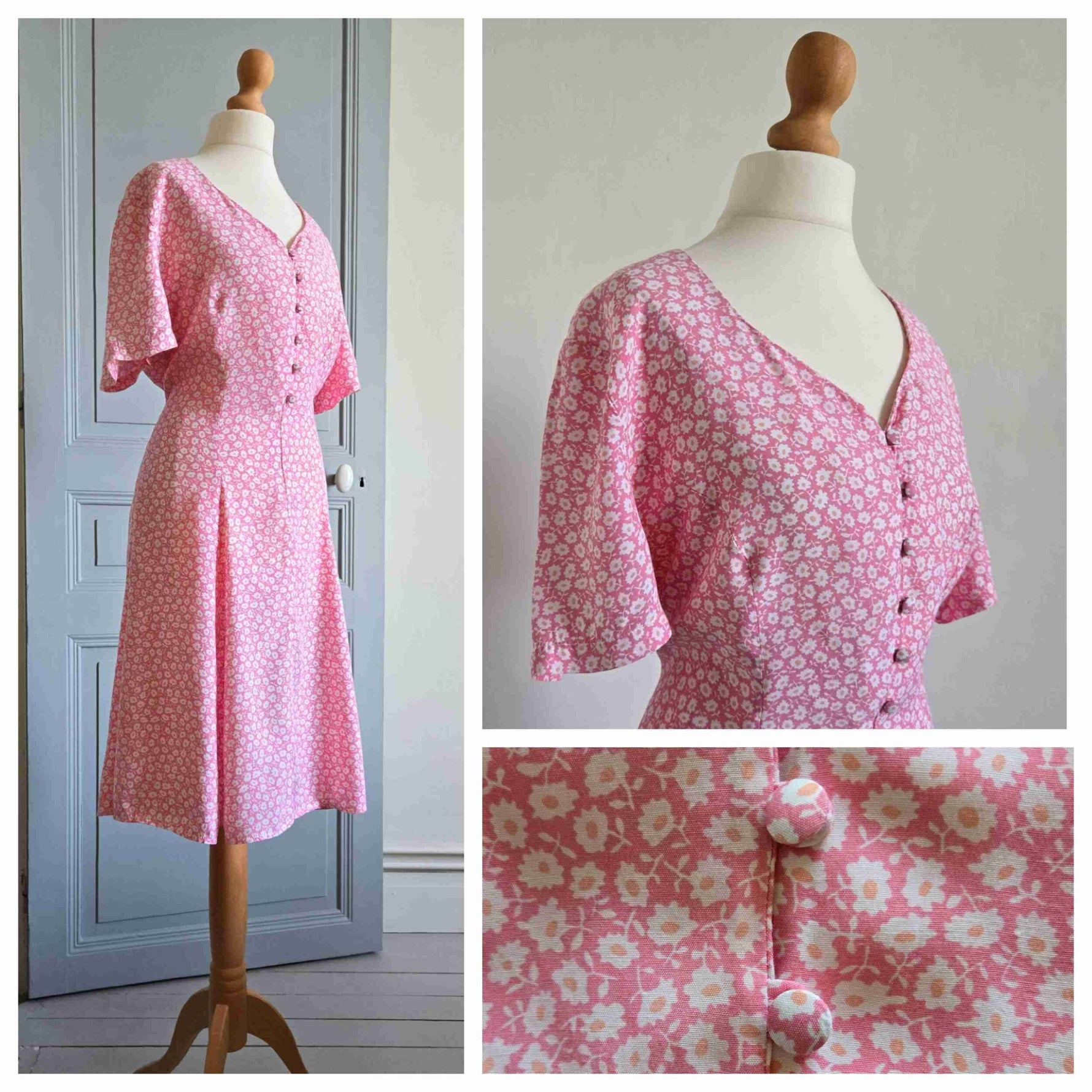 Prix unitaire parRobe à fleurs en viscose rose pastel imprimé petites fleurs blanches et abricot, corsage boutonné, boutons-brides recouverts, lien croisé à nouer au dos pour ajuster la taille. Annees 90. Poitrine 45 cm.