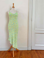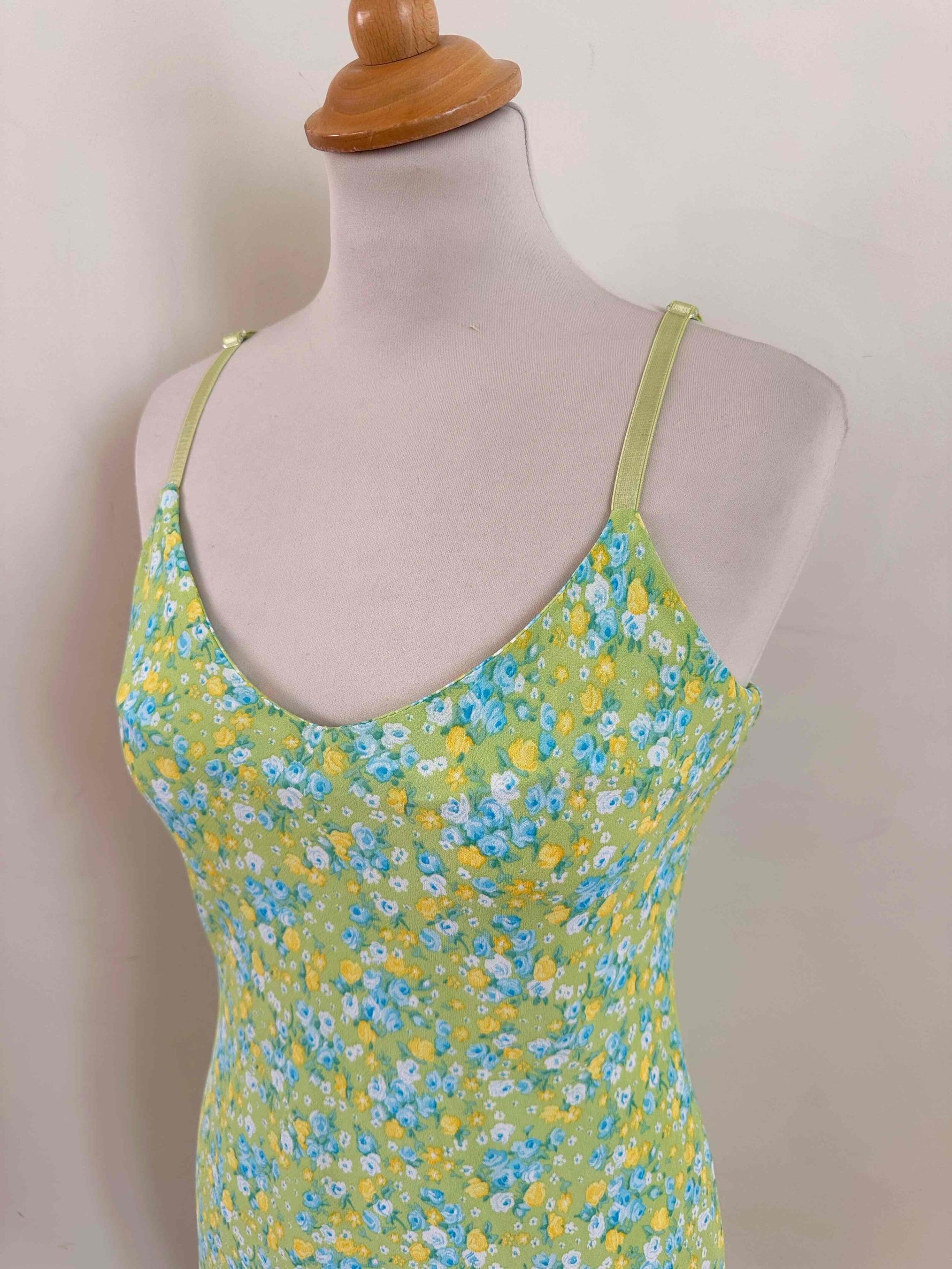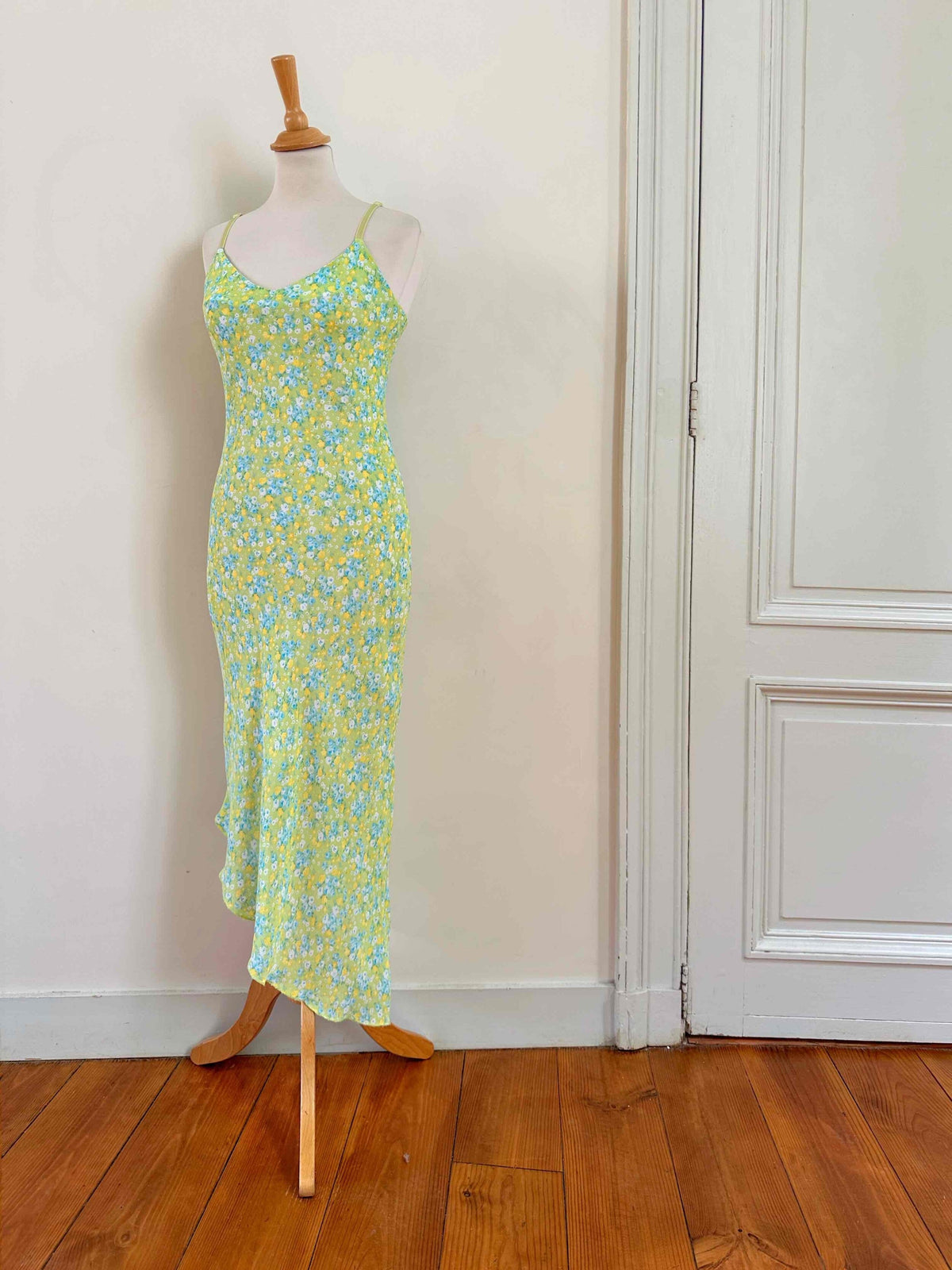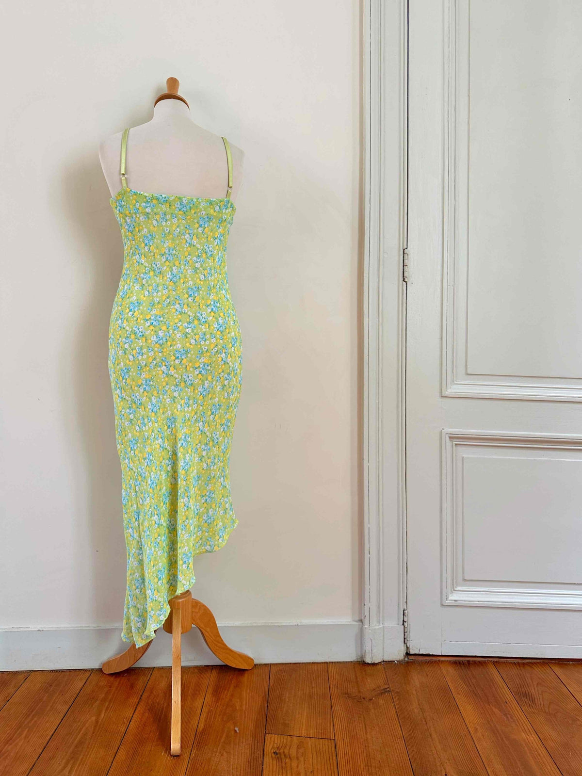 Prix unitaire parRobe nuisette à fleurs, en voile viscose doublé vert pistache imprimée petites fleurs jaunes, bleu ciel et blanches, bretelles spaghettis élastiques et réglables, bas asymétrique, forme en biais, fabriquée en France, taille 36 portée ici sur un mannequin T36.