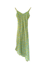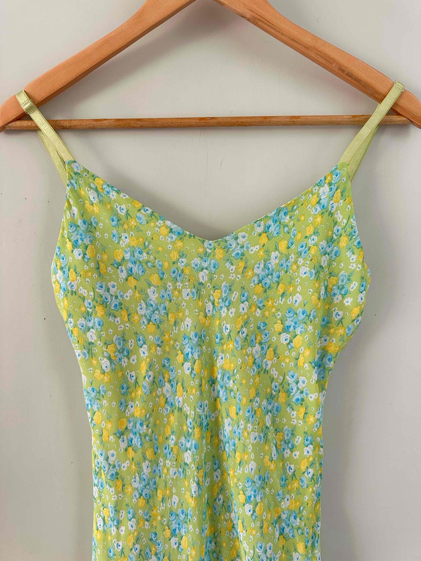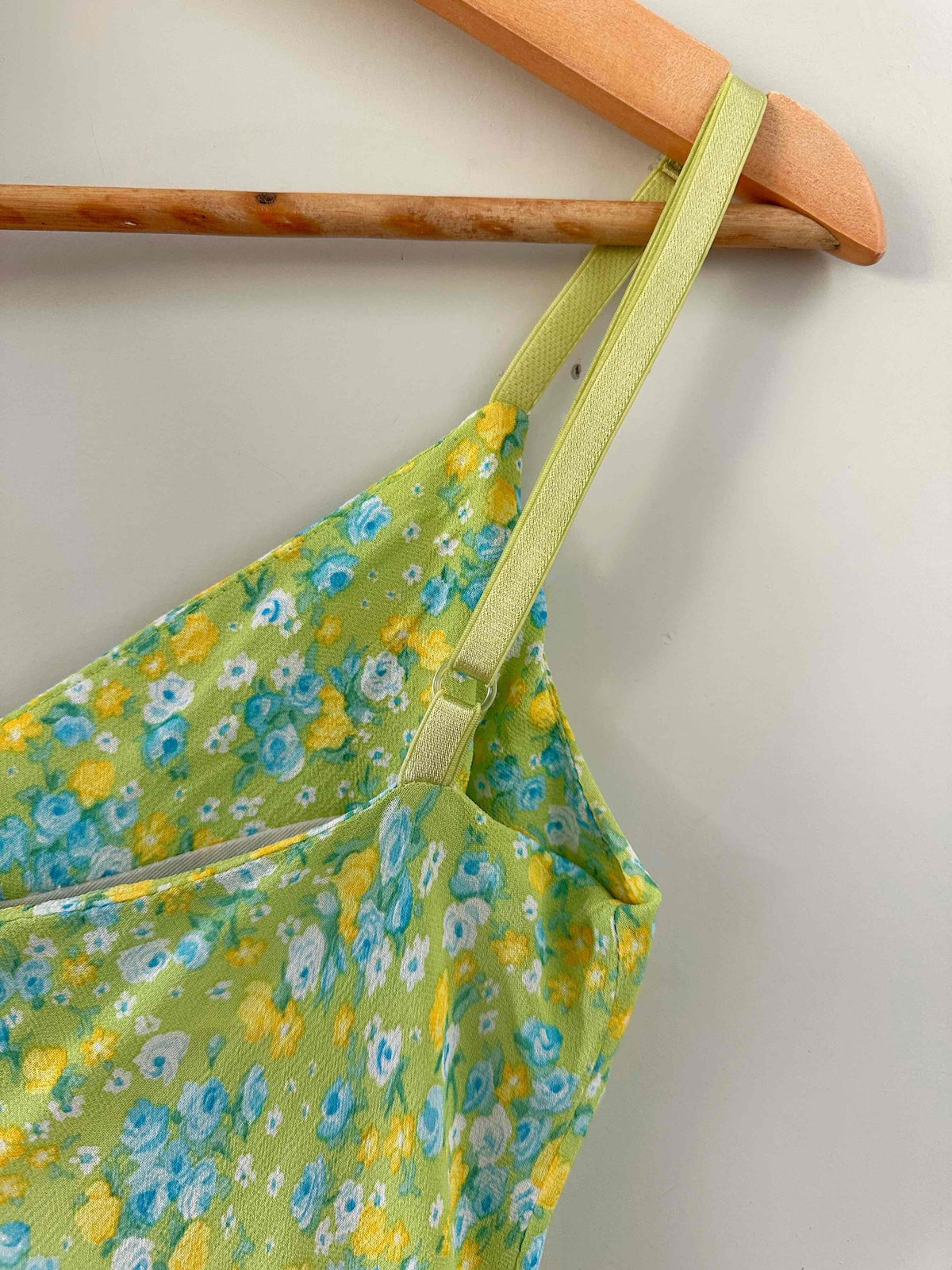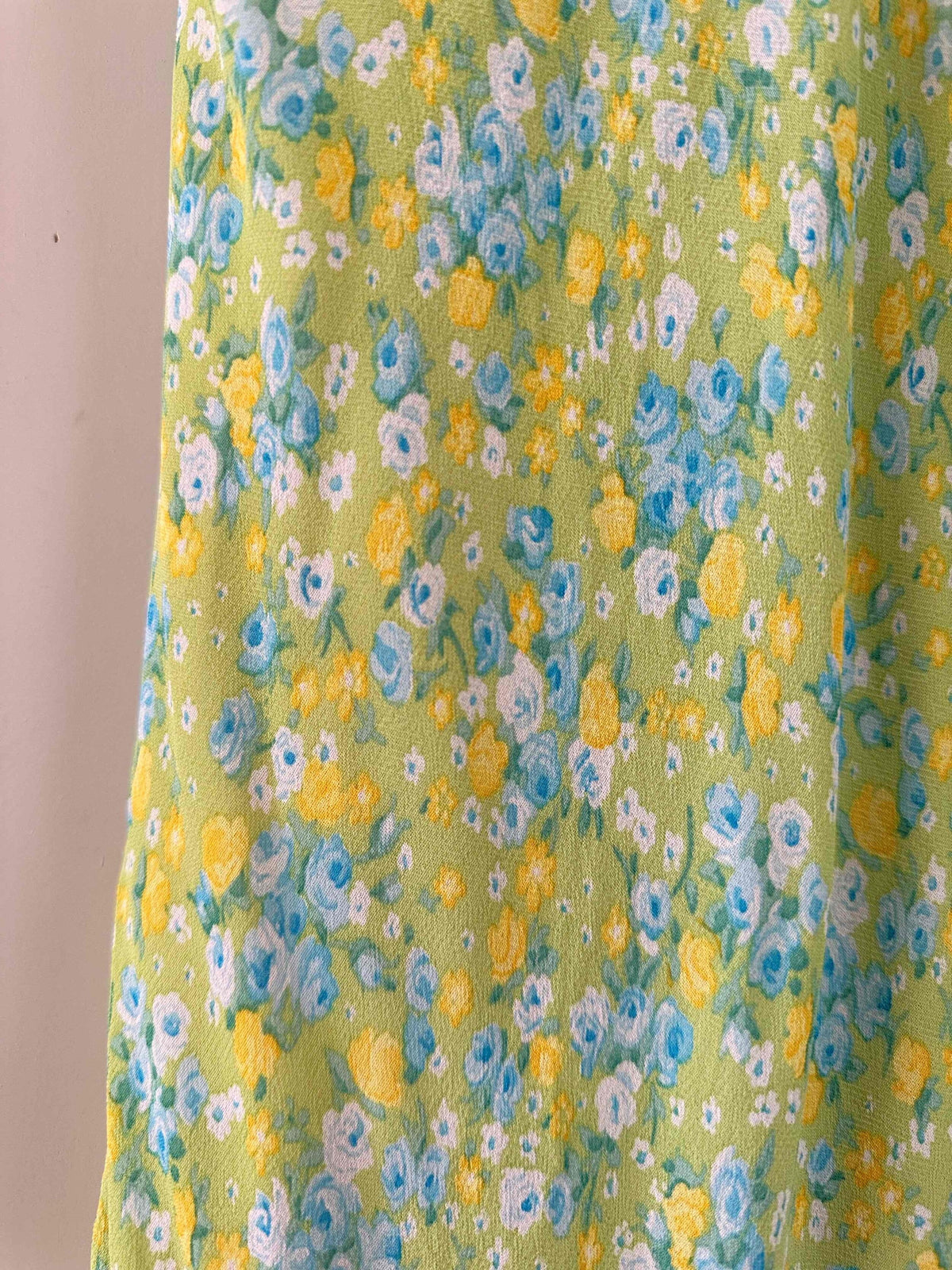 Prix unitaire parRobe nuisette à fleurs, en voile viscose doublé vert pistache imprimée petites fleurs jaunes, bleu ciel et blanches, bretelles spaghettis élastiques et réglables, bas asymétrique, forme en biais, fabriquée en France, taille 36 portée ici sur un mannequin T36.