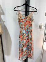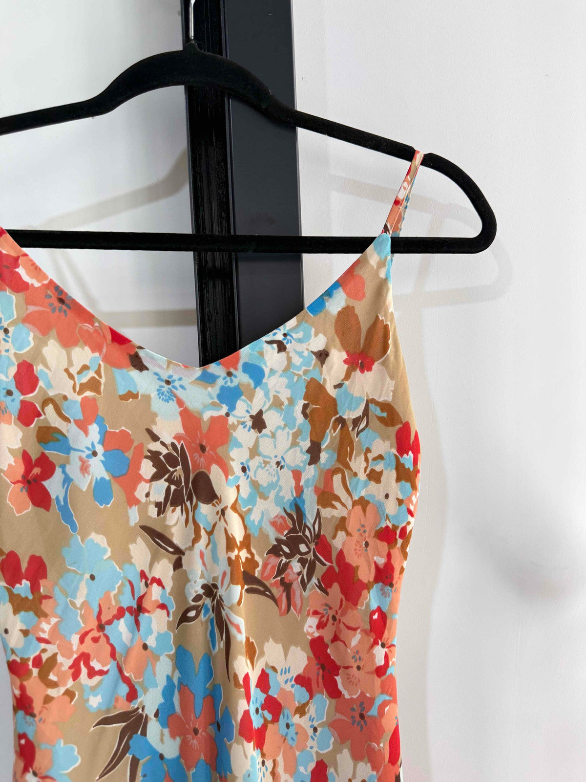Prix unitaire parRobe spaghettis beige avec des fleurs orangées et blues. Taille 36. Doublée. Excellent état. Années 2000s.