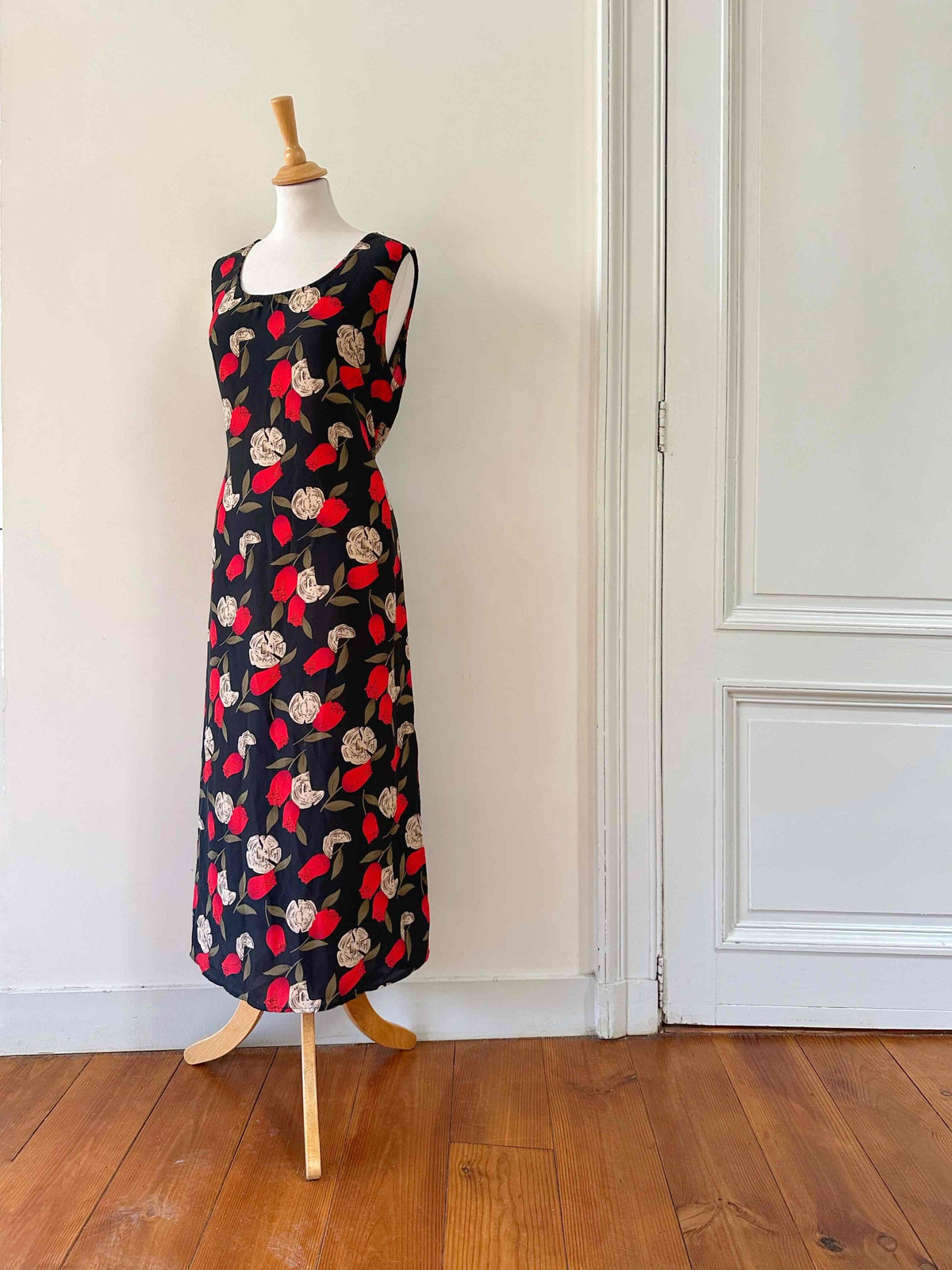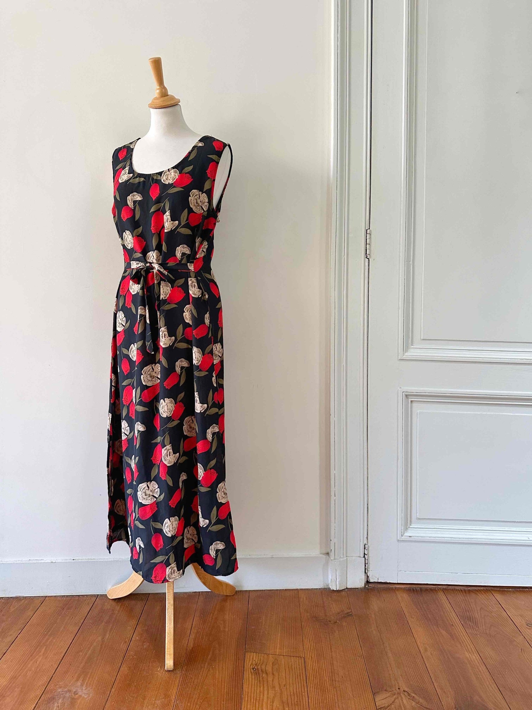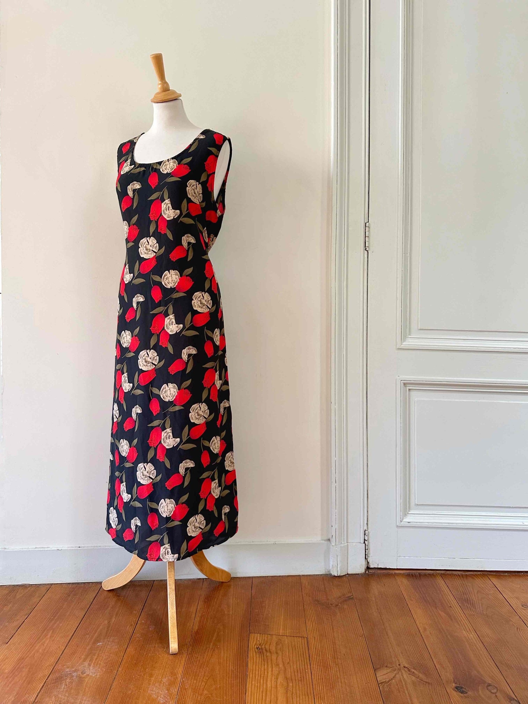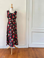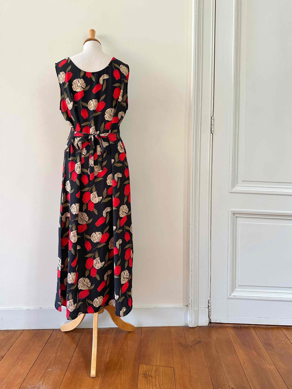 Prix unitaire parRobe nuisette à fleurs, en soie et viscose noire imprimée de fleurs rouges, blanches et vertes. Forme droite trois trous à nouer devant ou dos, fendue sur les deux côtés.