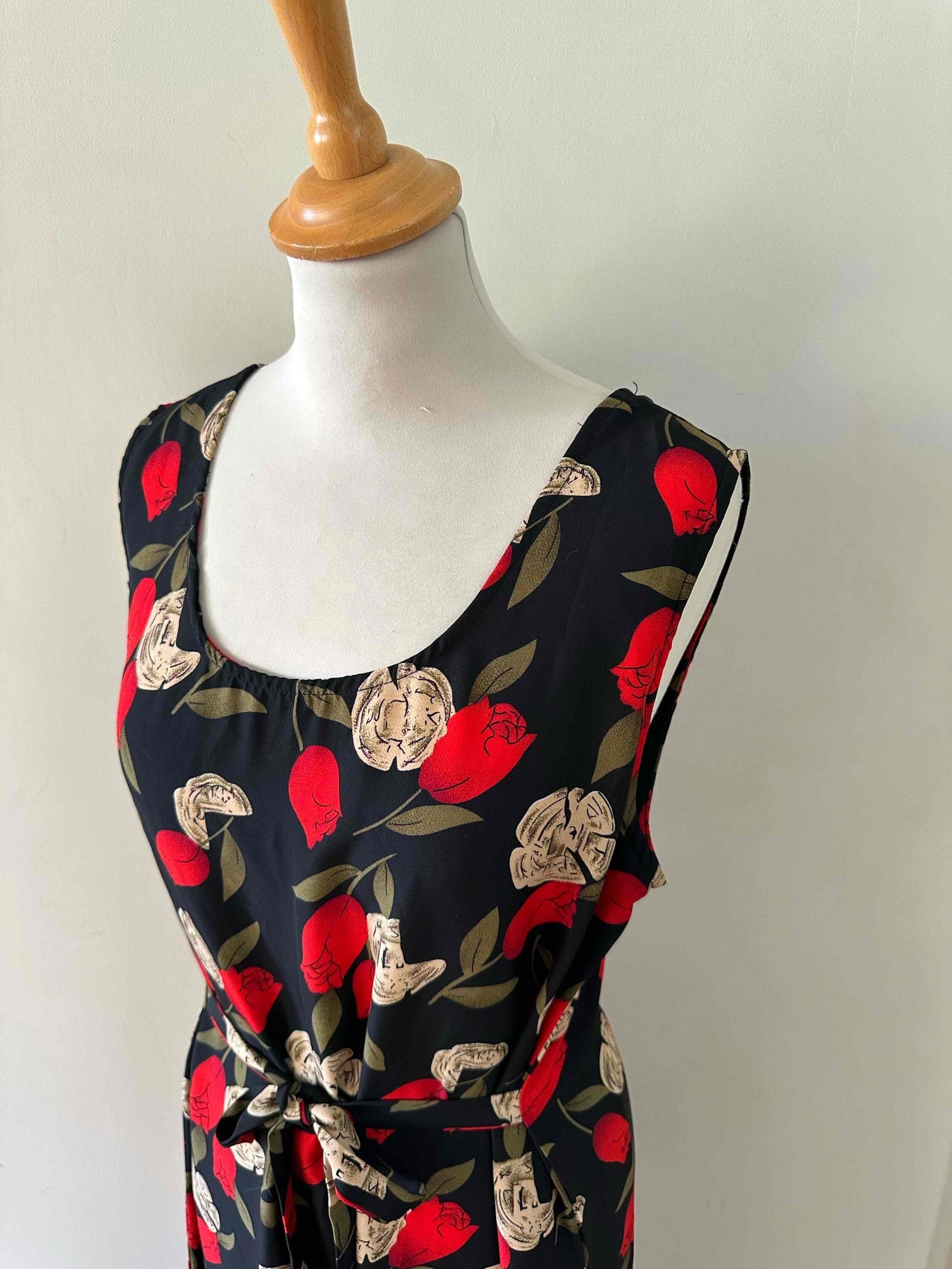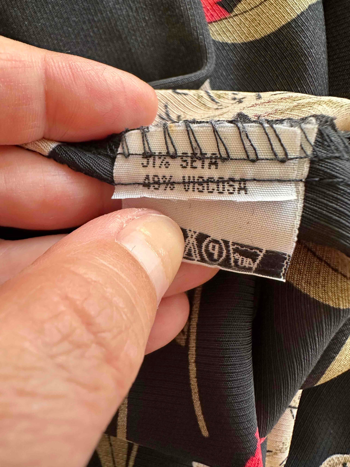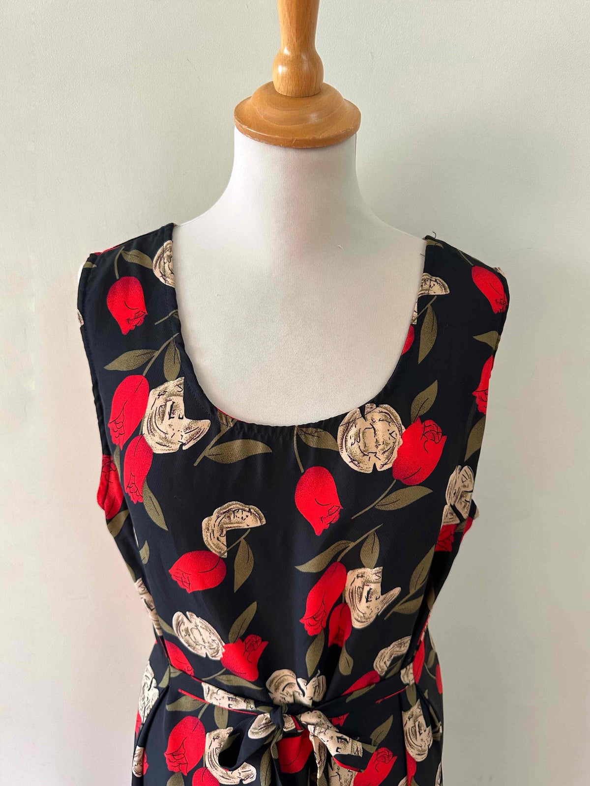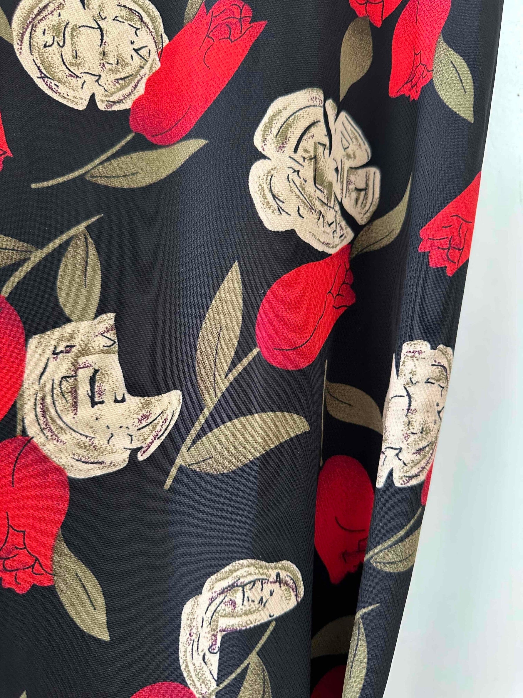 Prix unitaire parRobe nuisette à fleurs, en soie et viscose noire imprimée de fleurs rouges, blanches et vertes. Forme droite trois trous à nouer devant ou dos, fendue sur les deux côtés.