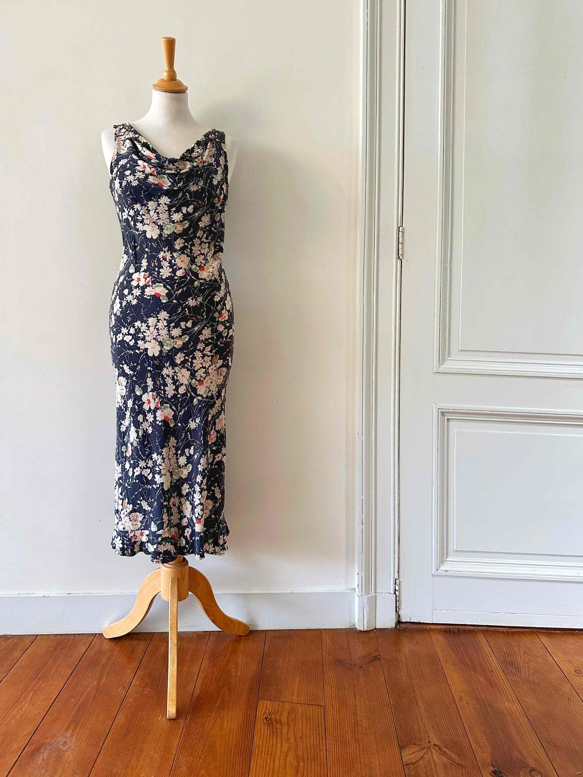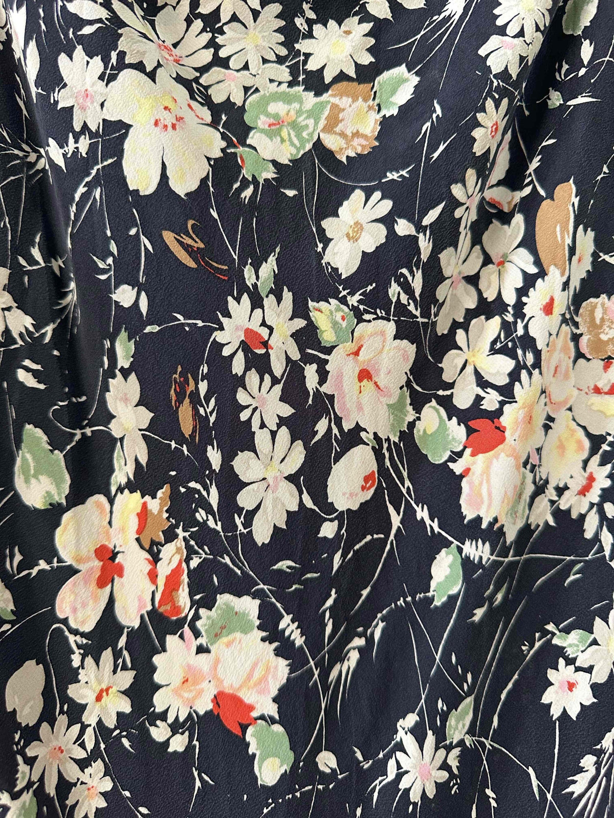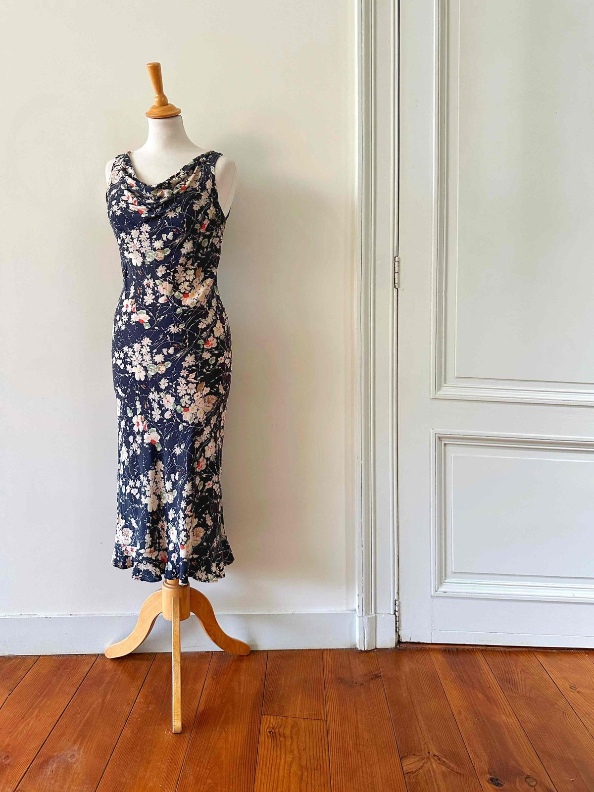 Prix unitaire parRobe nuisette en soie à fleurs, en soie noire imprimée fleurs multicolores. Encolure drapée bénitier, taillée en biais, fabriquée en France, taille 36 portée ici sur un mannequin T36, aisselles 43cm.