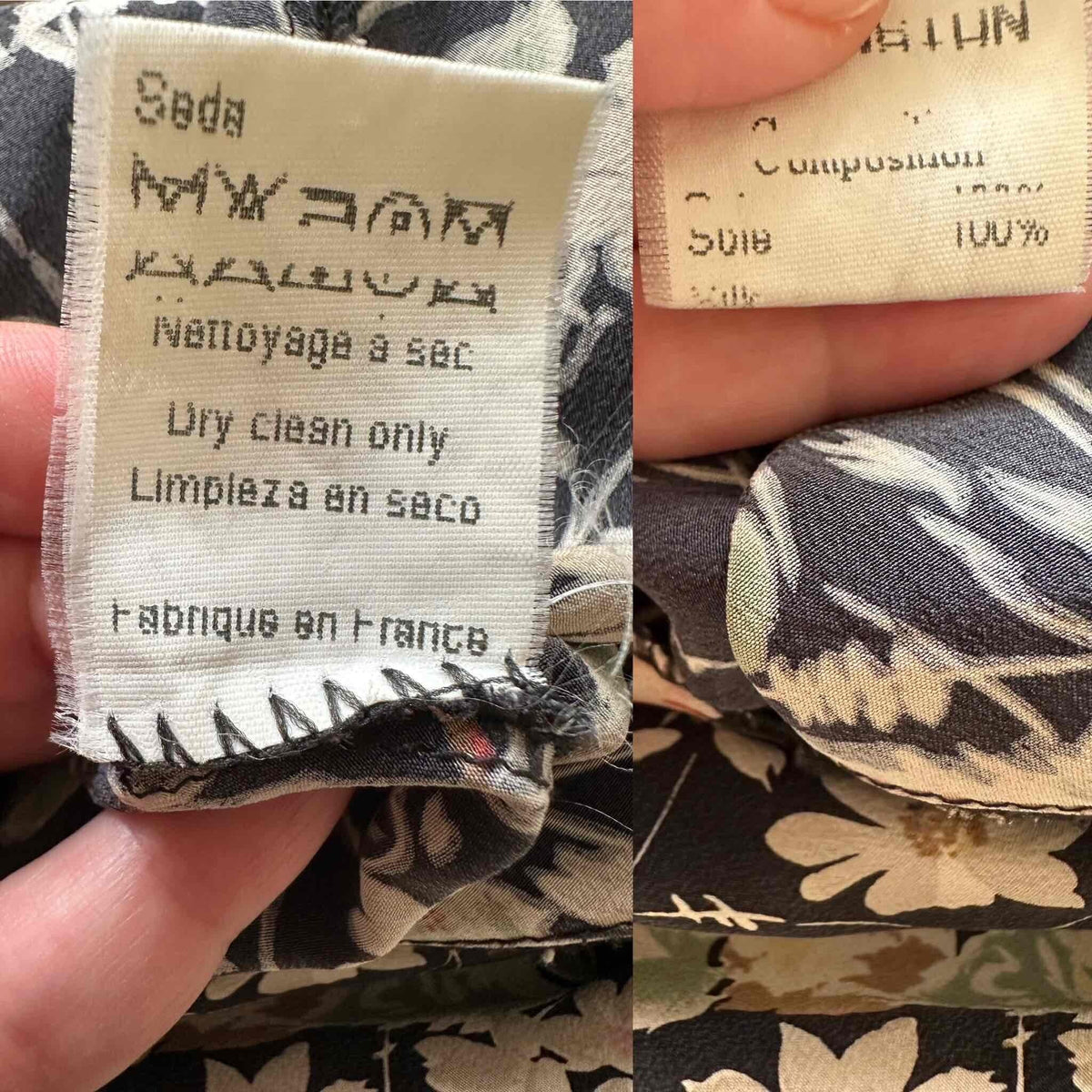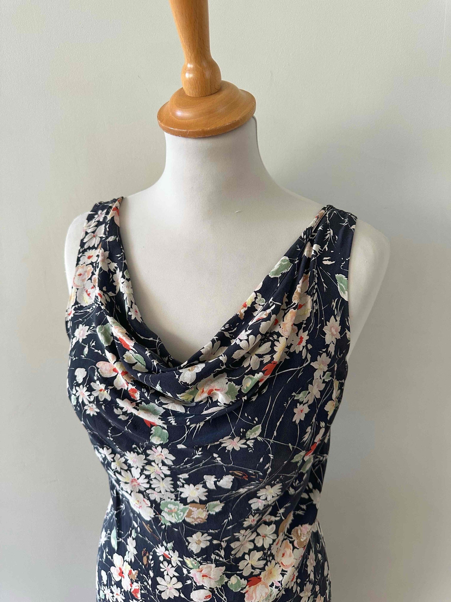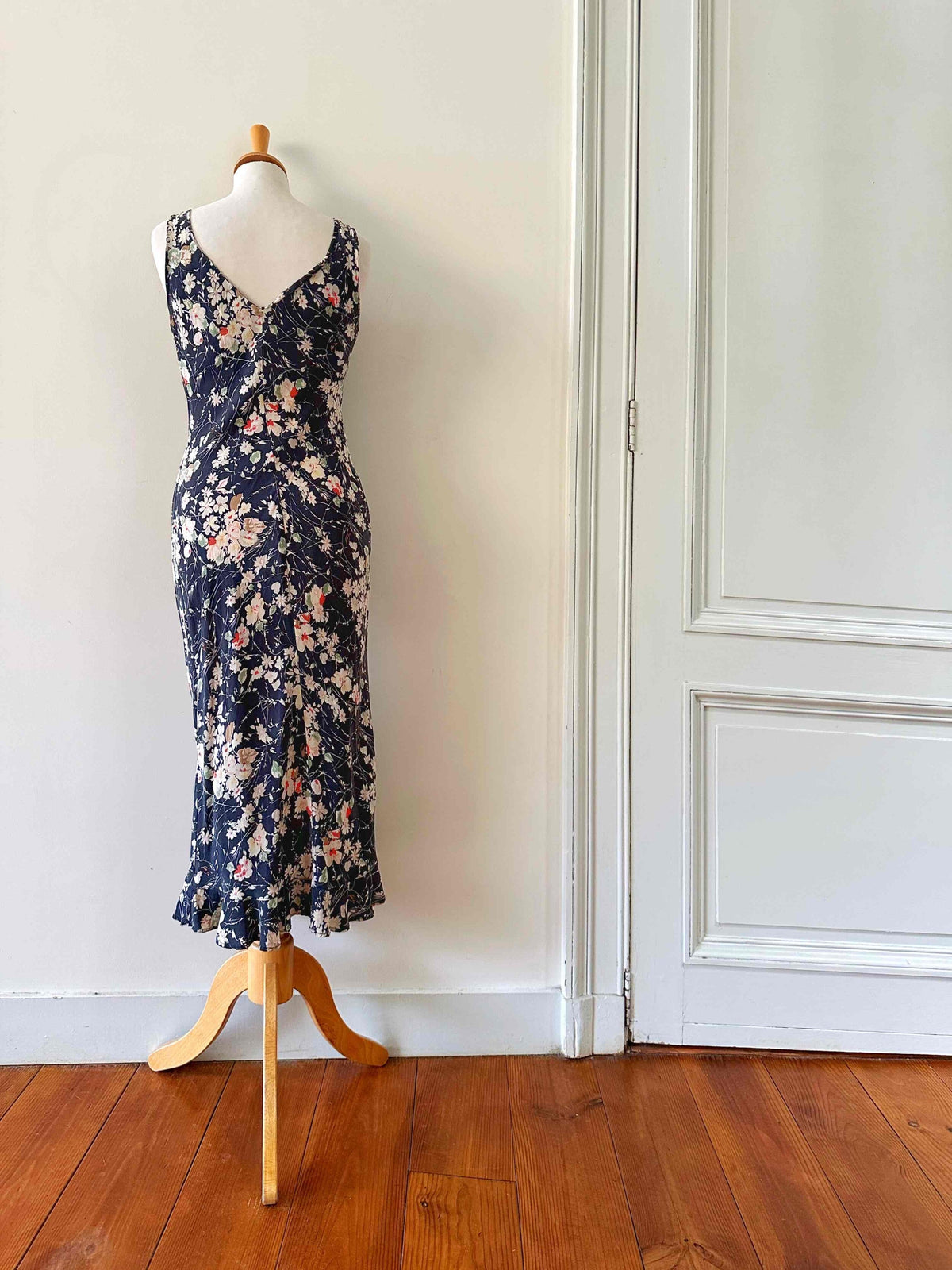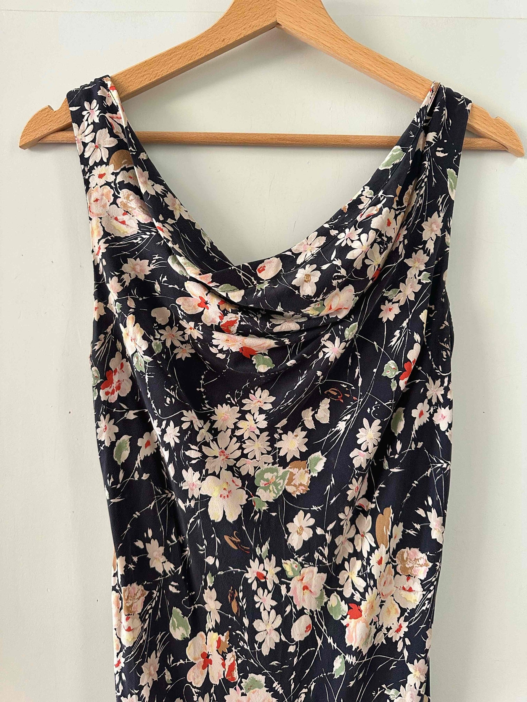 Prix unitaire parRobe nuisette en soie à fleurs, en soie noire imprimée fleurs multicolores. Encolure drapée bénitier, taillée en biais, fabriquée en France, taille 36 portée ici sur un mannequin T36, aisselles 43cm.