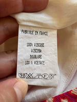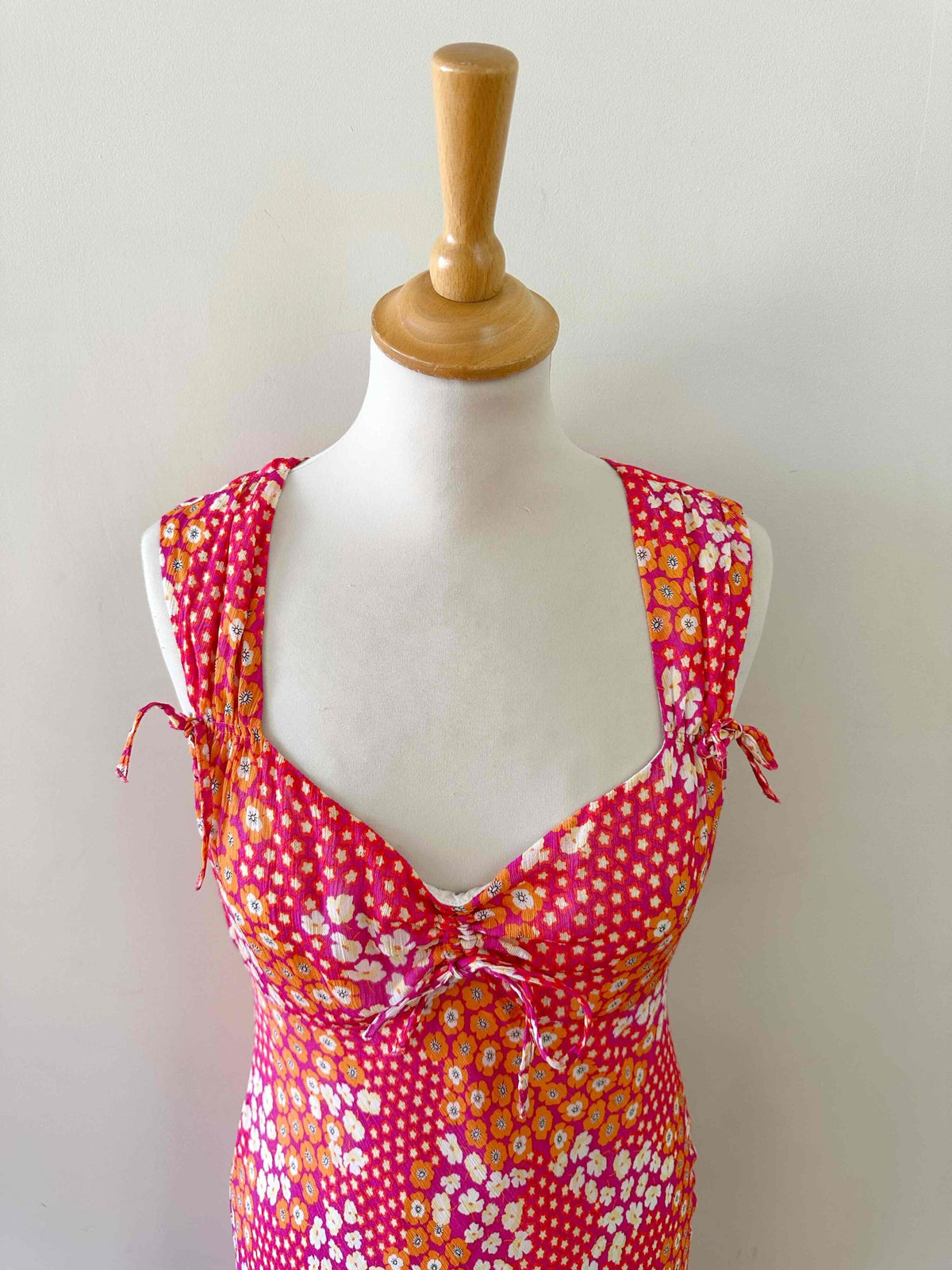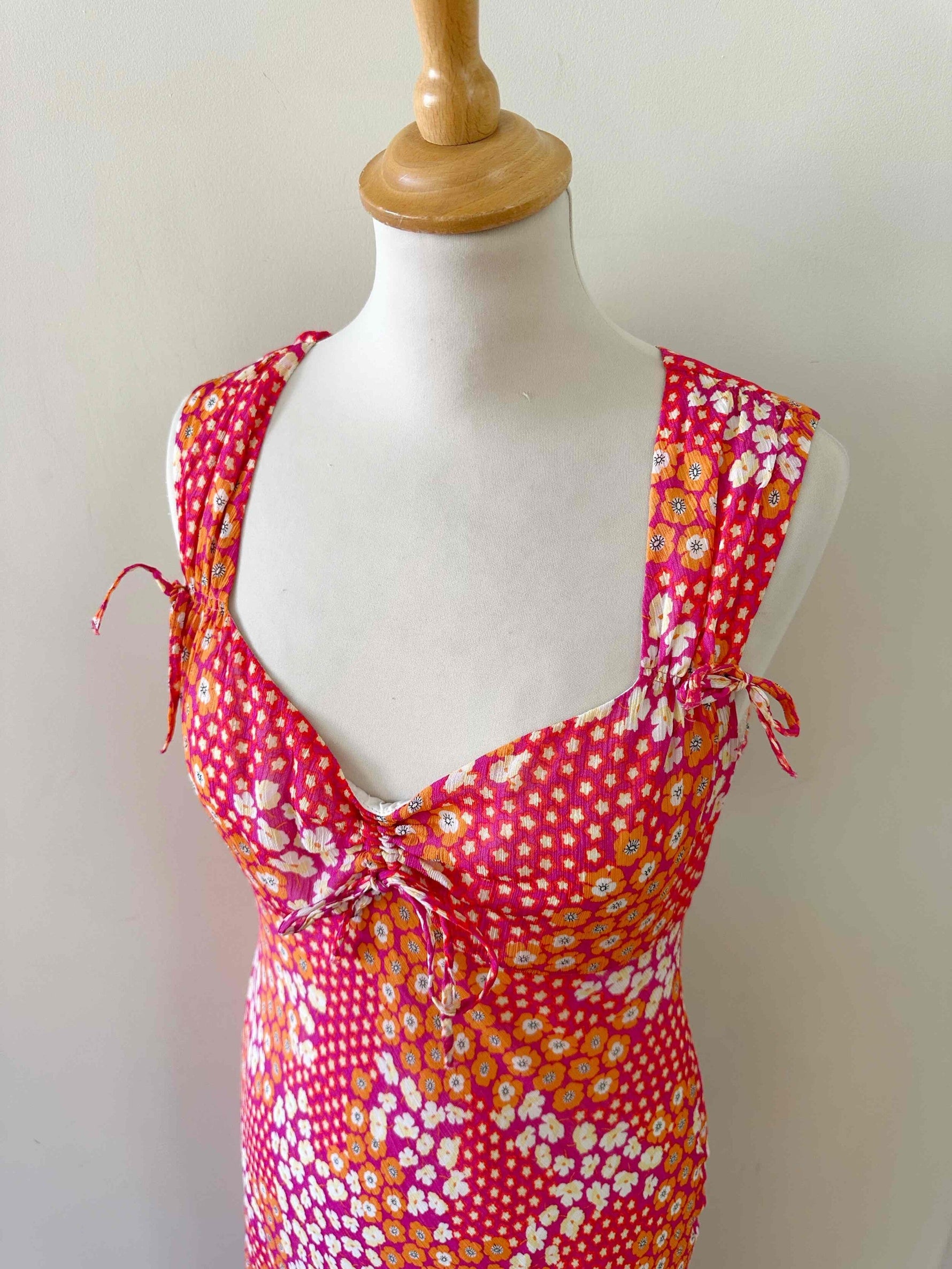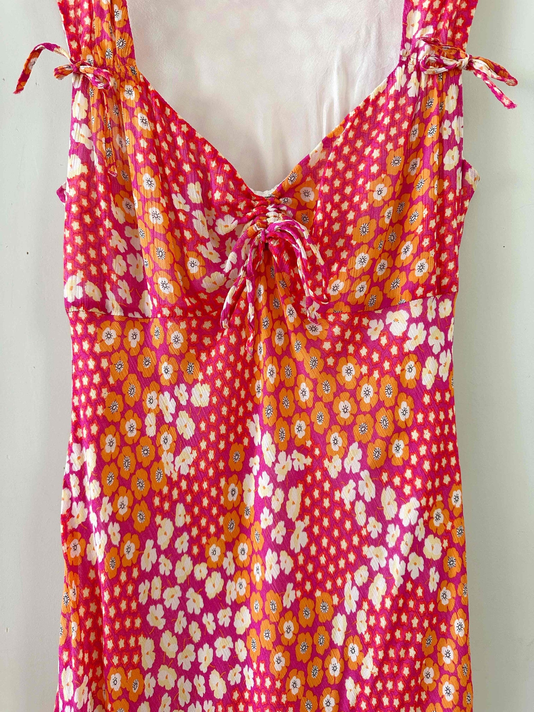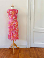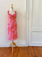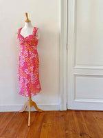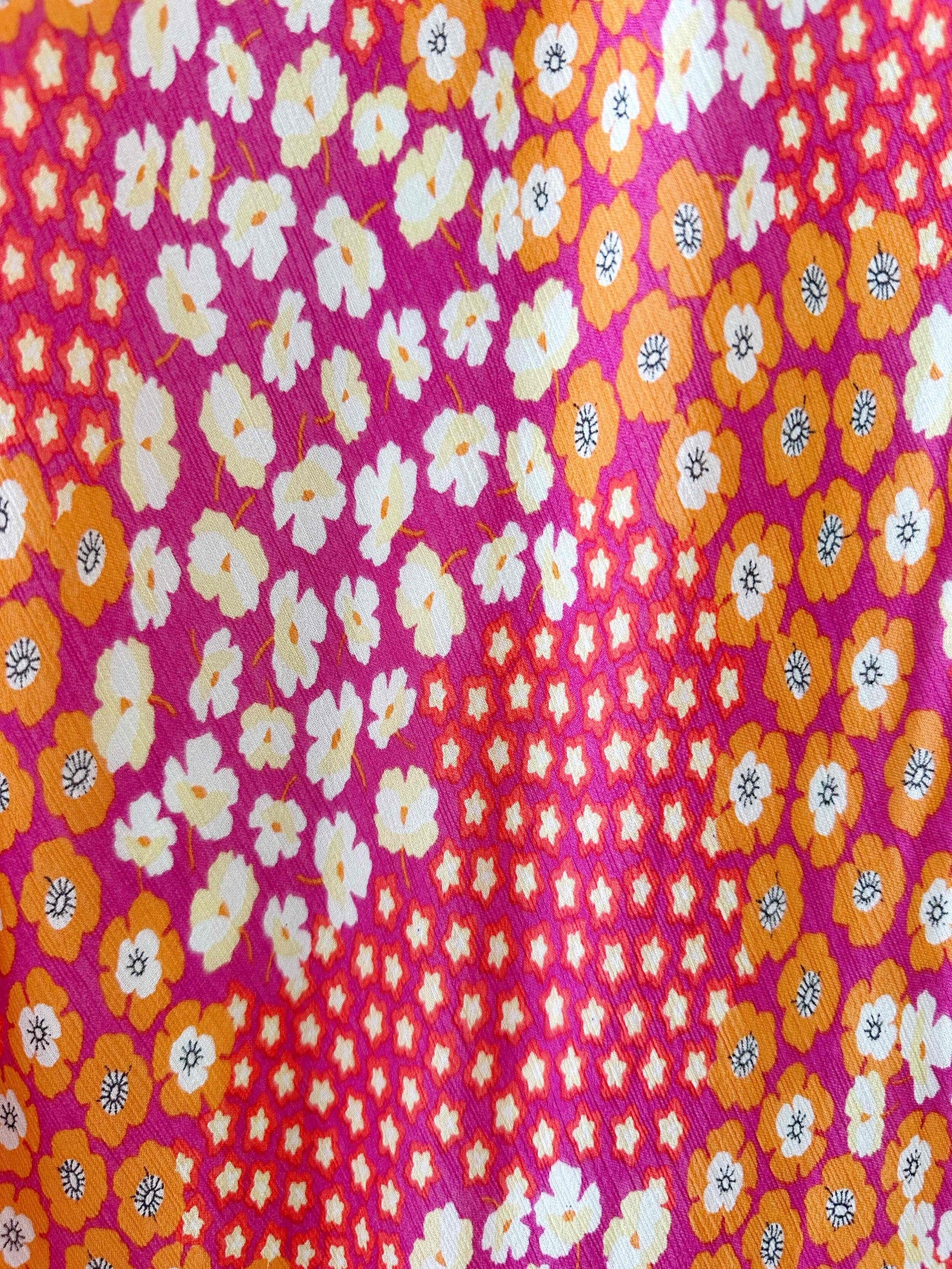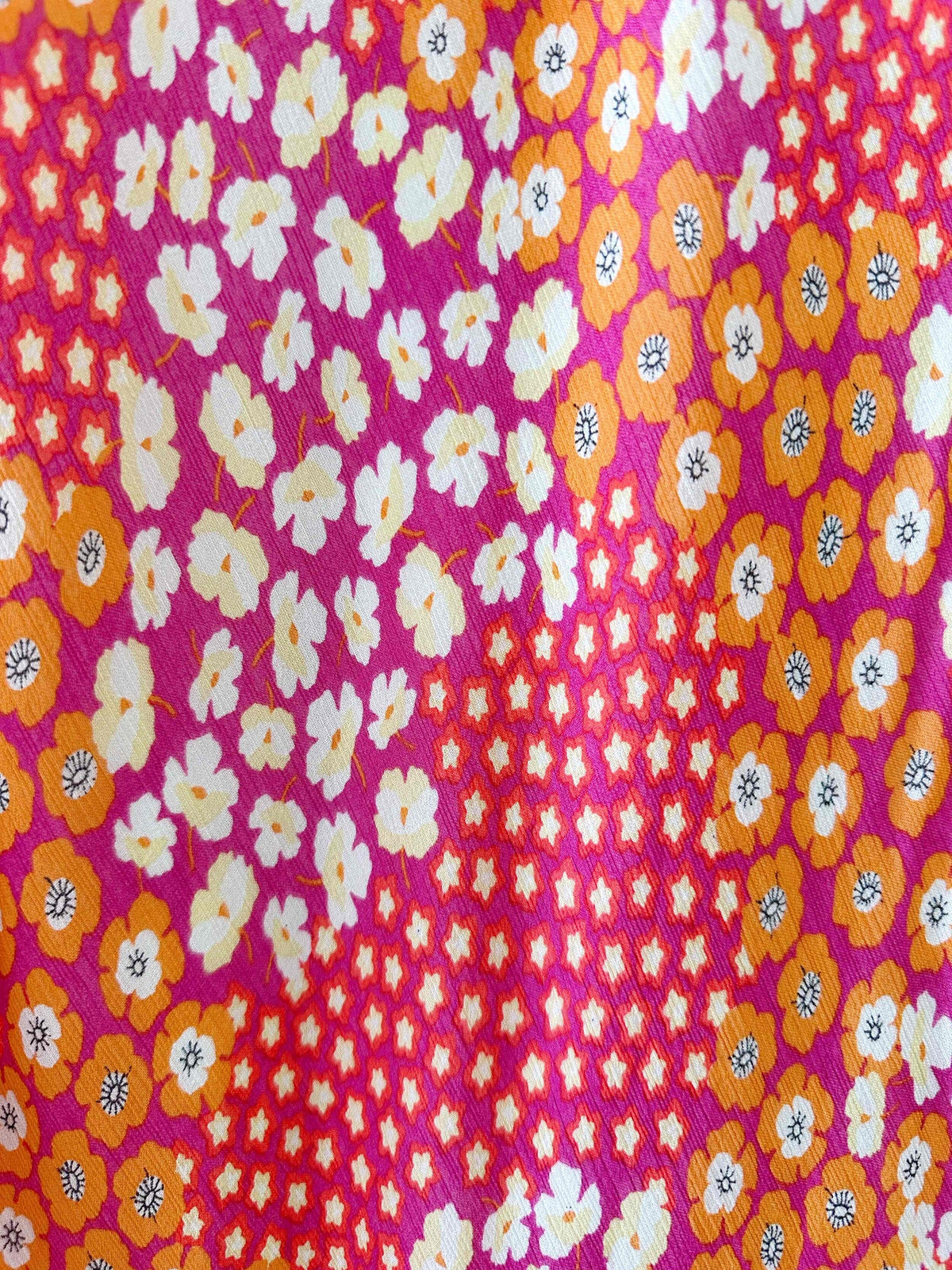 Prix unitaire parRobe nuisette à fleurs, en voile viscose crépon plissé, imprimée motifs fleurs seventies en patchwork rouges, rose fuchsia et oranges.