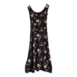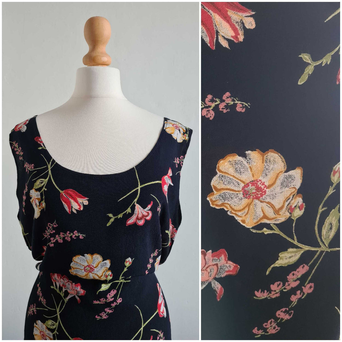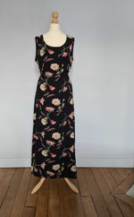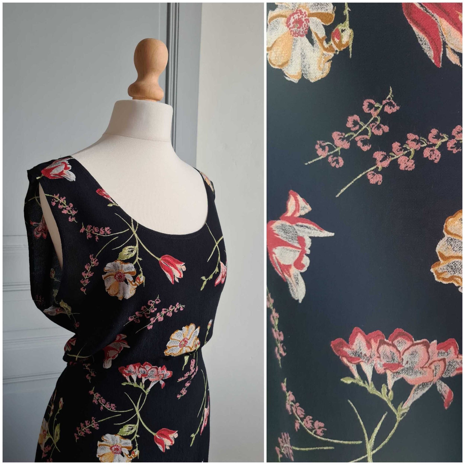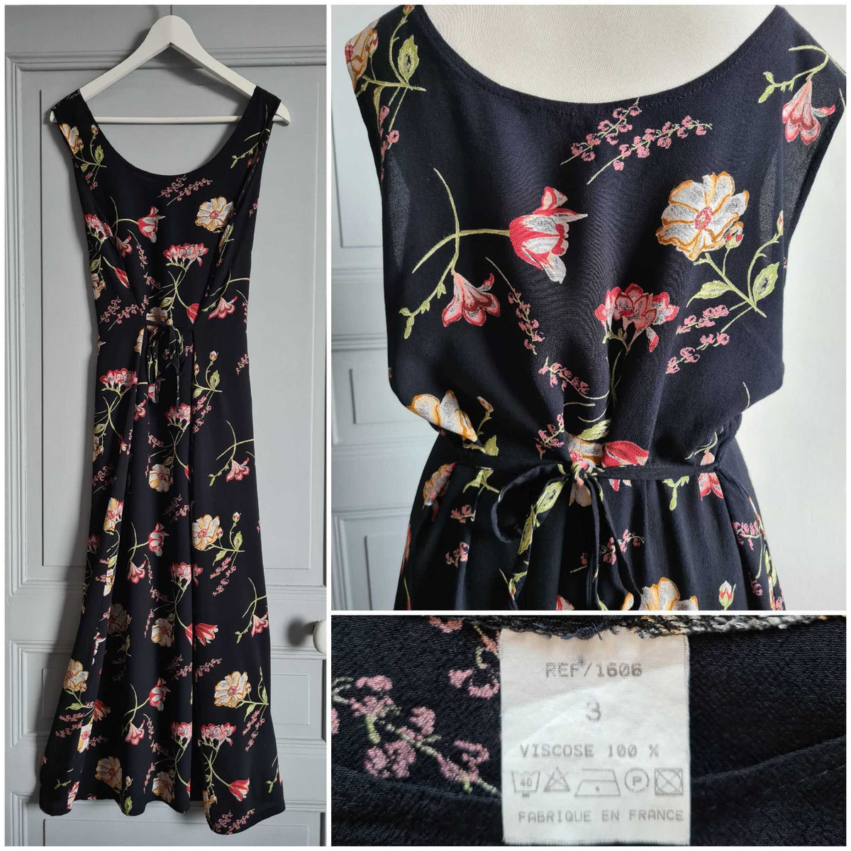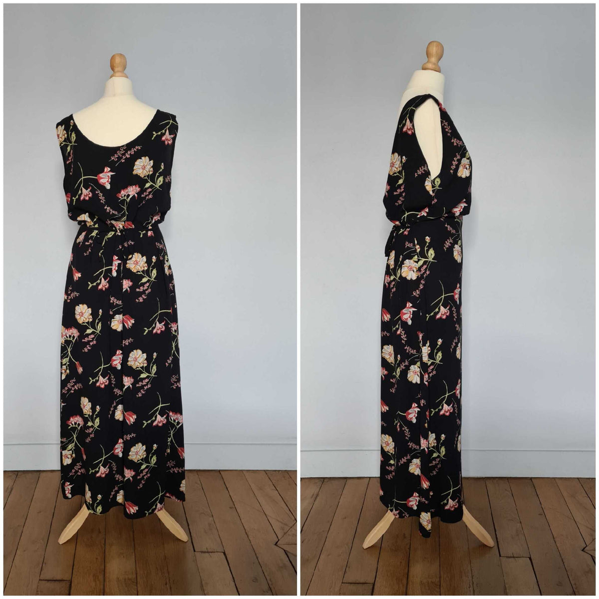 Prix unitaire parRobe longue noire à fleurs anémones et tulipes tons chauds, coupe fluide en viscose avec lien pour resserrer à l'arrière. Fabriquée en France. Poitrine 48 cm.