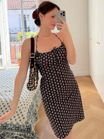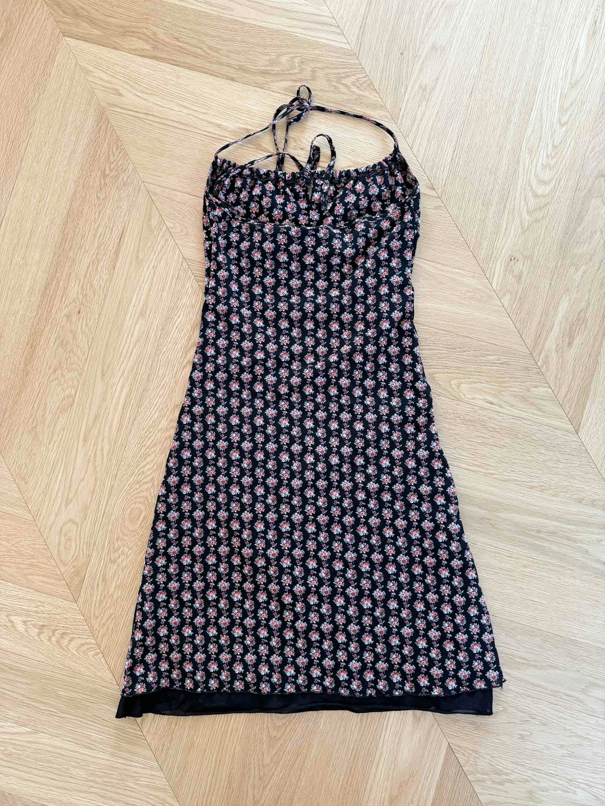 Robe à fleurs, tissu en mesh doublé, lien à nouer derrière le cou, joli décolleté, portée ici sur une T36 pour 1m64