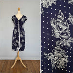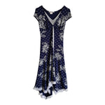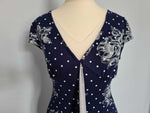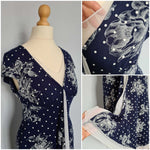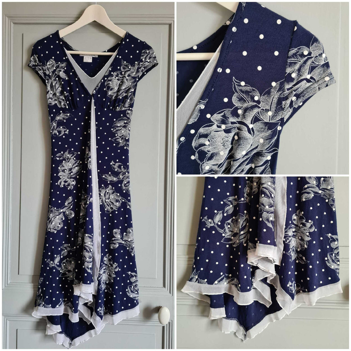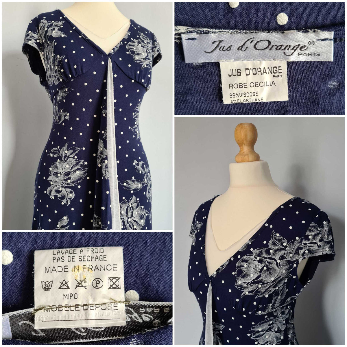 Prix unitaire parRobe marine à pois & motifs fleurs blancs, coupe cintrée, en viscose 96% qui épouse le corps. Mini manches courtes. Ruban voile bordant le décolleté, le long du volant central et à la base. Longueur irrégulière, arrière plus long en pointe. Article made in France.