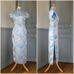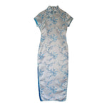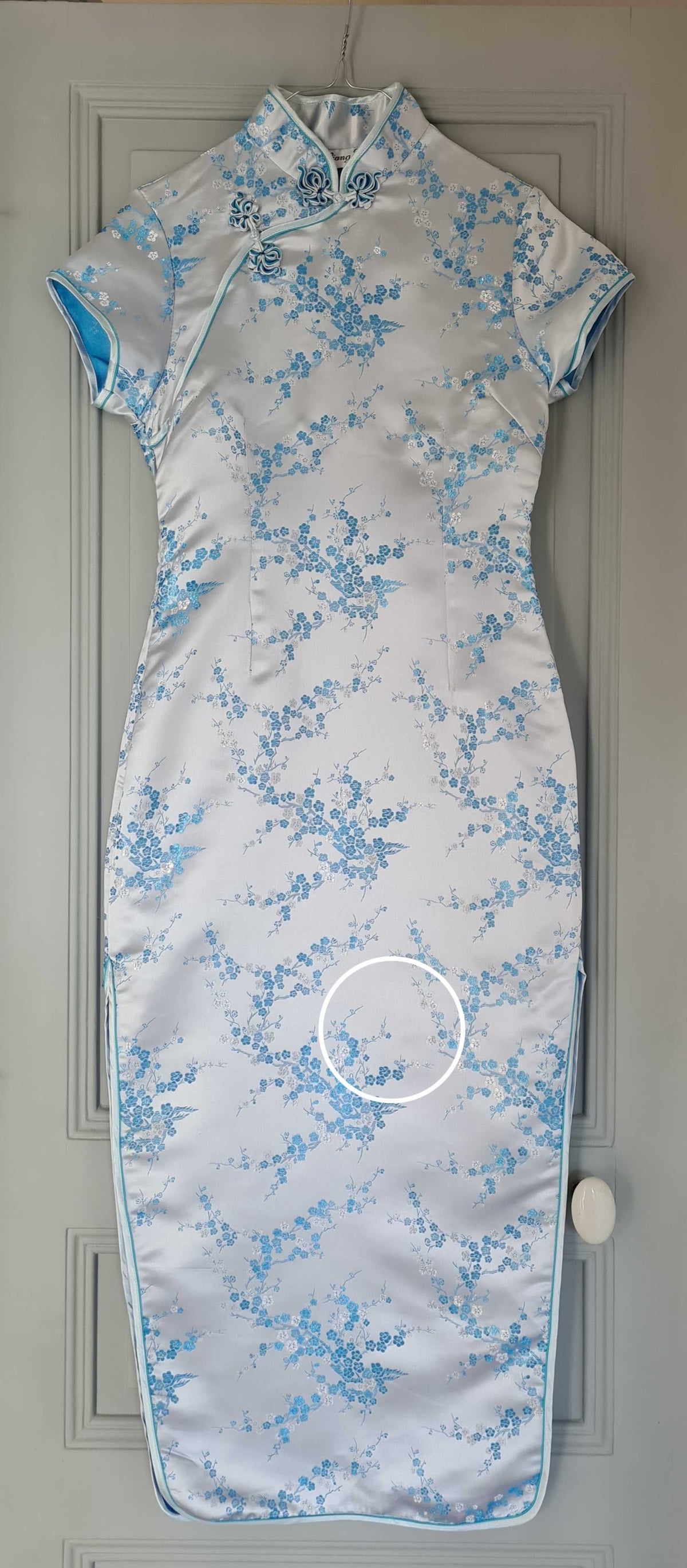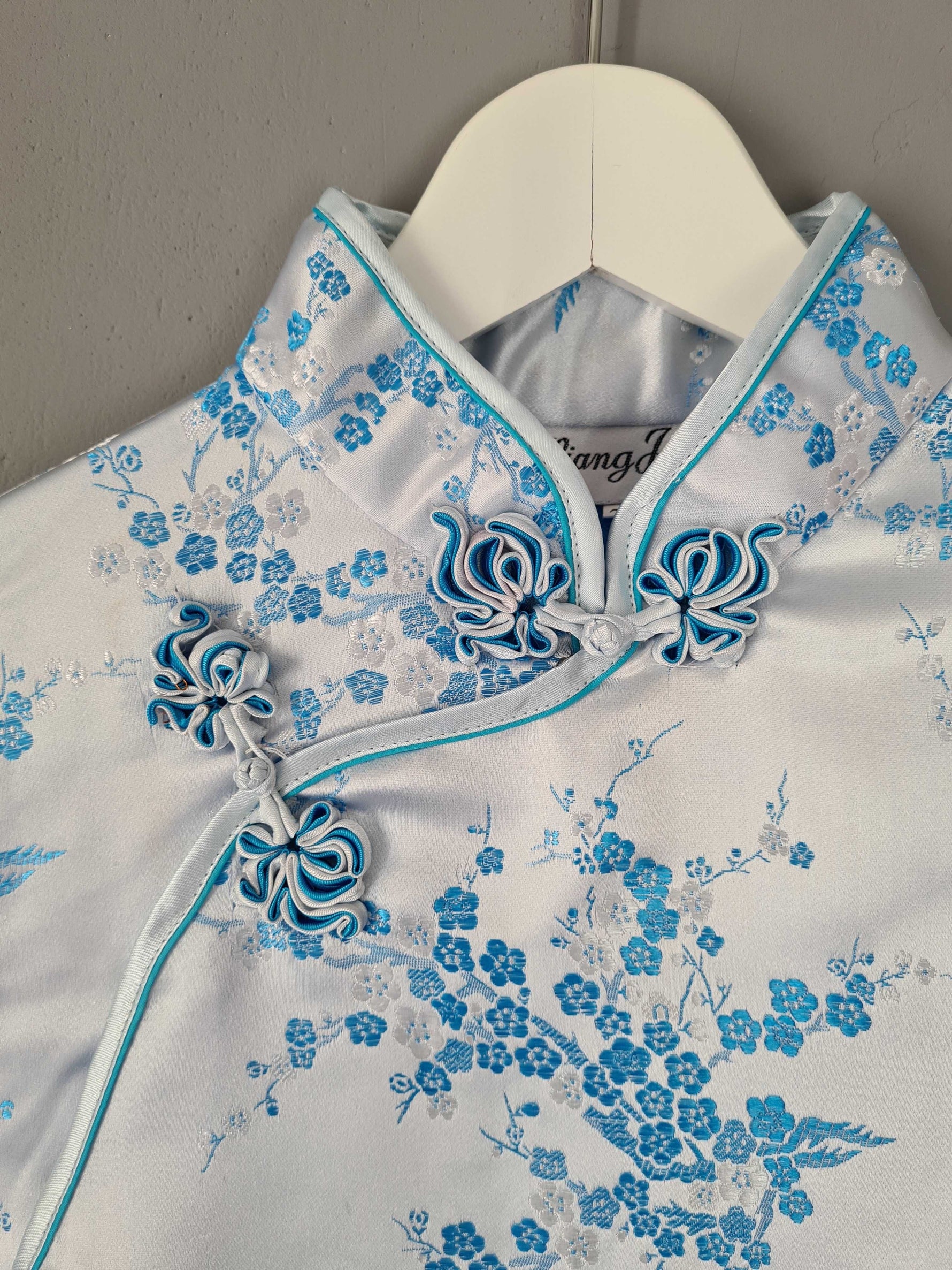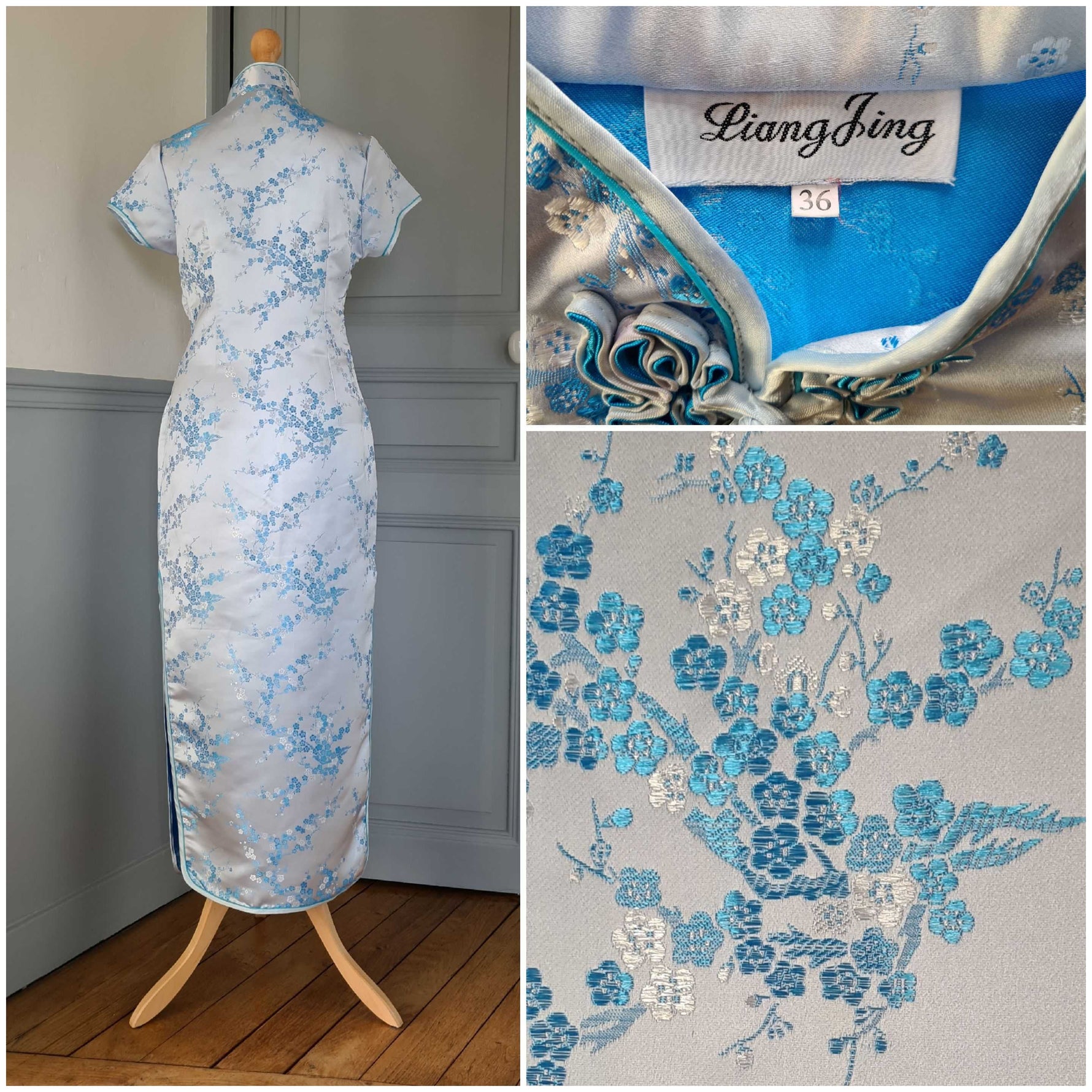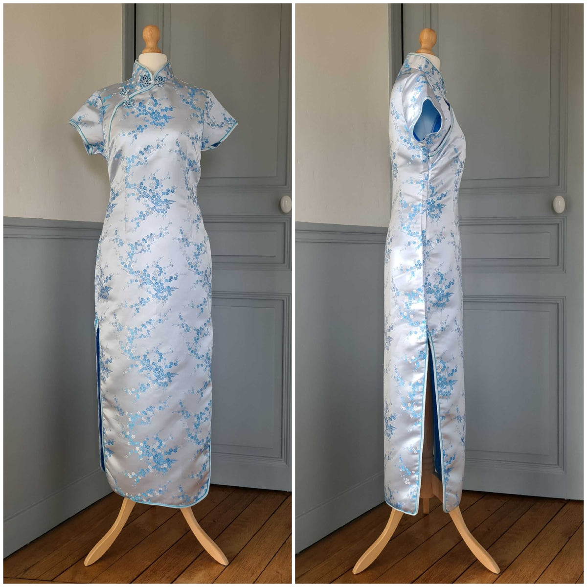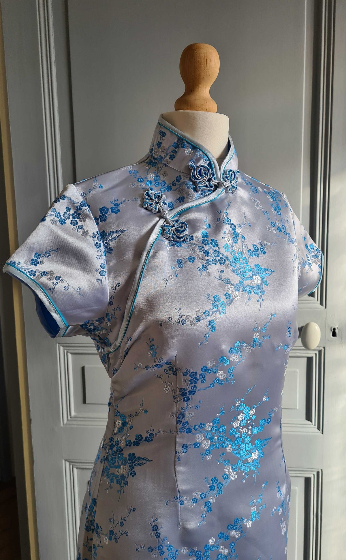 Prix unitaire parRobe asiatique en satin de soie 80 %, couleur bleu clair argenté, motif fleurs de cerisier, manches courtes, col Mao, corsage pressionné à boutons noeuds, fermeture éclair côté, fentes côté sur 50 cm. Longueur maxi. Convient à une taille 34 ou petit 36.