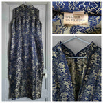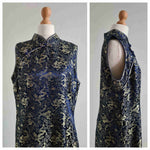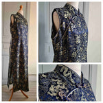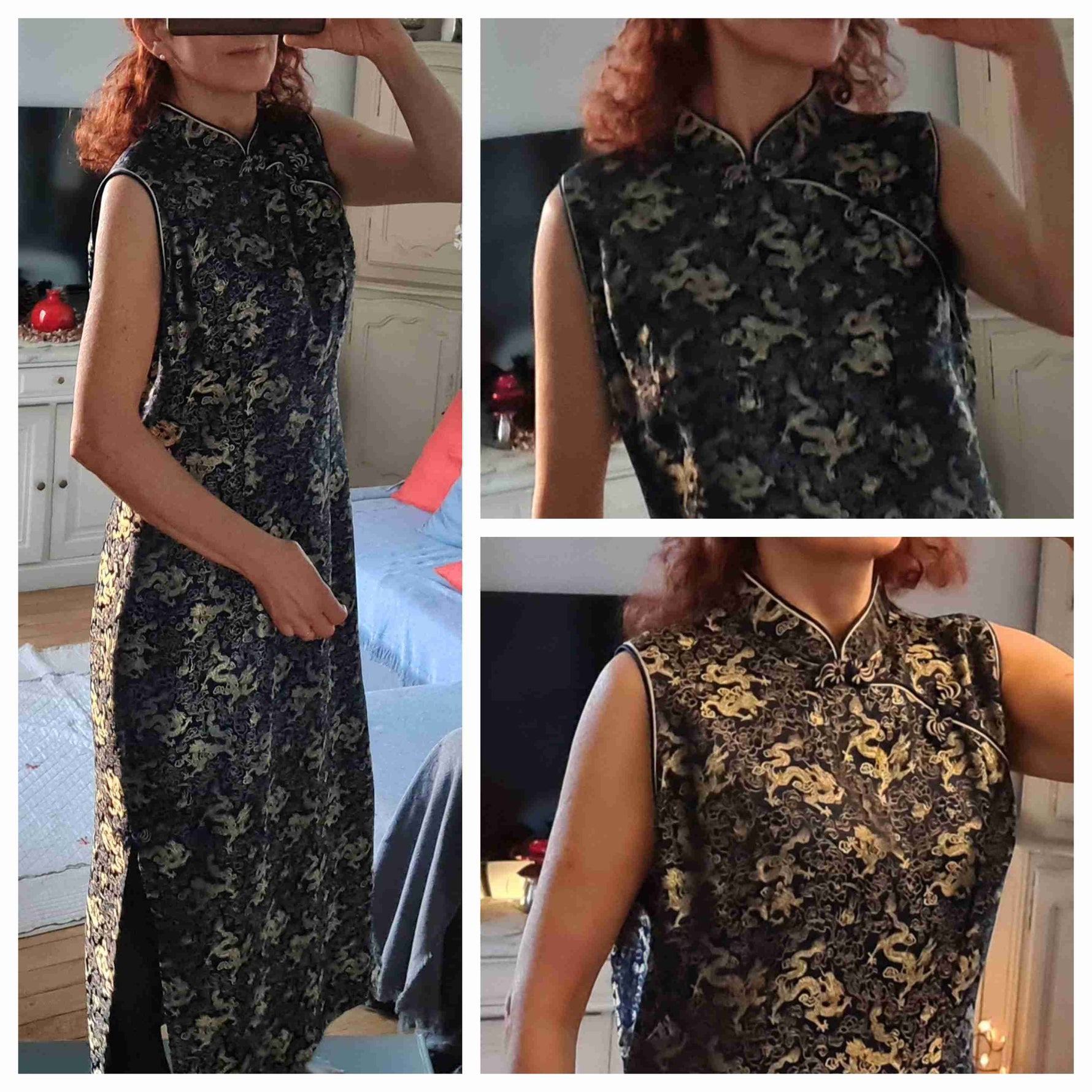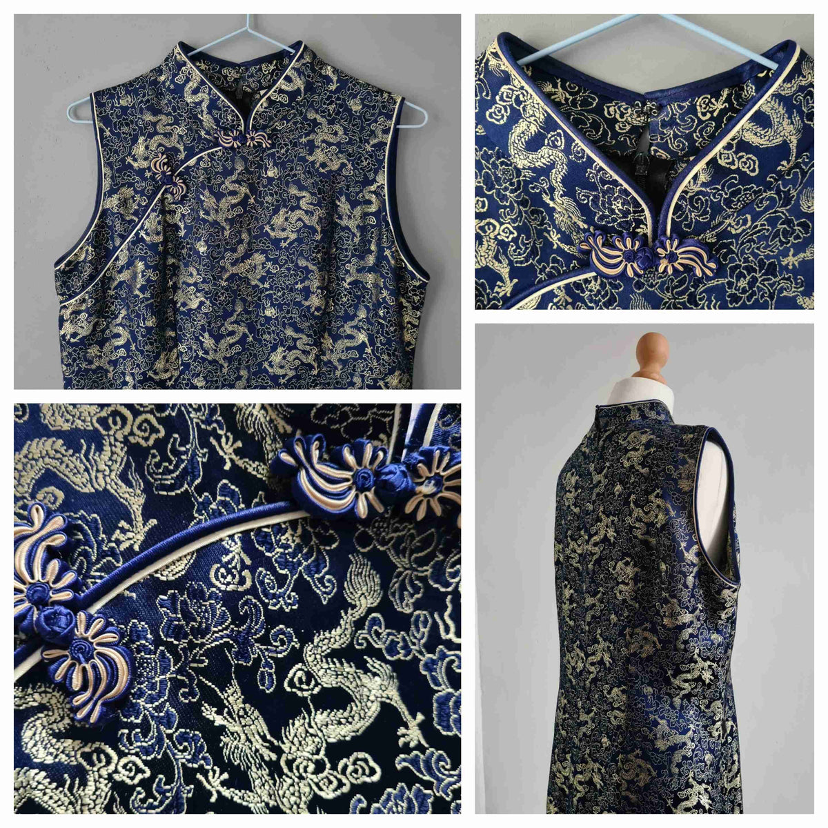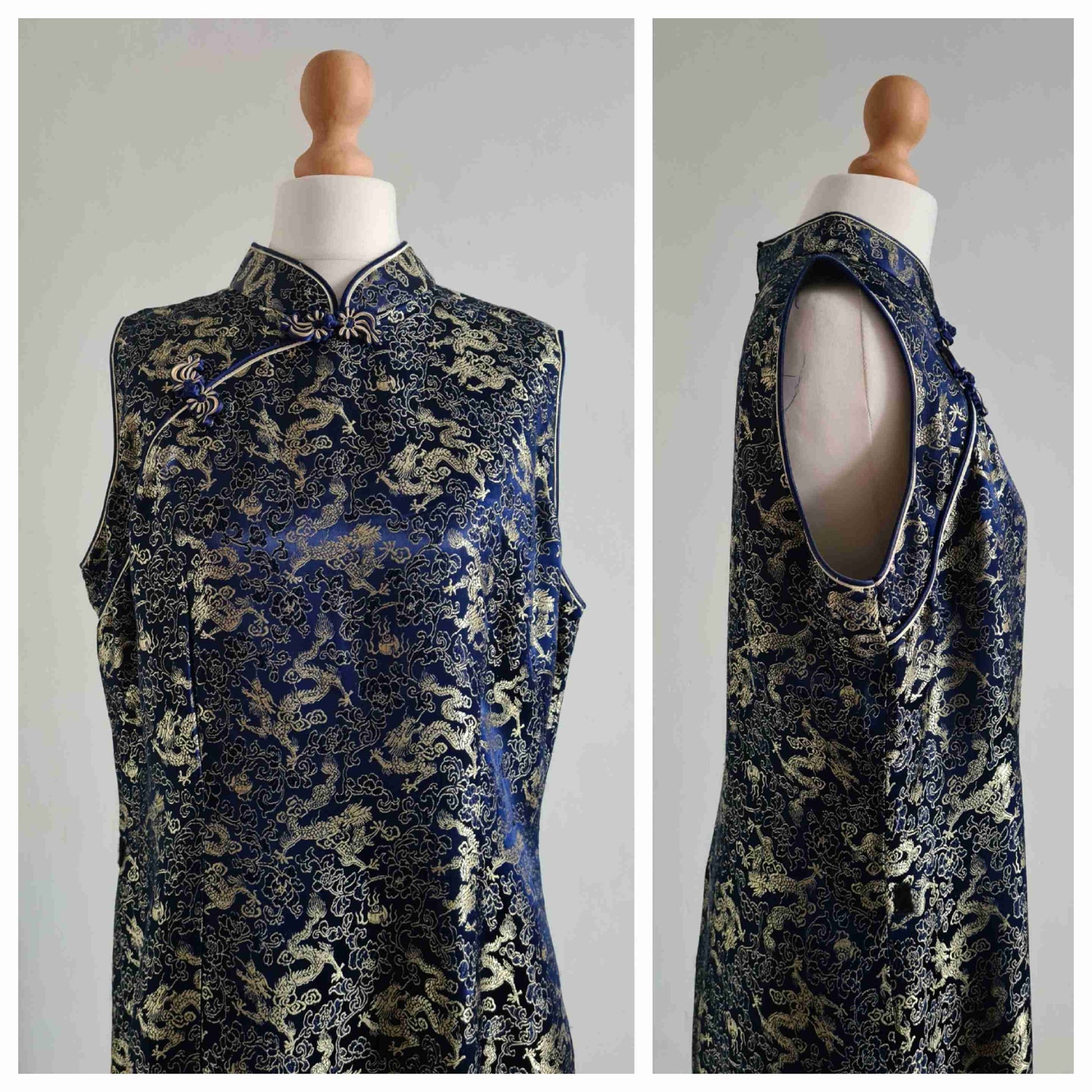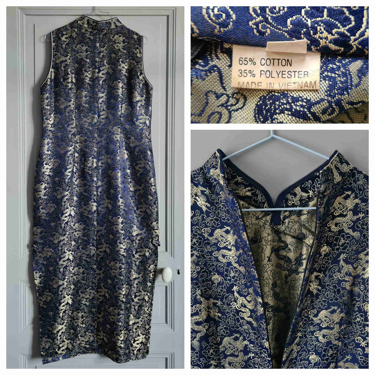 Prix unitaire parRobe asiatique en satin bleu marine, motif fleurs et dragons dorés, sans manches, col Mao, boutons-noeuds fixes, fermeture éclair au dos, longueur maxi, grandes fentes côtés (45 cm). Coton mélangé. Porté sur les photos par une taille 36. Fabriquée au Vietnam. Poitrine 51 cm