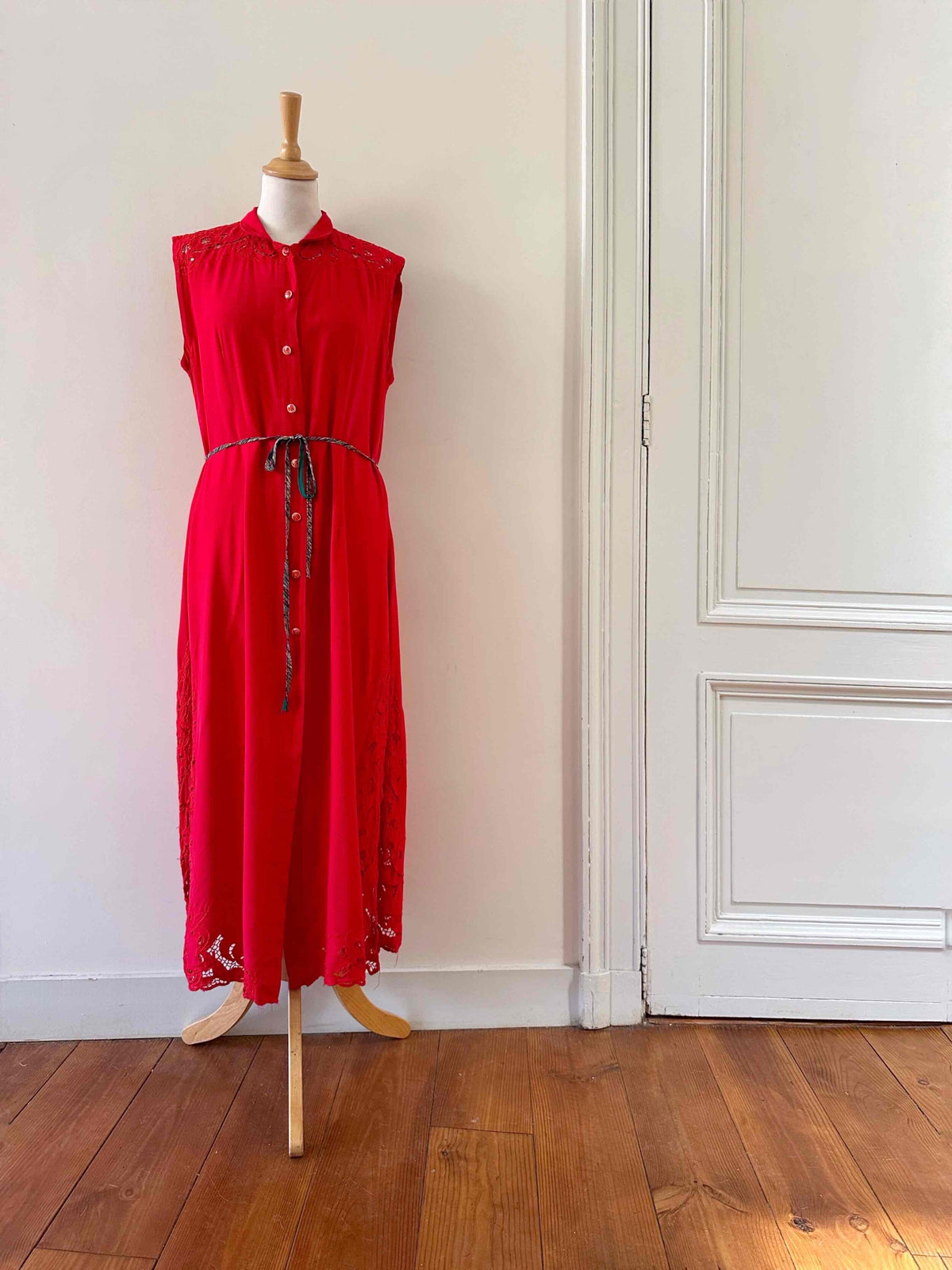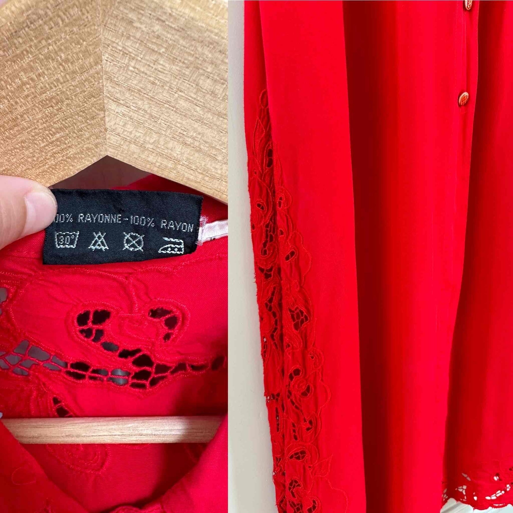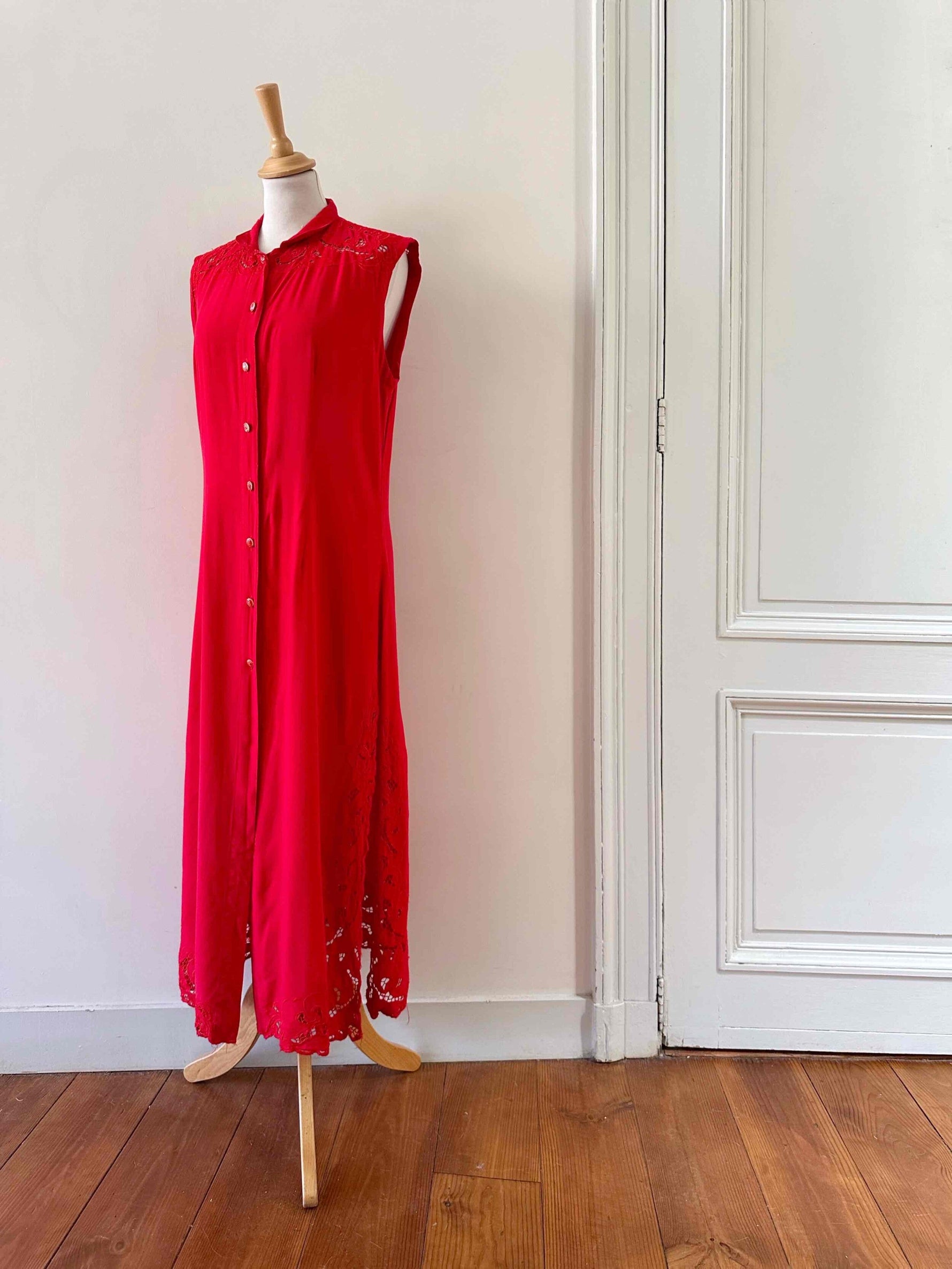 Prix unitaire parRobe chemise brodée, en viscose rouge vermillon, épaules et tout le bas ajourés de broderies anglaises florales, fendues sur les côtés, petit col Claudine, boutonnée, années 90s, taille 38, portée ici sur un mannequin T36, aisselles 47 cm.