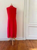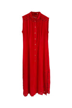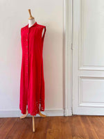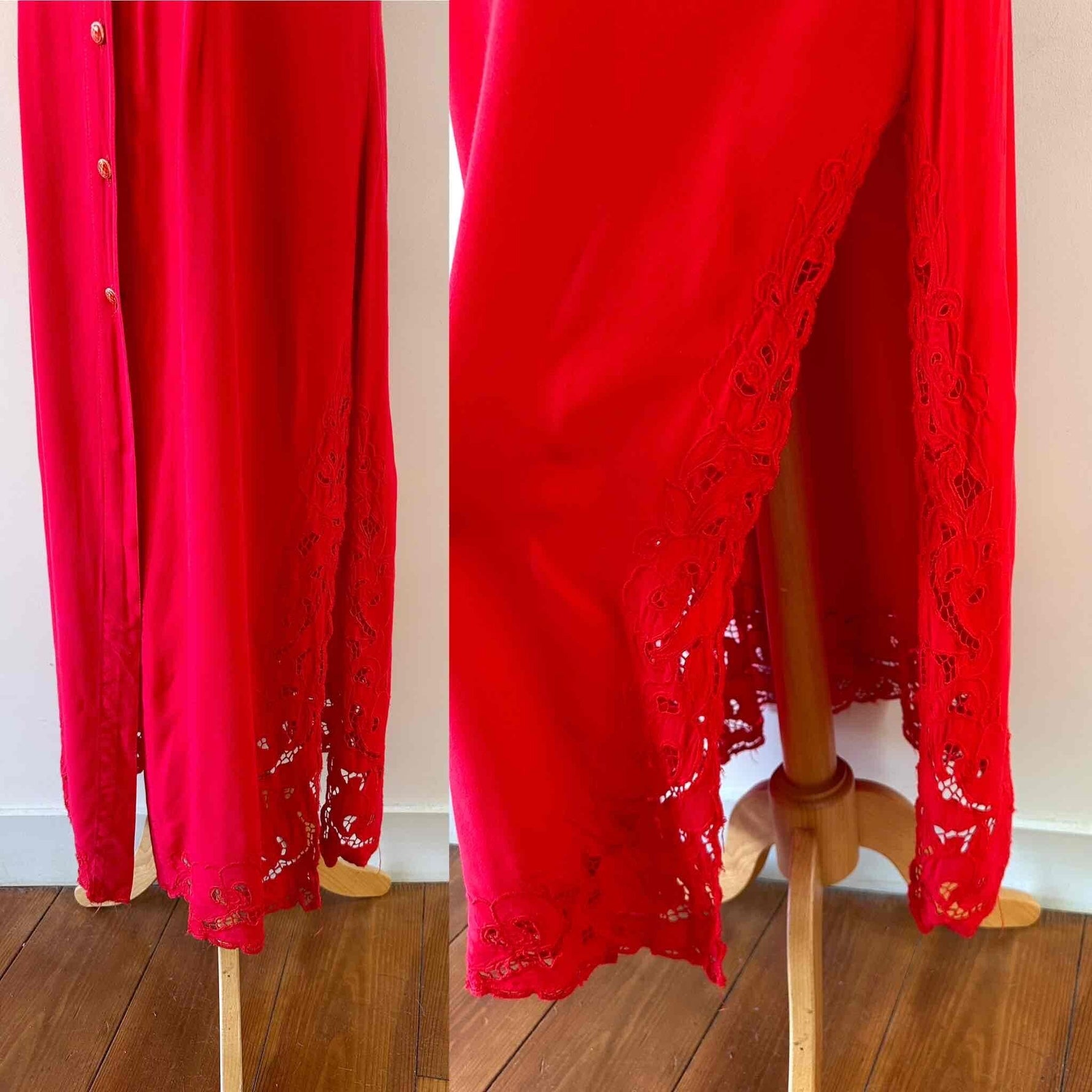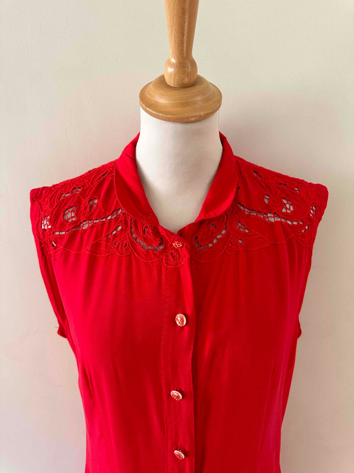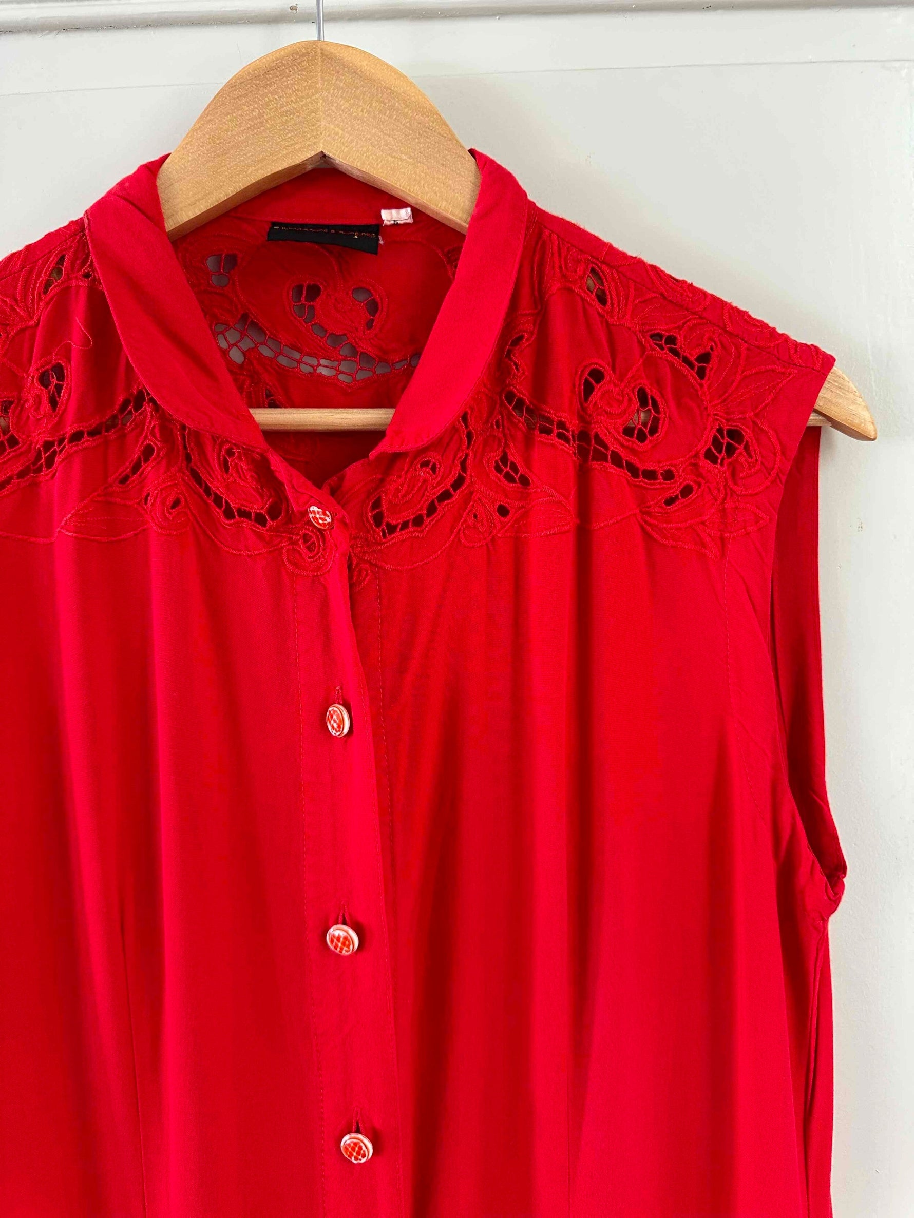 Prix unitaire parRobe chemise brodée, en viscose rouge vermillon, épaules et tout le bas ajourés de broderies anglaises florales, fendues sur les côtés, petit col Claudine, boutonnée, années 90s, taille 38, portée ici sur un mannequin T36, aisselles 47 cm.