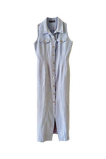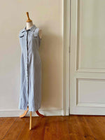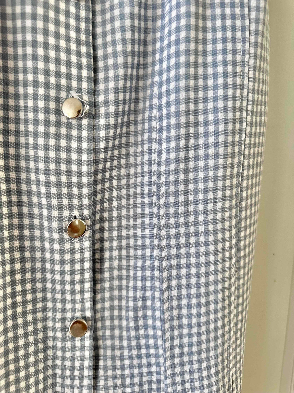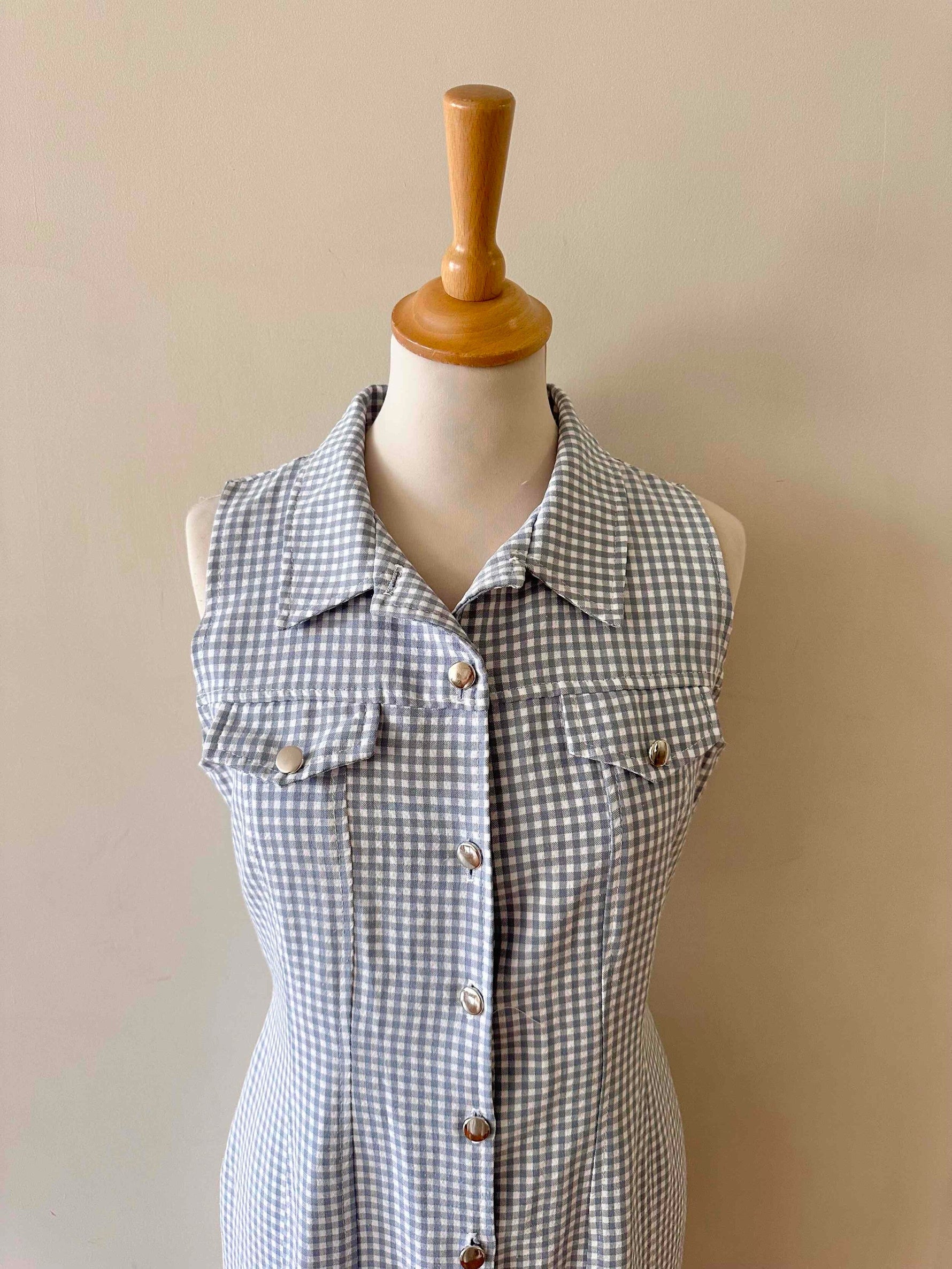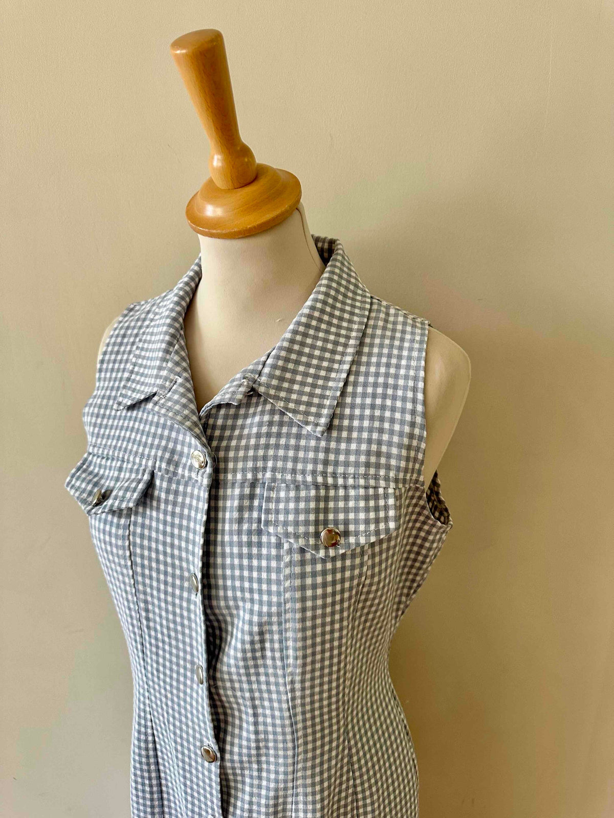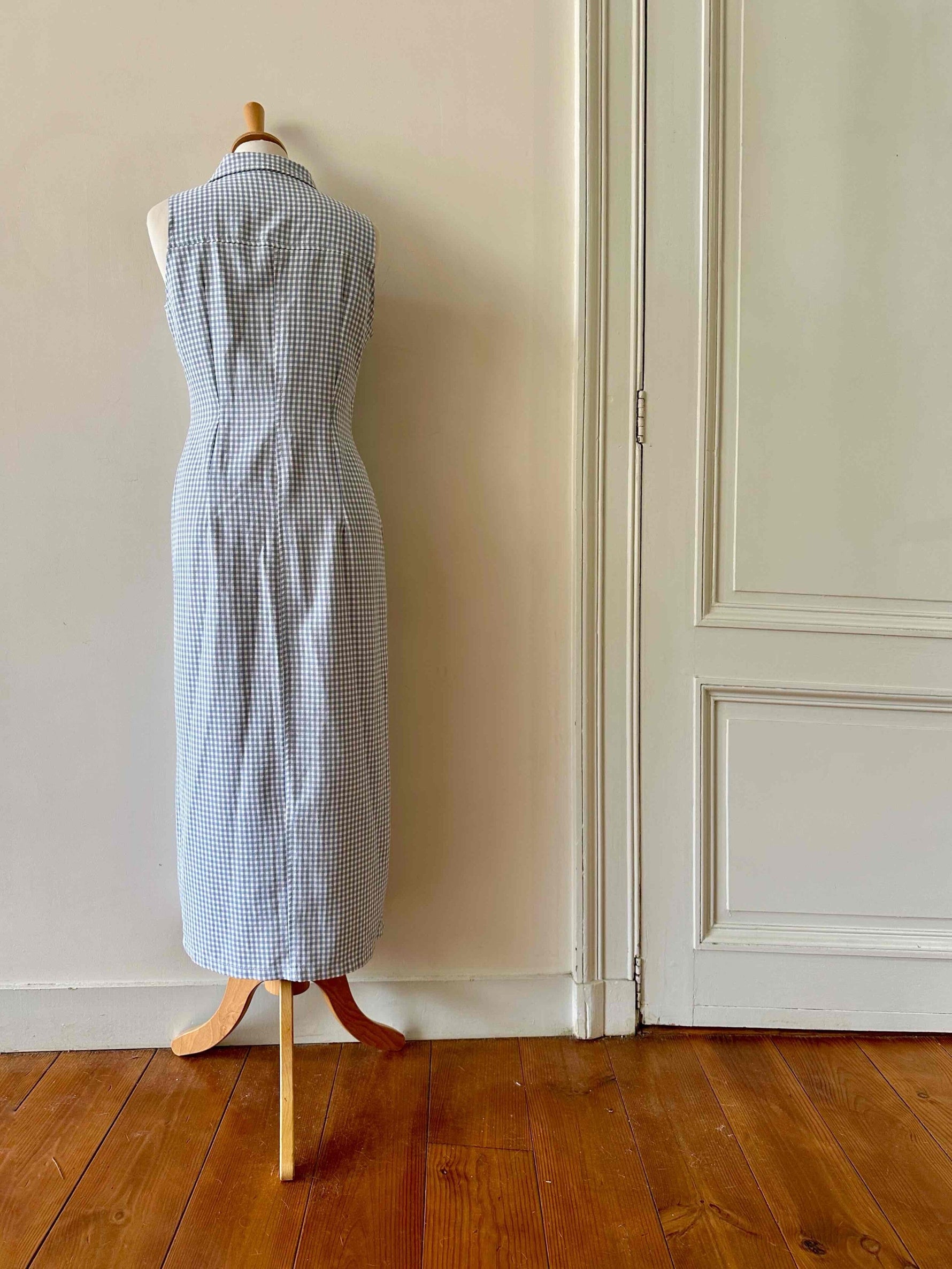 Robe chemise vichy, en viscose mélangée à carreaux vichy bleus ciels et blanc, boutons jeans, sans manches, fabriquée en France, taille 36 portée ici sur un mannequin T36, aisselles 44cm.