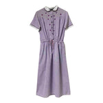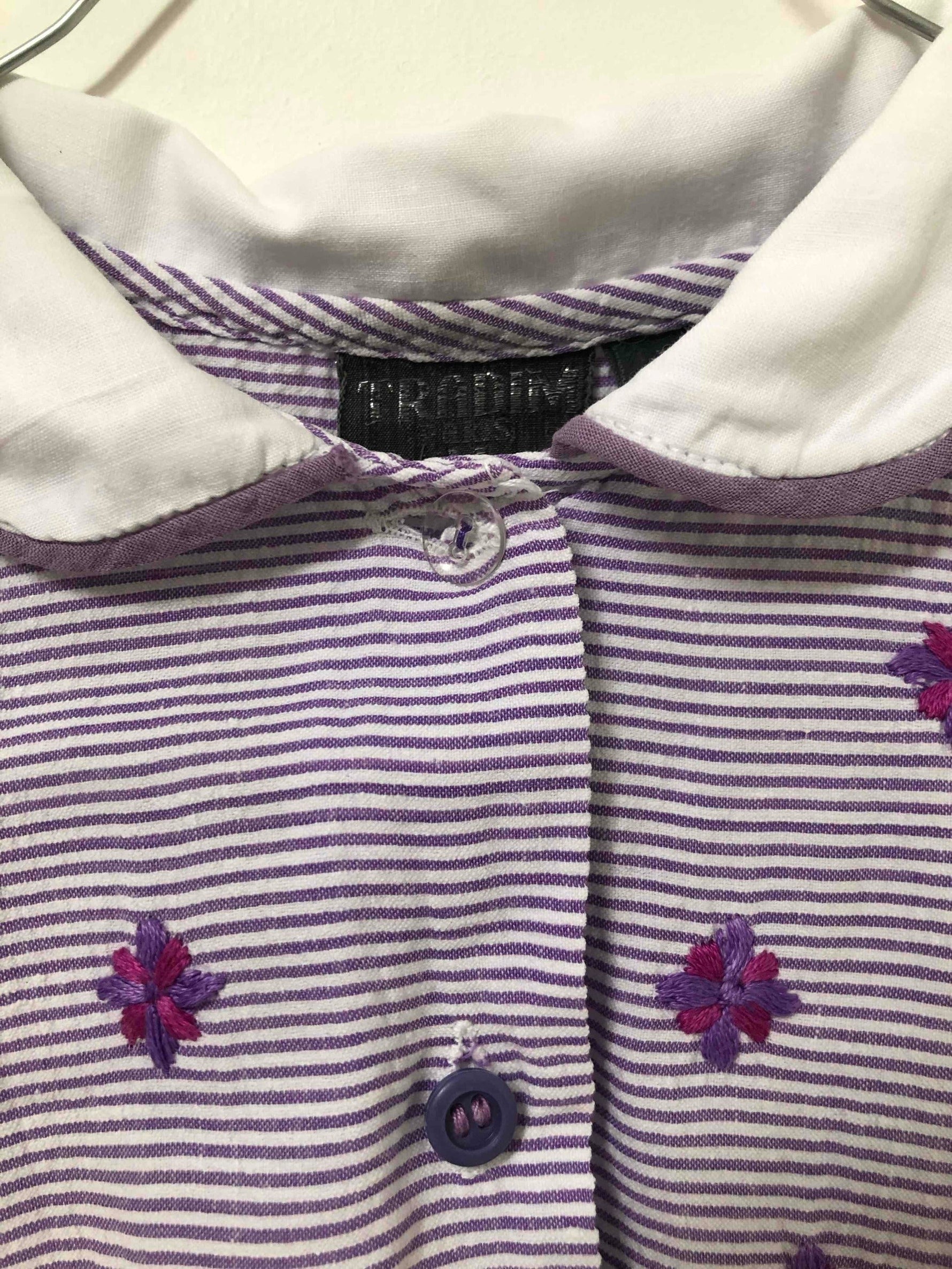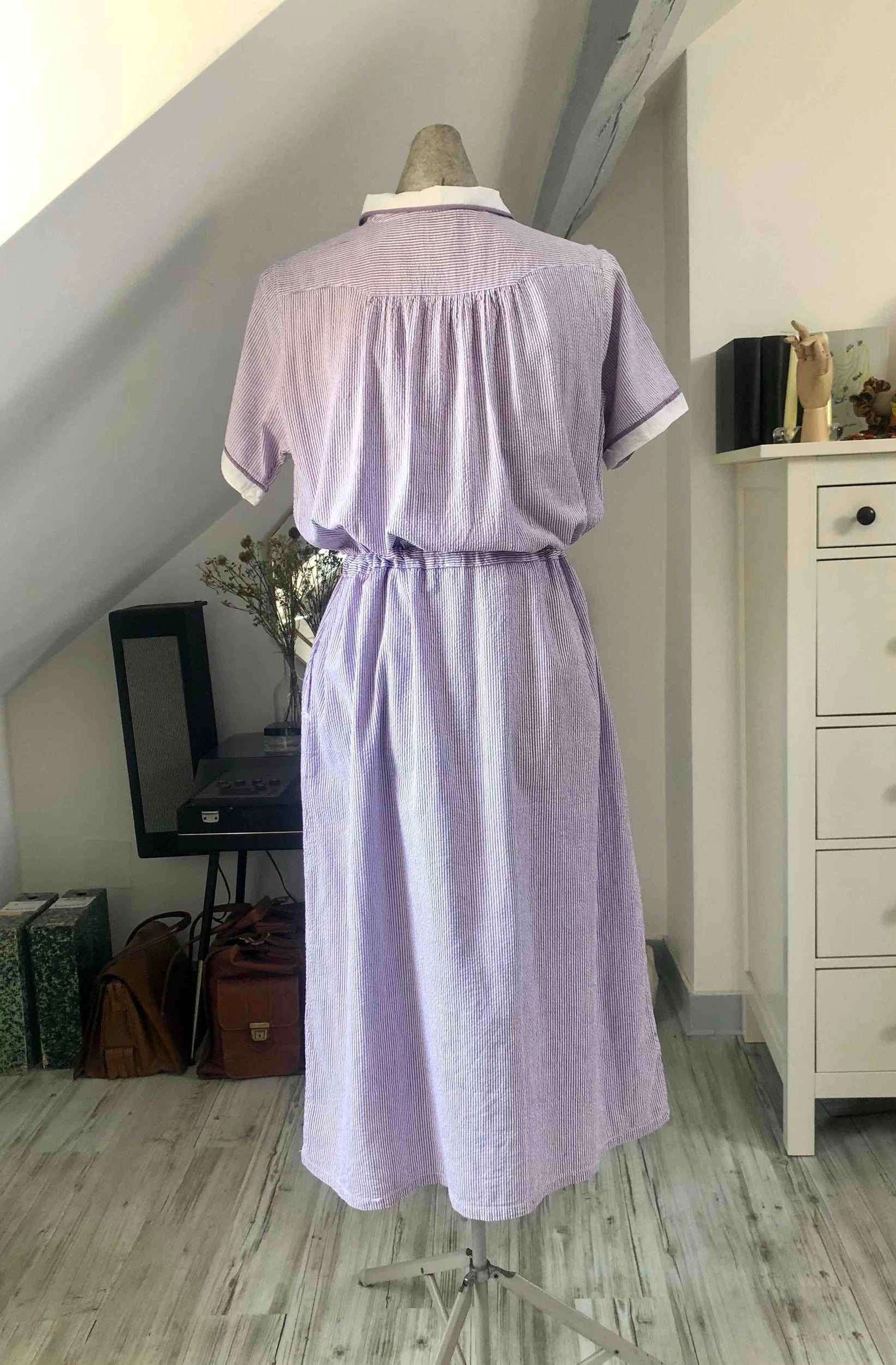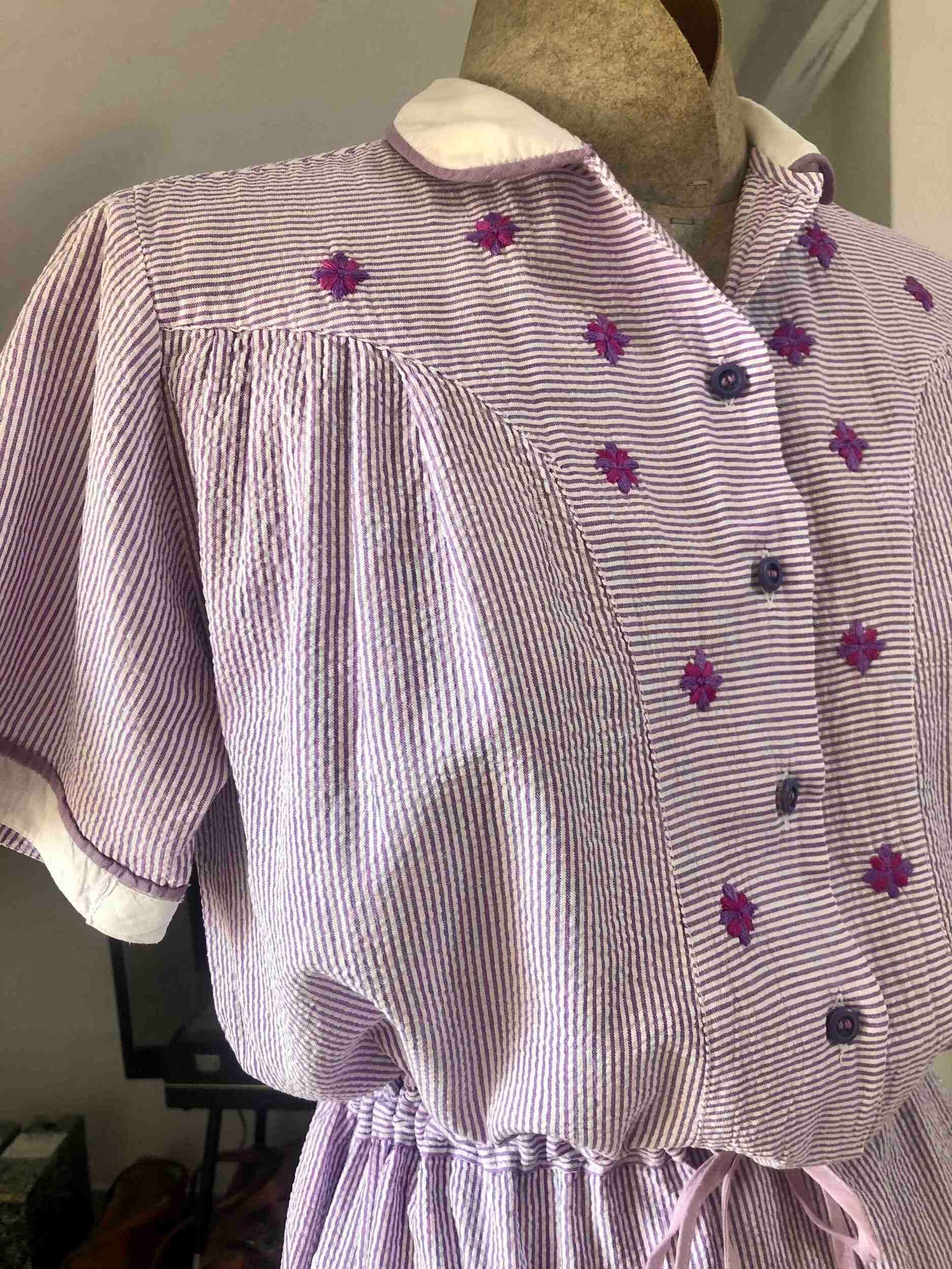 Prix unitaire parRobe en coton brodé. Une pièce des années 80/90. Longueur midi, motif rayé lilas et blanc. Coupe resserrée à la taille par un cordon à coulisse réglable. Col Claudine, broderies sur le plastron. Deux poches.