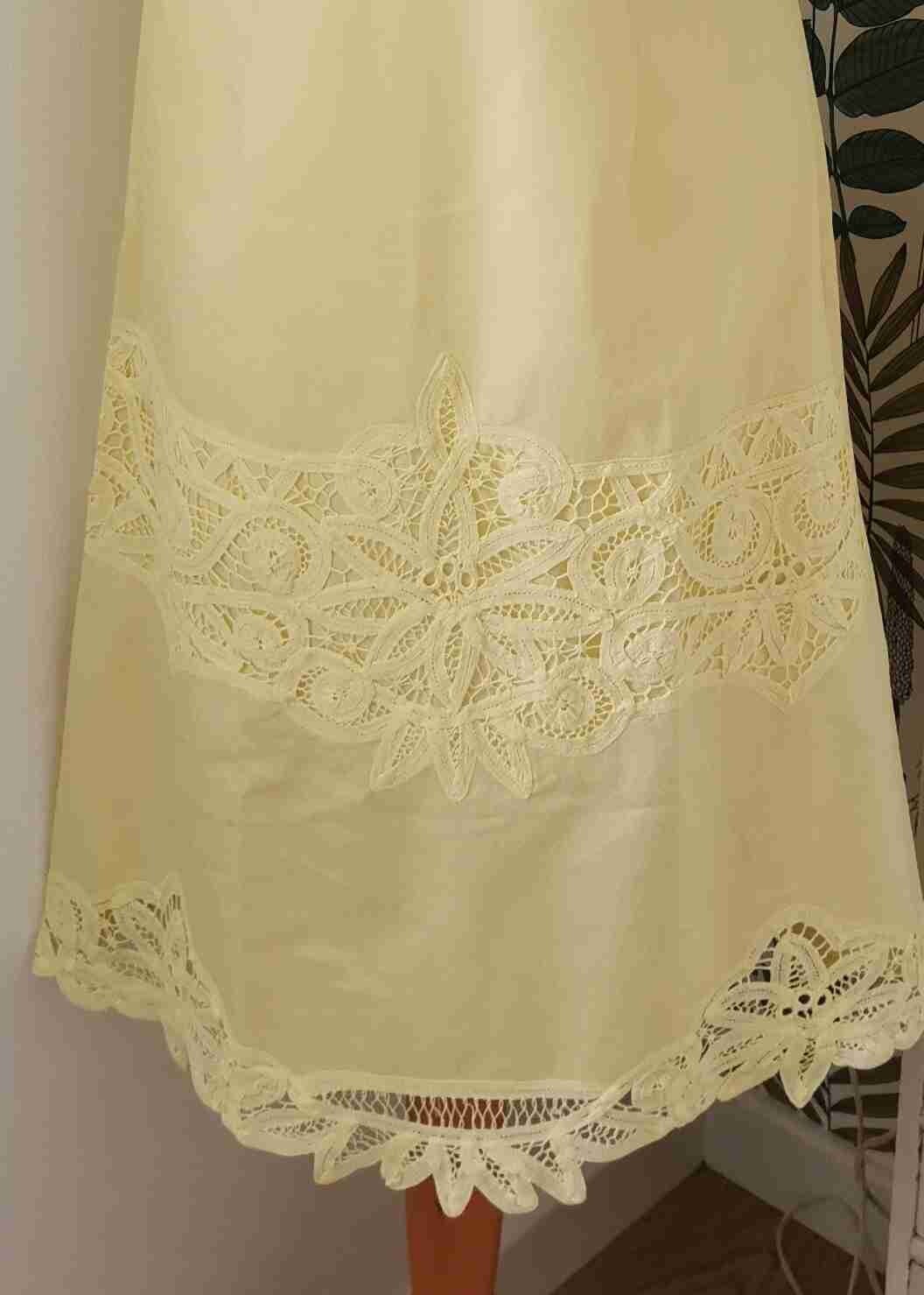 Application de dentelle sur la poitrine et sur le bas de la robe