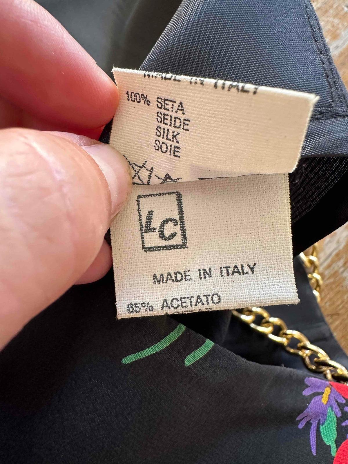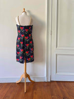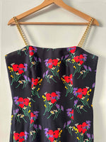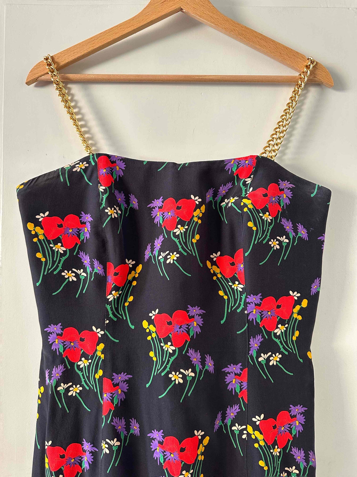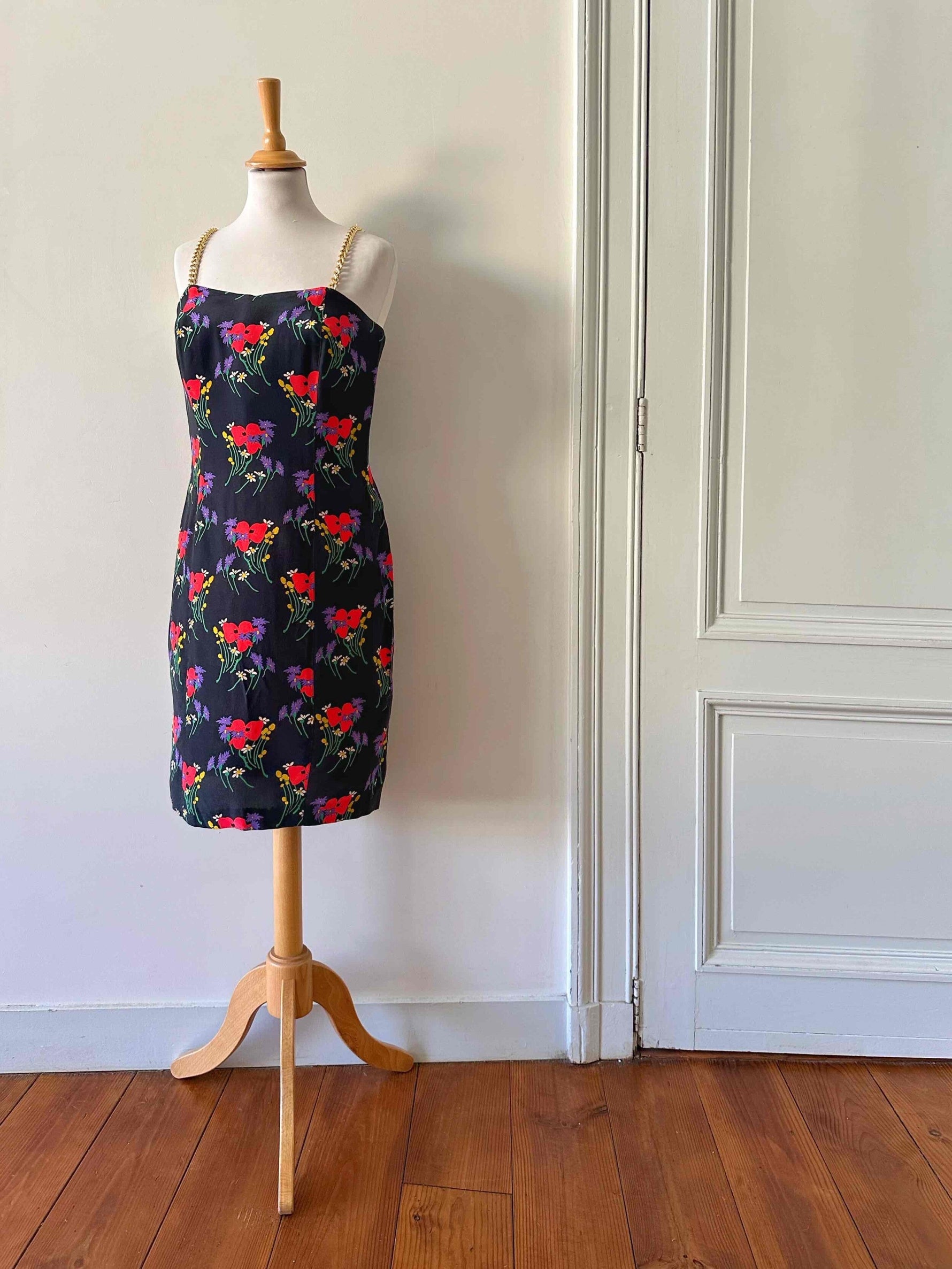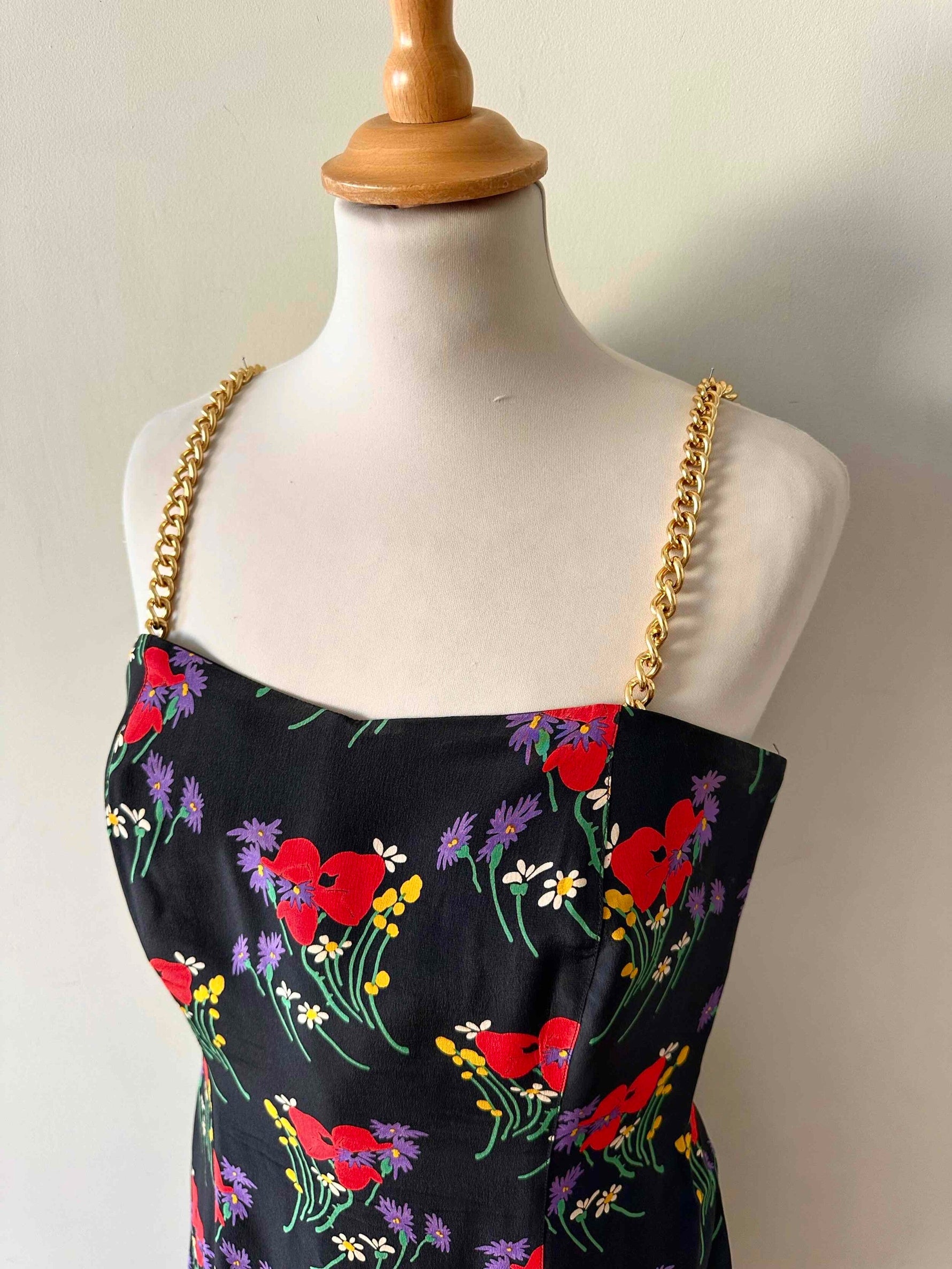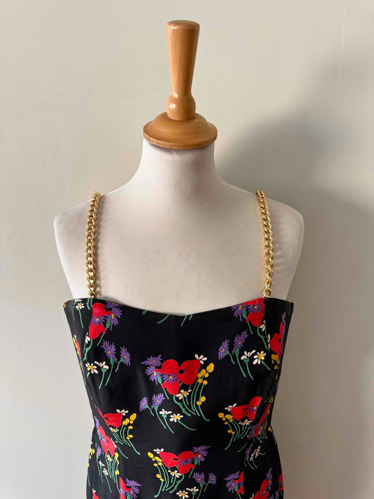 Prix unitaire parRobe bustier en soie, soie noire imprimée motifs bouquets de fleurs prairie multicolores. Bretelles chaînes en métal doré, haut forme bustier, fabriquée en Italie, taille 36 portée ici sur un mannequin T36, aisselles 45cm.