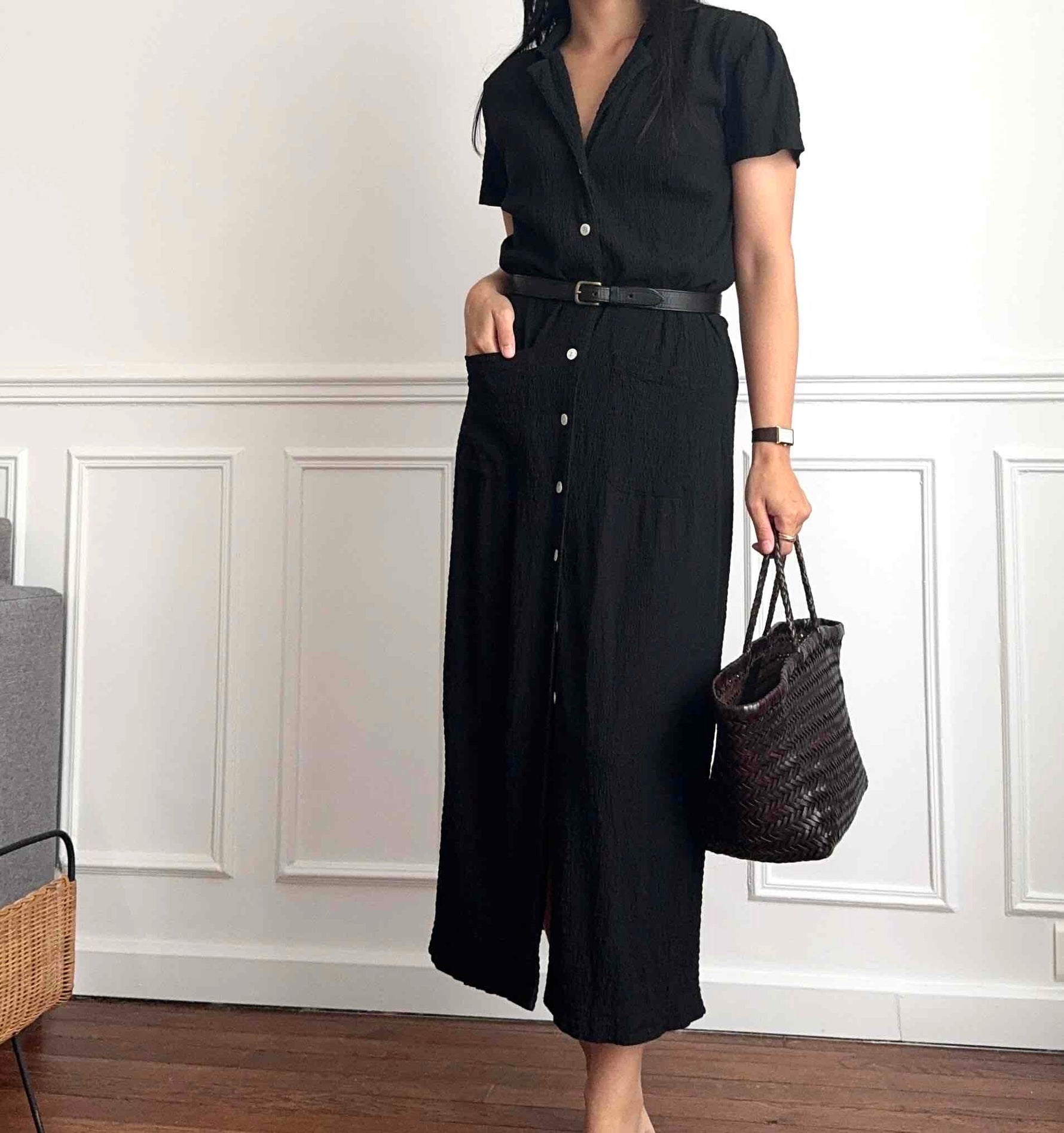 Portée légèrement oversize avec une ceinture par une personne taille 36.