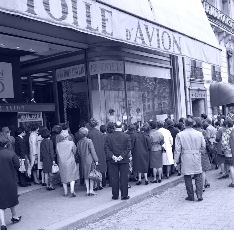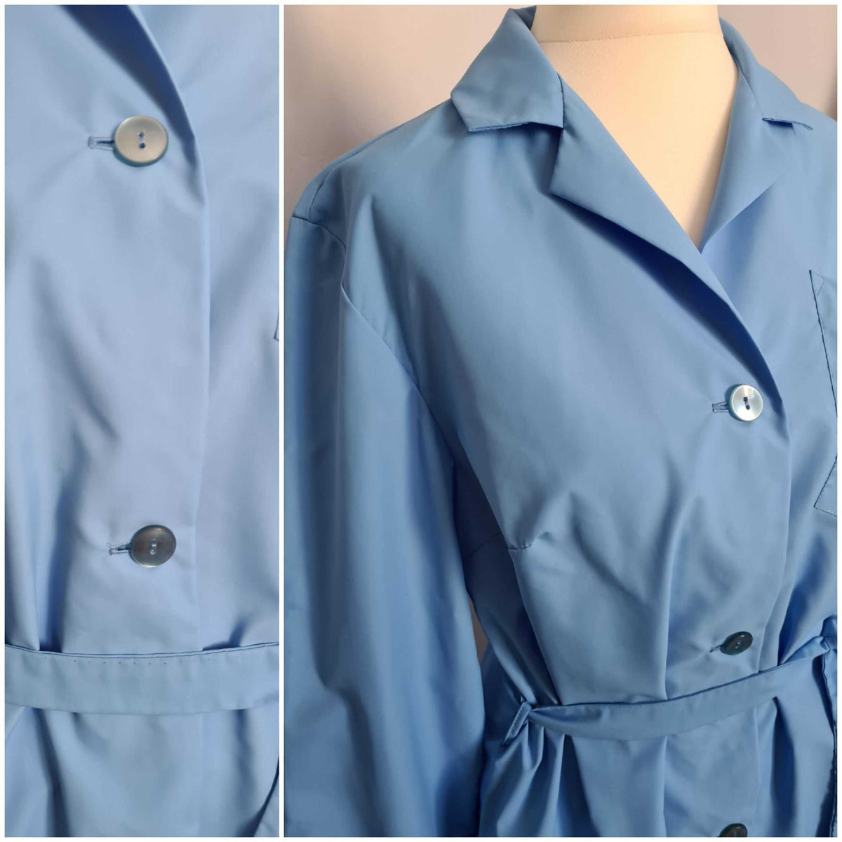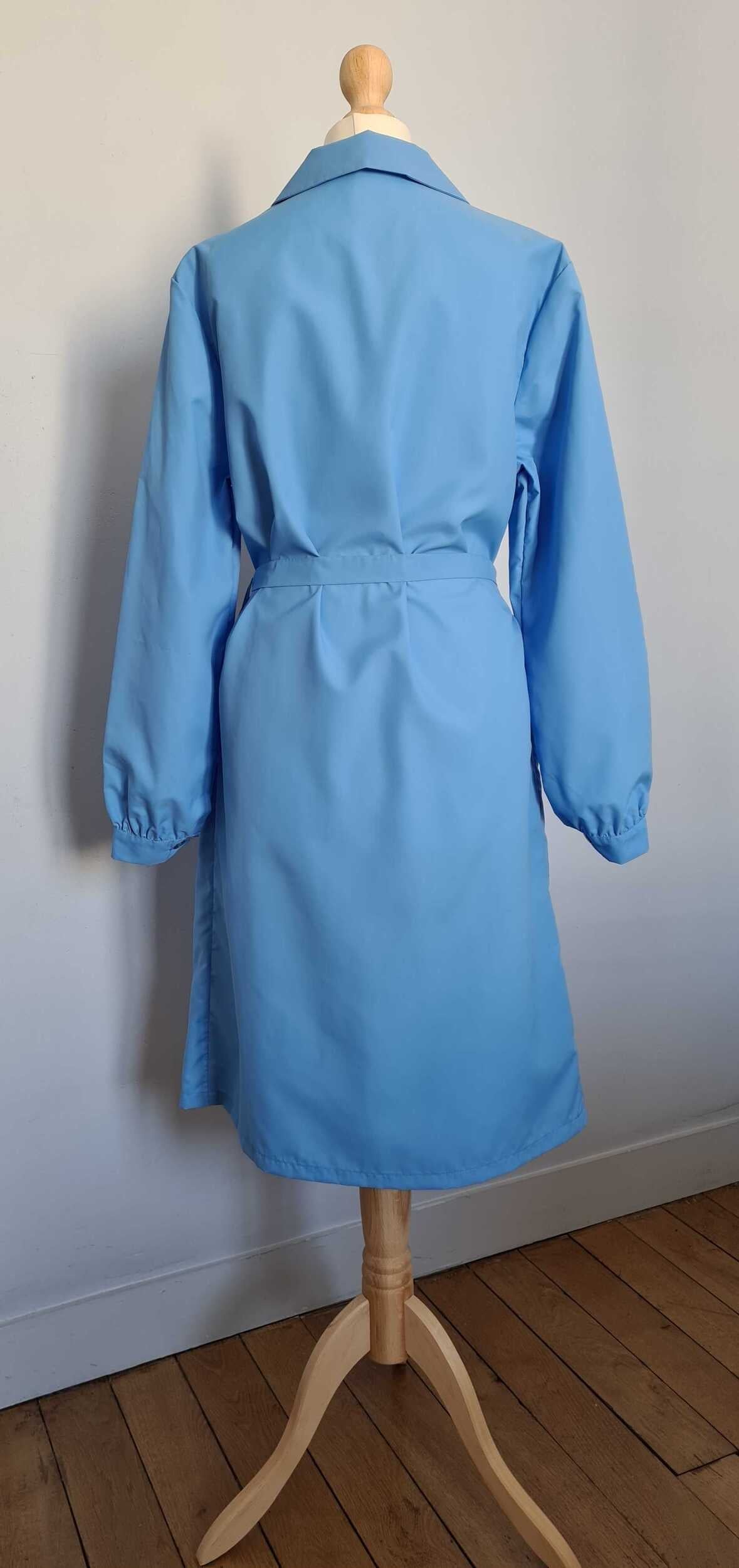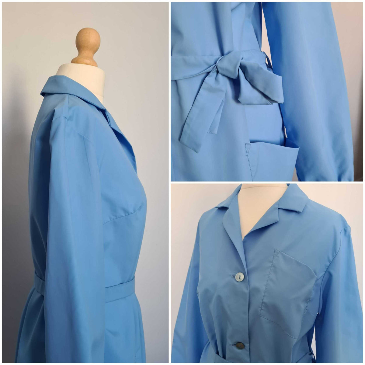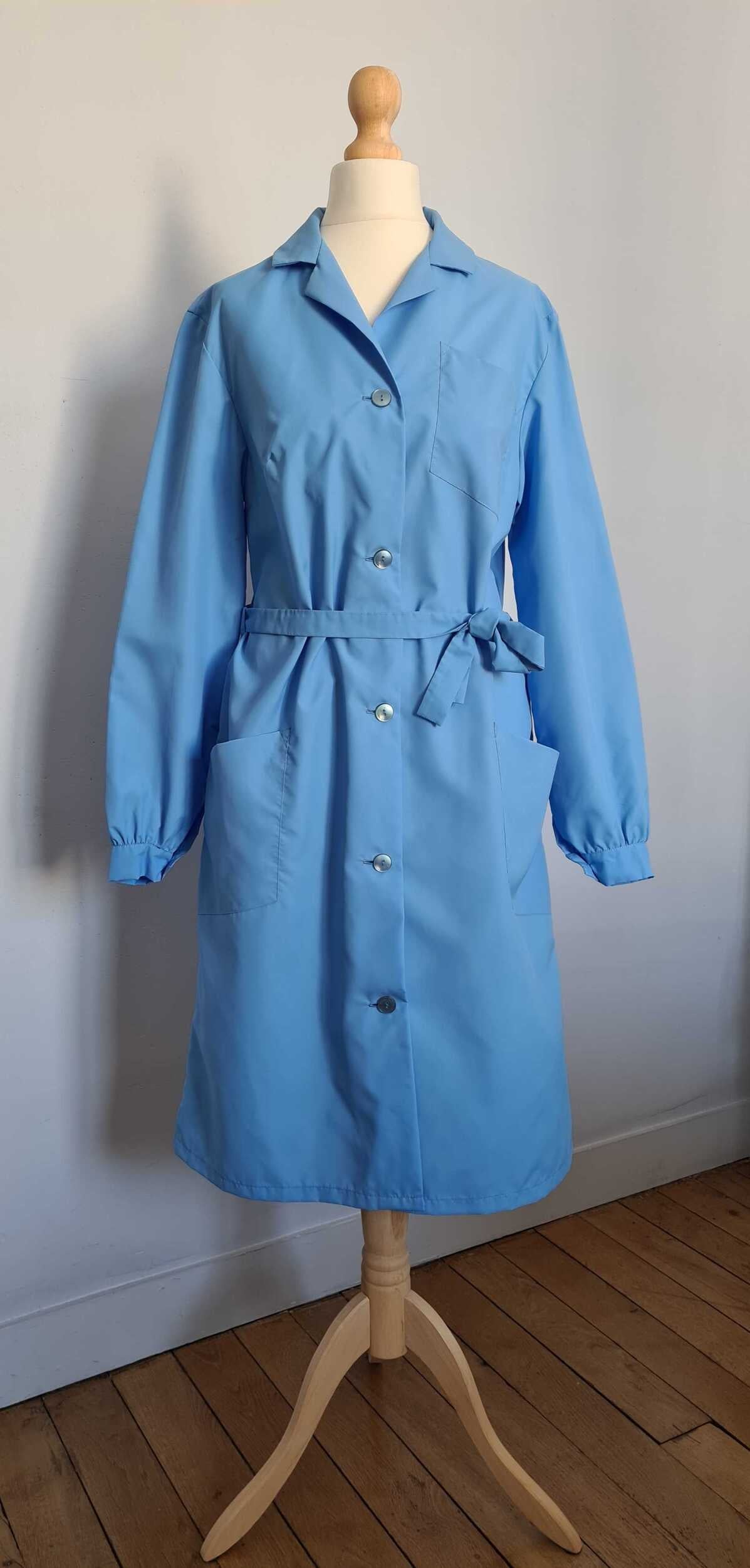 Robe/blouse de travail ceinturée "A la toile d'avion ", des années mi 60/70, fabriquée par la célèbre entreprise de Marcel Boussac. En nylon. Boutonnée à l'avant, 3 poches plates. Boutonnières aux manches. Etat neuf.