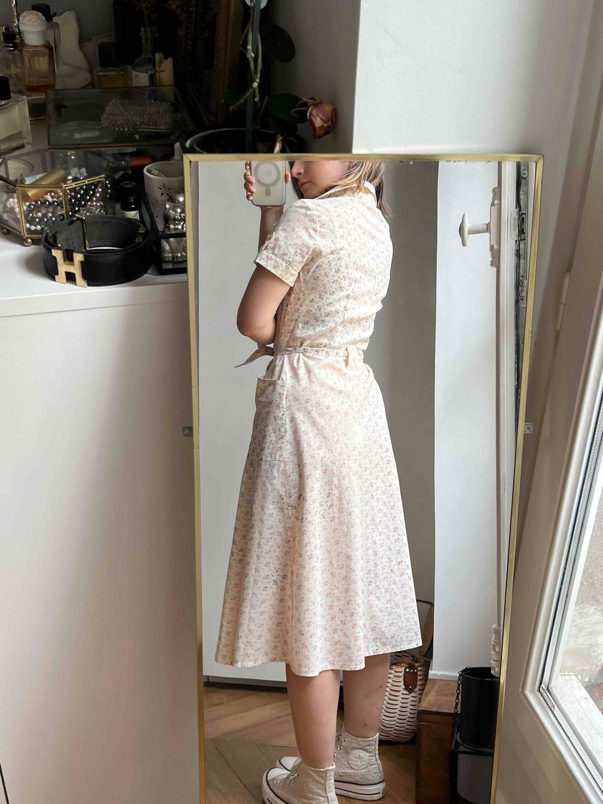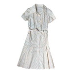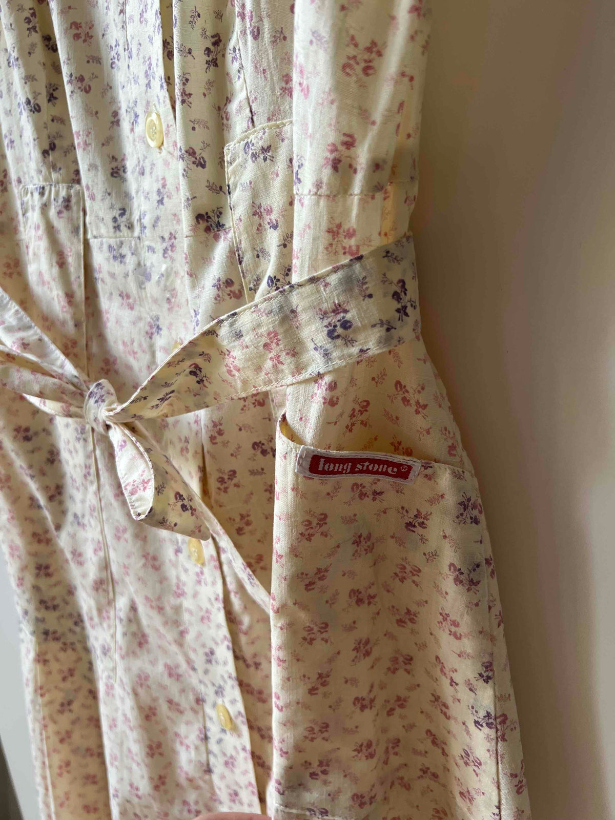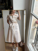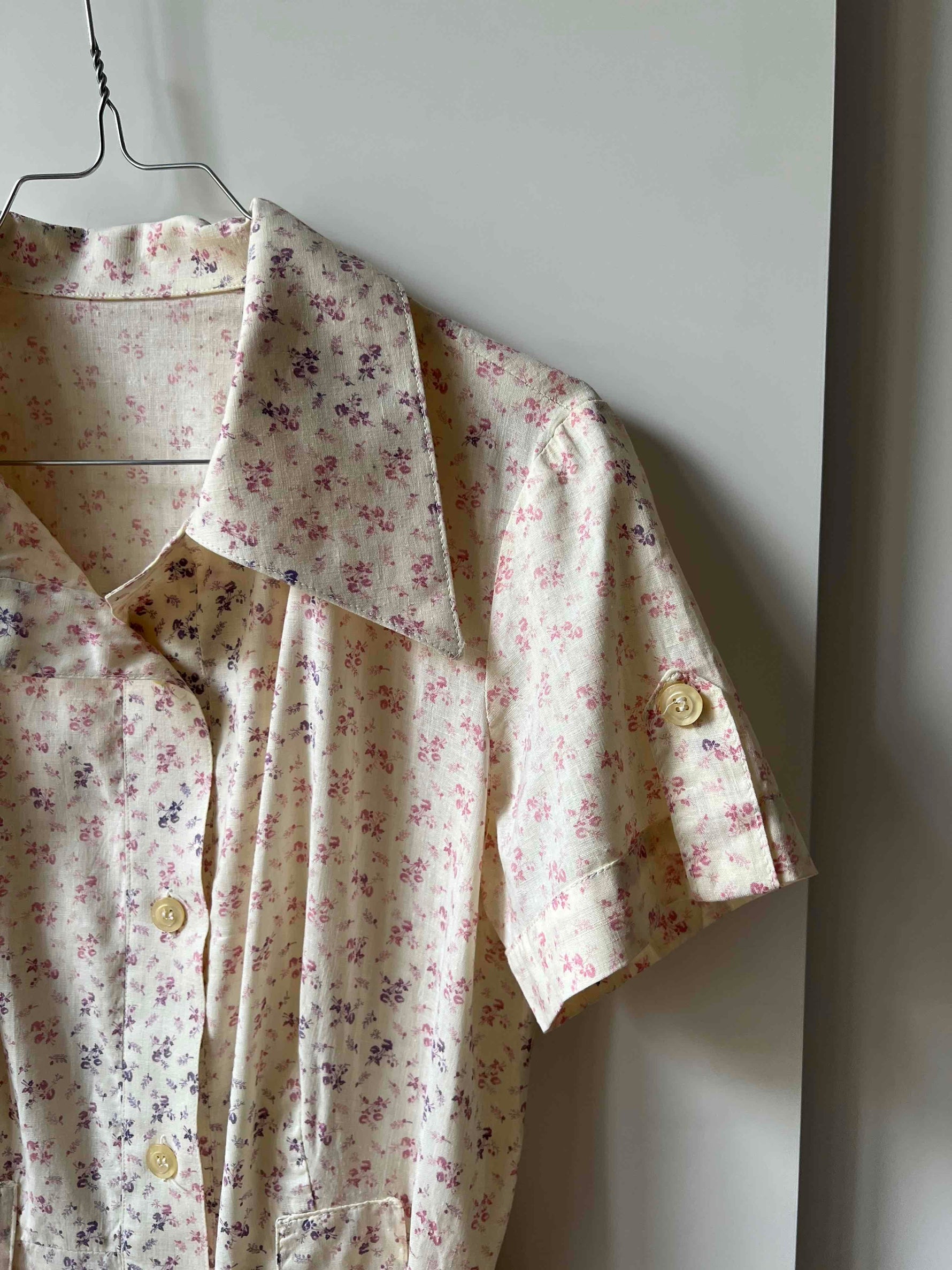 Prix unitaire parRobe chemise en coton écru à motifs de petites fleurs lilas et rose pastel. Manches courtes, ceinturée à la taille, détails de poche aux anges. Excellent état, aucun défaut années 90 de la marque long Stone.