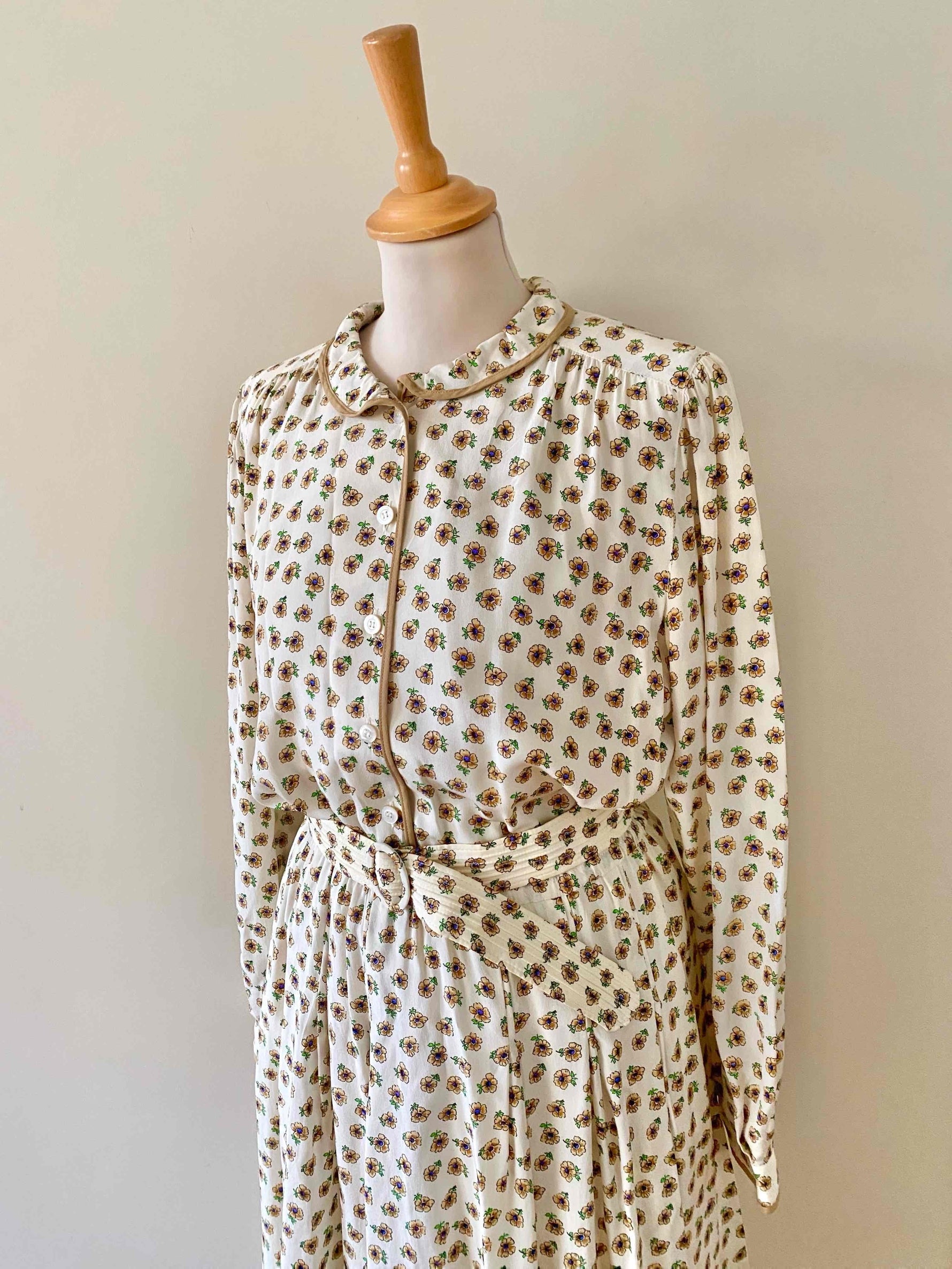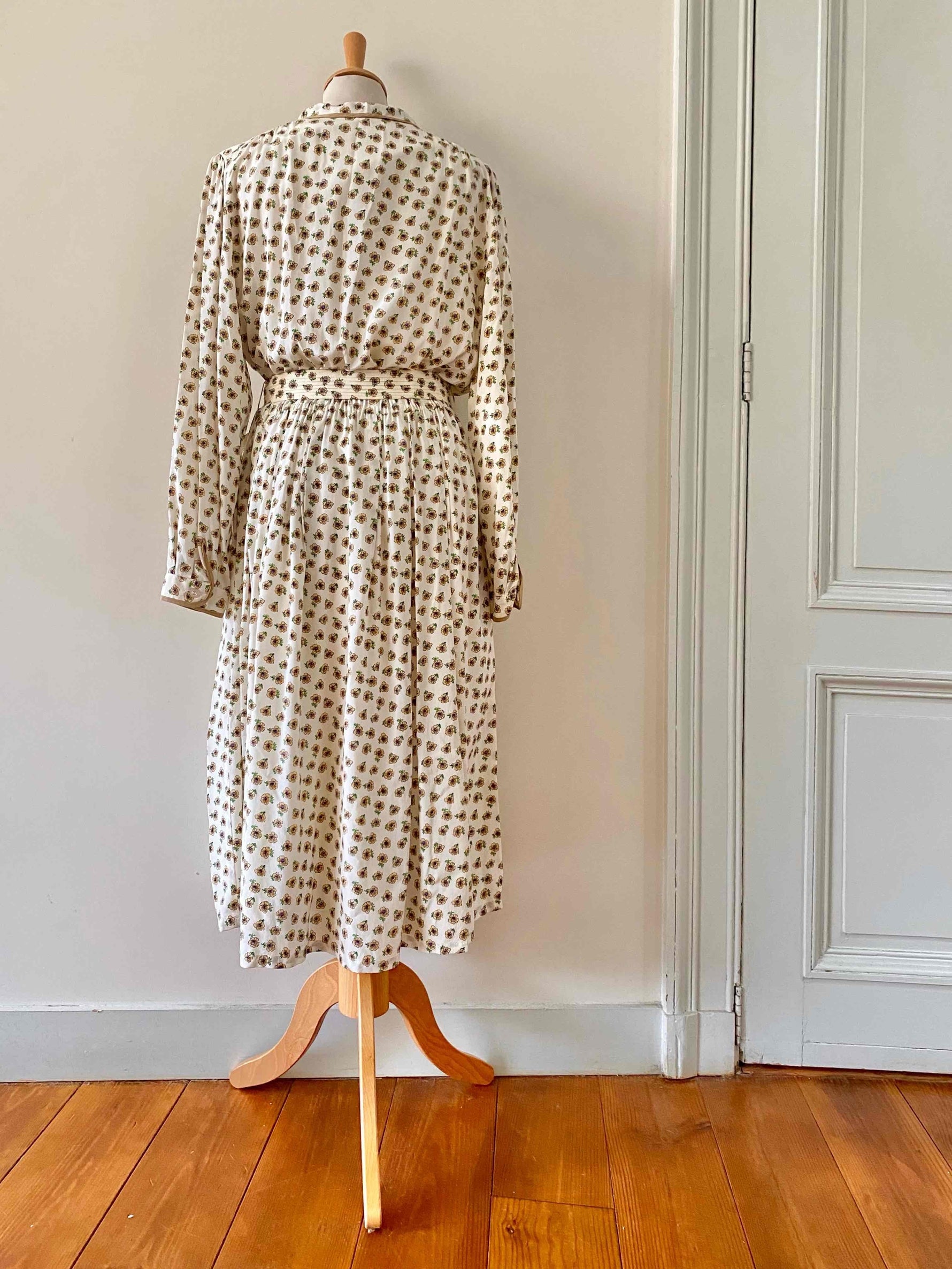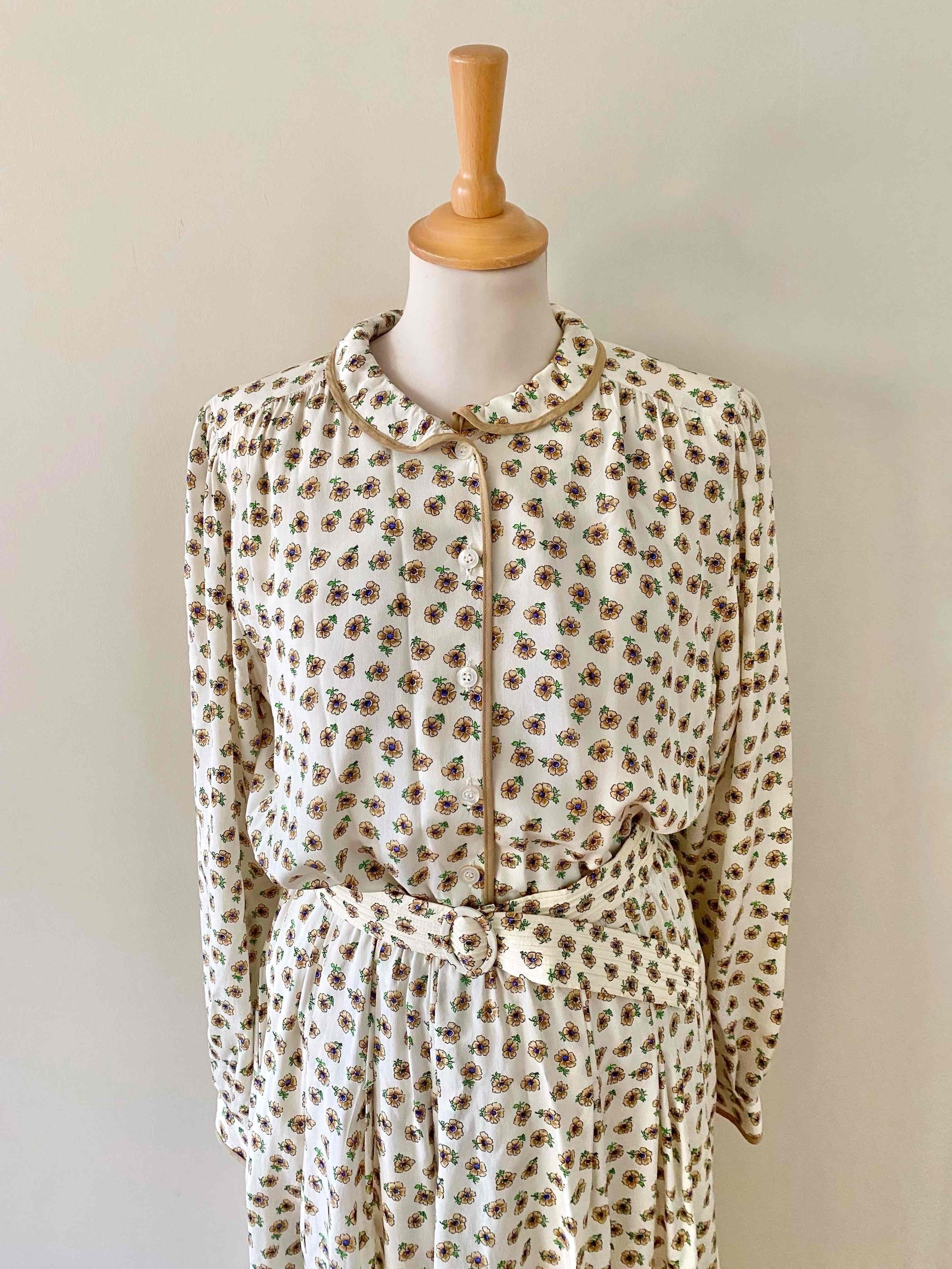 Prix unitaire parRobe chemise en soie fleurie, blanche imprimée petites fleurs beiges, bleues et vertes, col claudine, bordures camel, manches longues, bas plissé, ceinture taille plissée à boucle ronde, taille élastique, fabriquée en West Germany, taille 38 portée ici sur un mannequin T36.