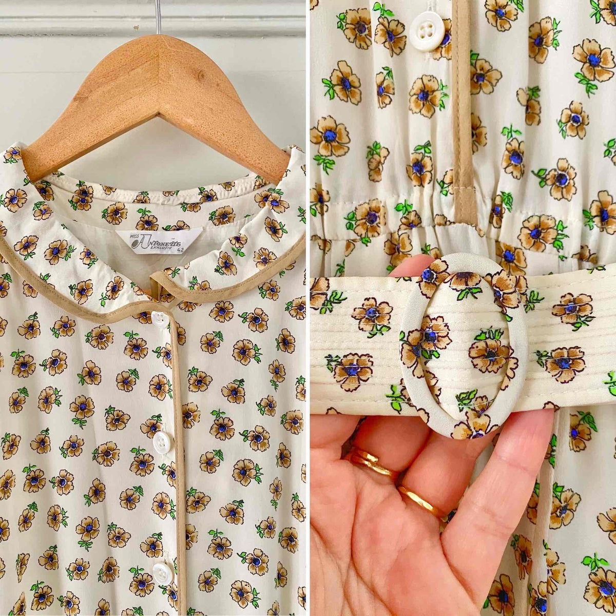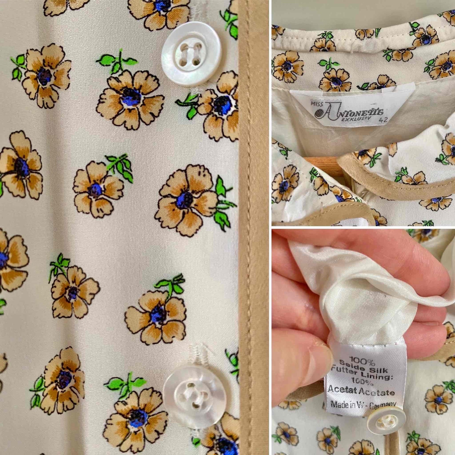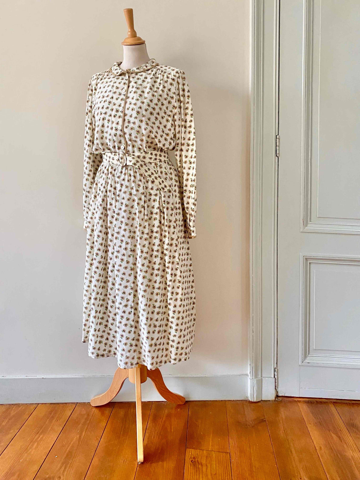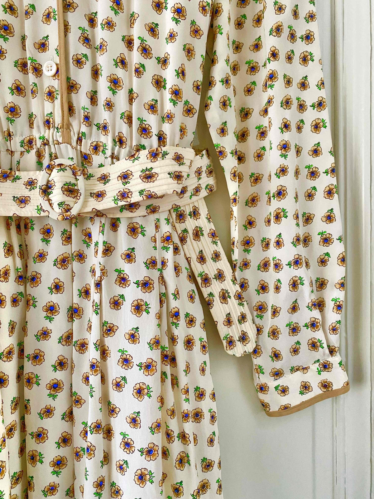 Prix unitaire parRobe chemise en soie fleurie, blanche imprimée petites fleurs beiges, bleues et vertes, col claudine, bordures camel, manches longues, bas plissé, ceinture taille plissée à boucle ronde, taille élastique, fabriquée en West Germany, taille 38 portée ici sur un mannequin T36.