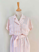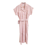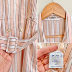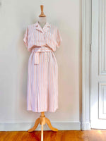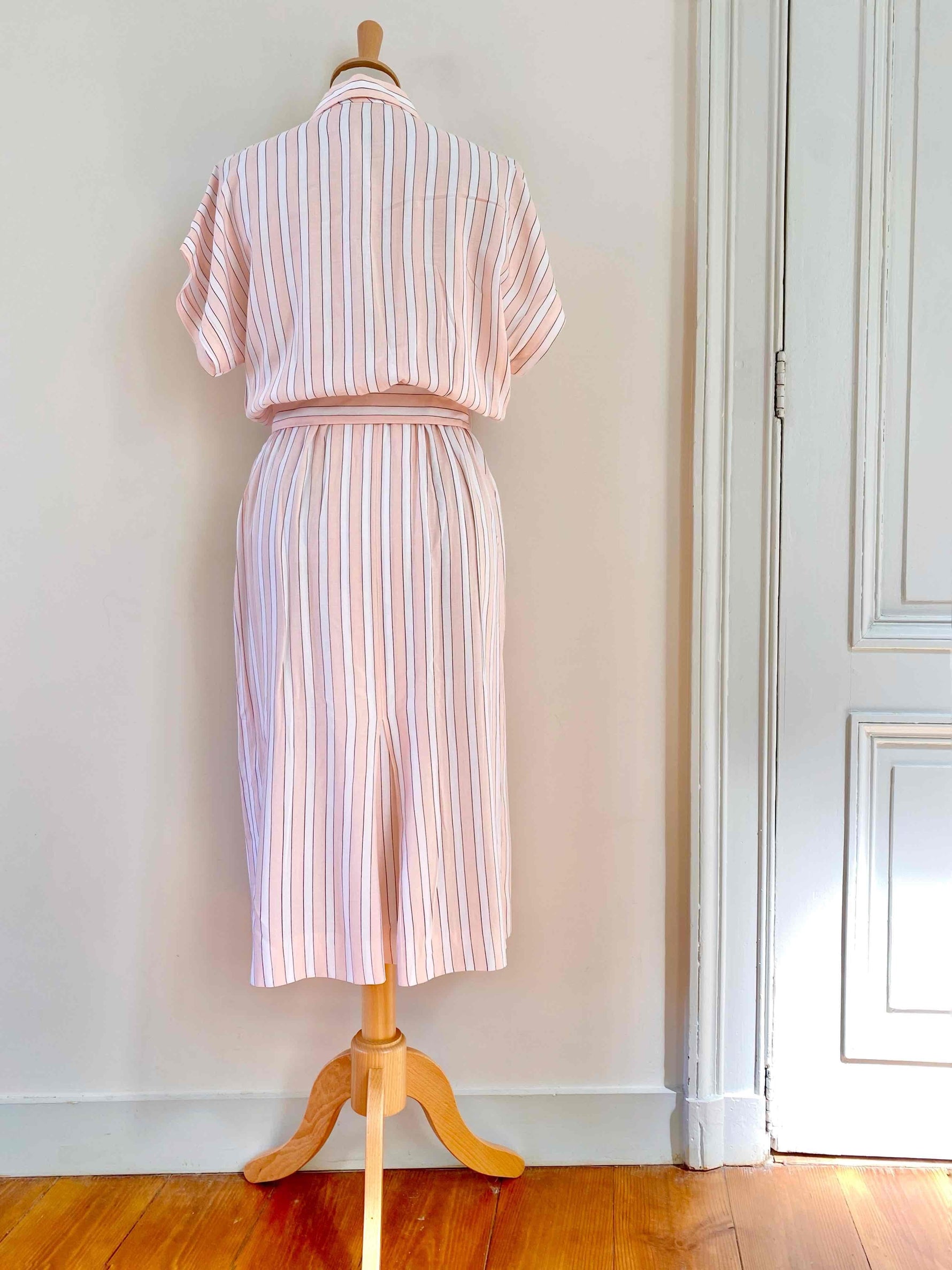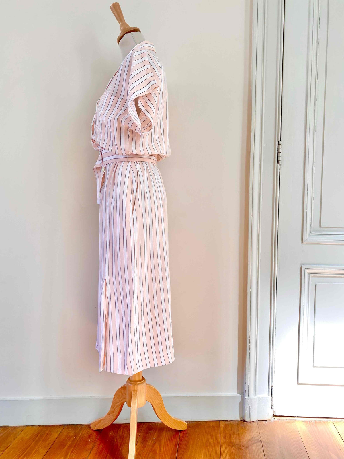 Robe Chemise Guy Laroche en viscose rayures transat rose pastel et blanches, haut cache Coeur boutonné, ceinture à boucle carrée coordonnée, taille élastique de 30cm à 38cm, fabriquée en France, taille 36 et 38 portée ici sur un mannequin T36.