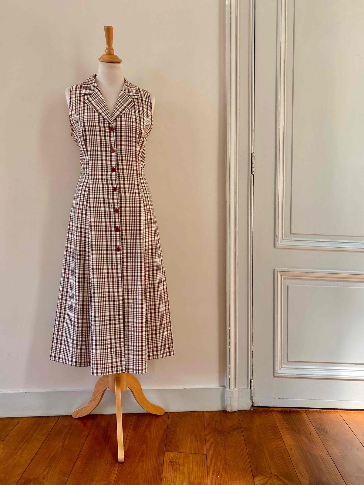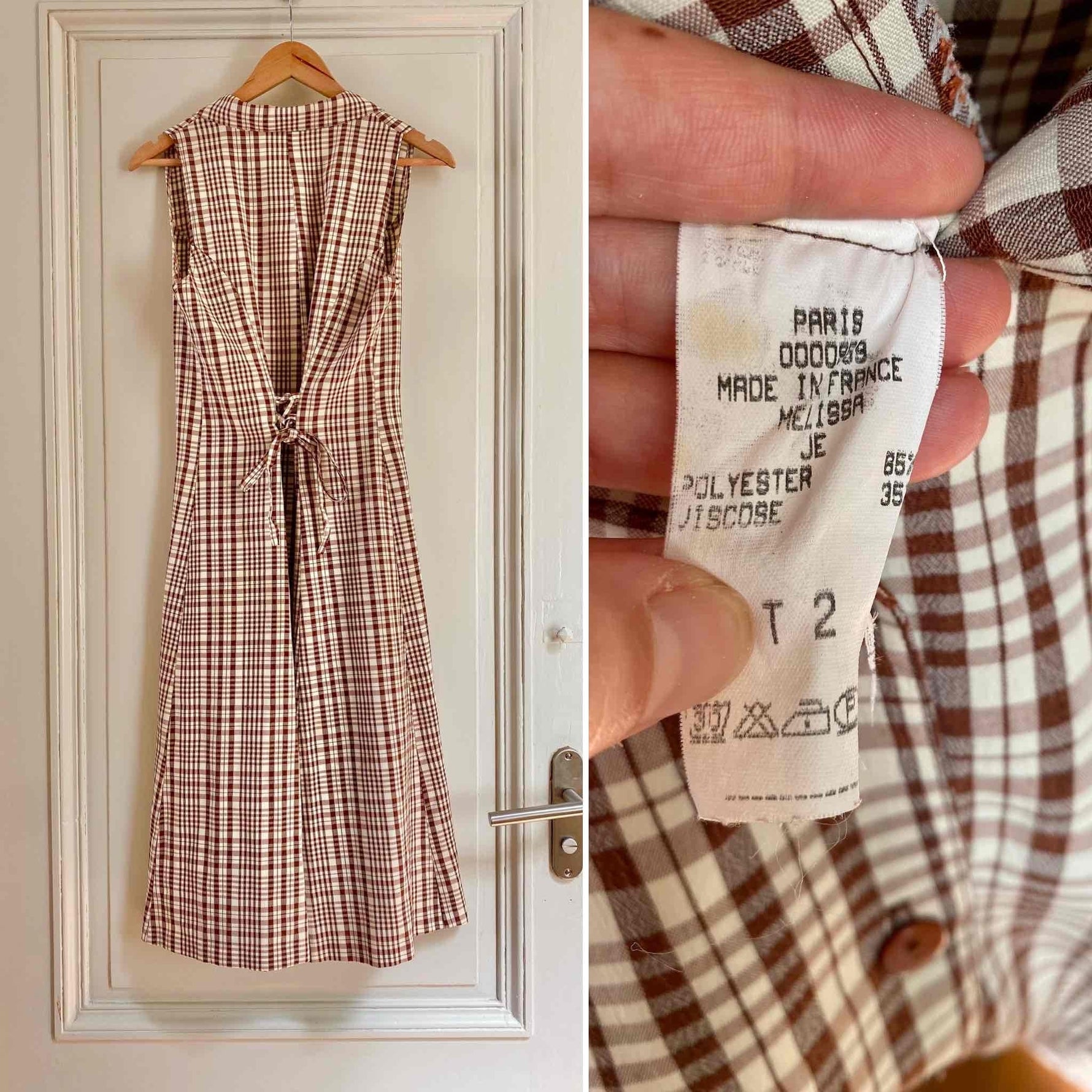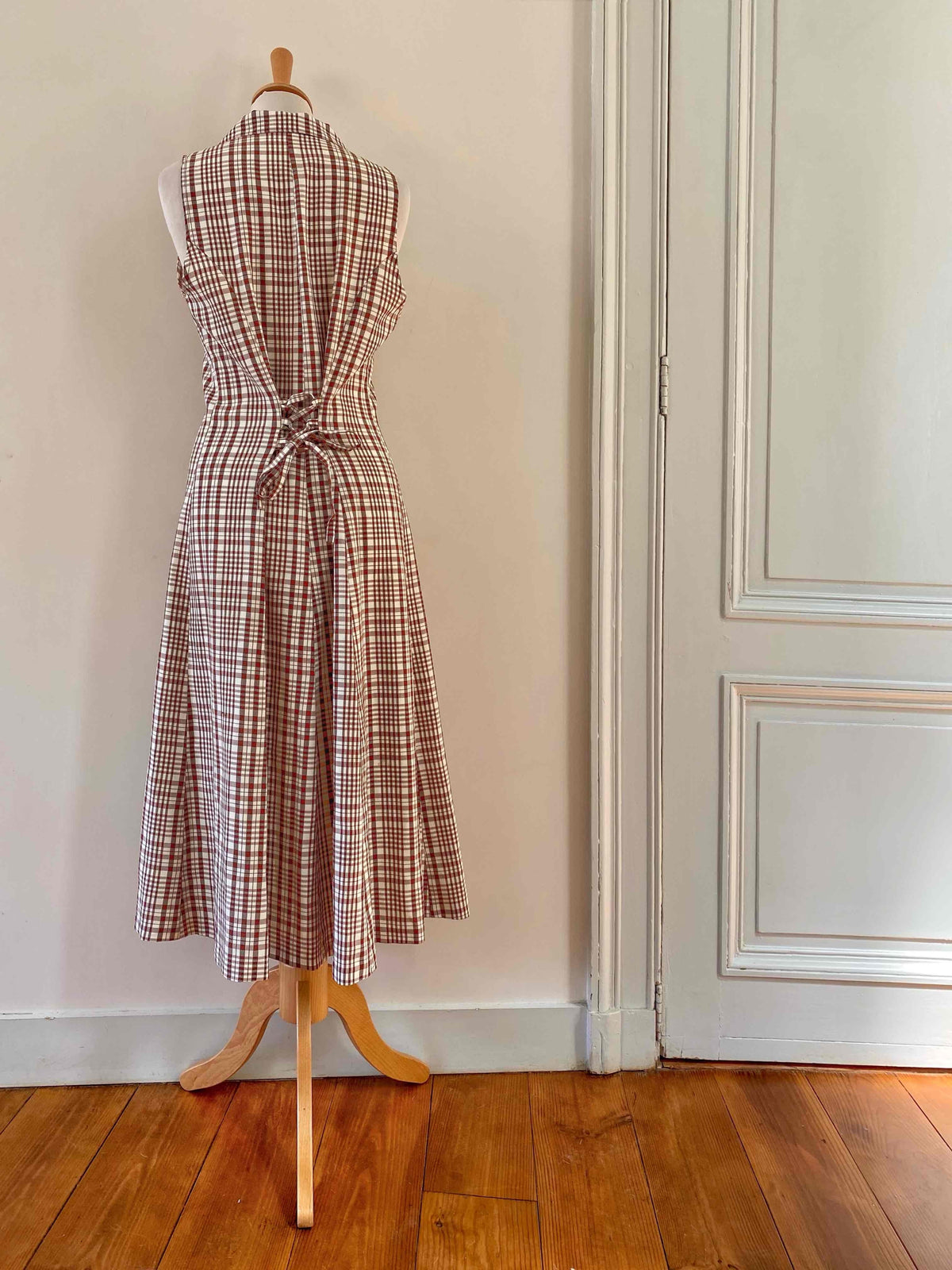Prix unitaire parRobe chemise vichy, en viscose mélangée écrue carreaux vichy chocolat caramel, col chemisier, sans manches, boutonnée devant et dos à laçage esprit corset, fabriquée en France, taille 36 et petit 38 portée ici sur un mannequin T36, aisselles 46cm.