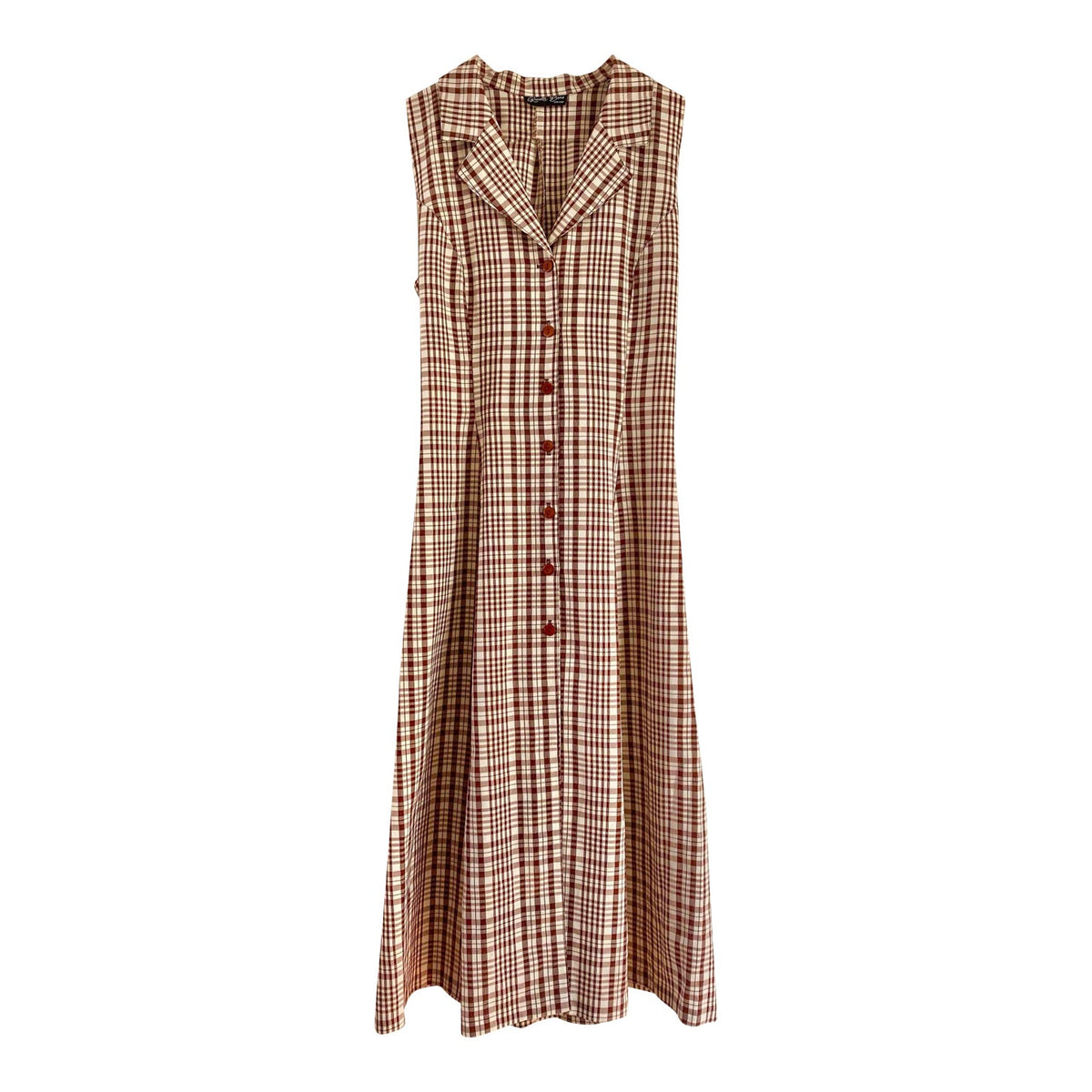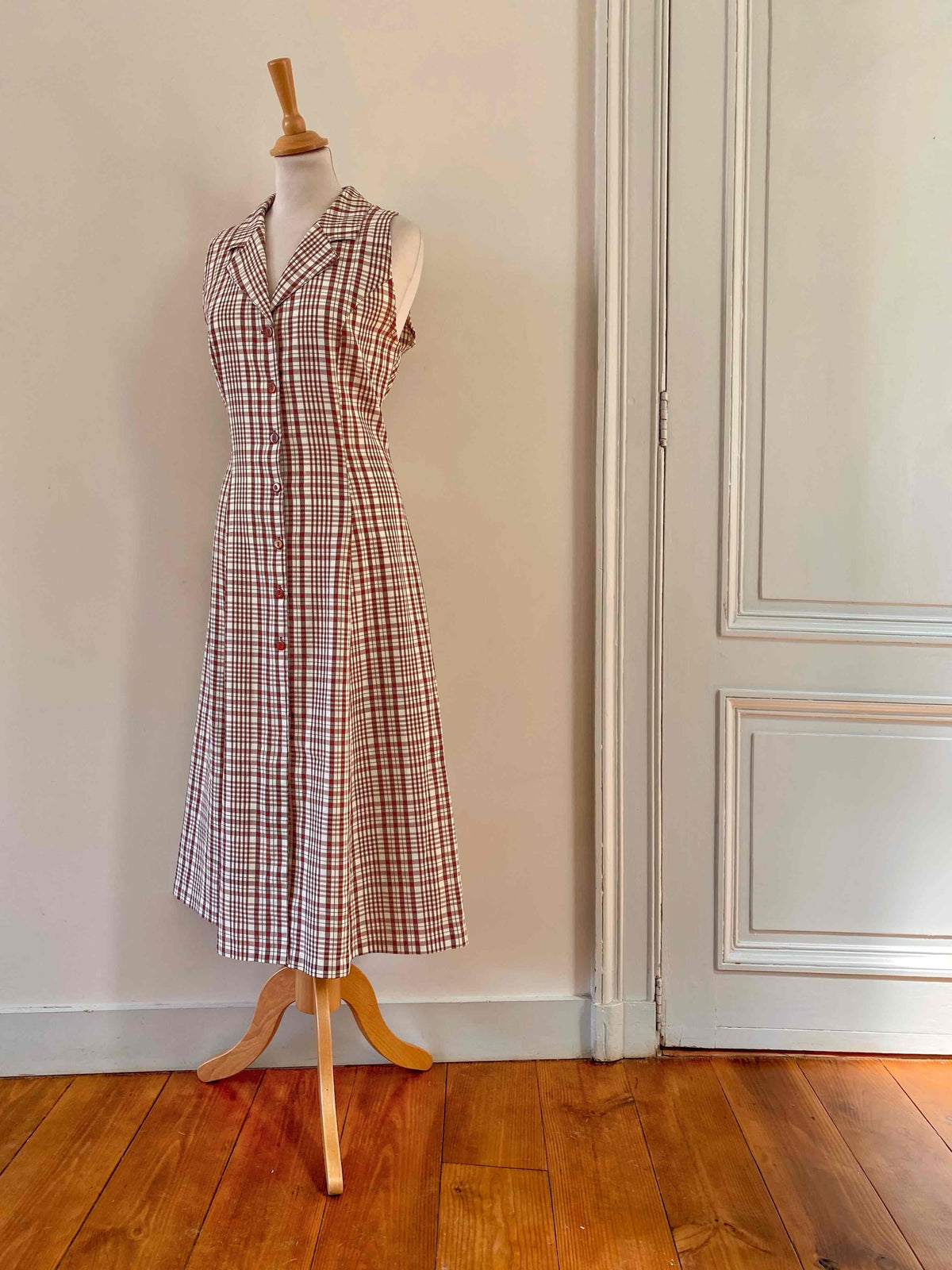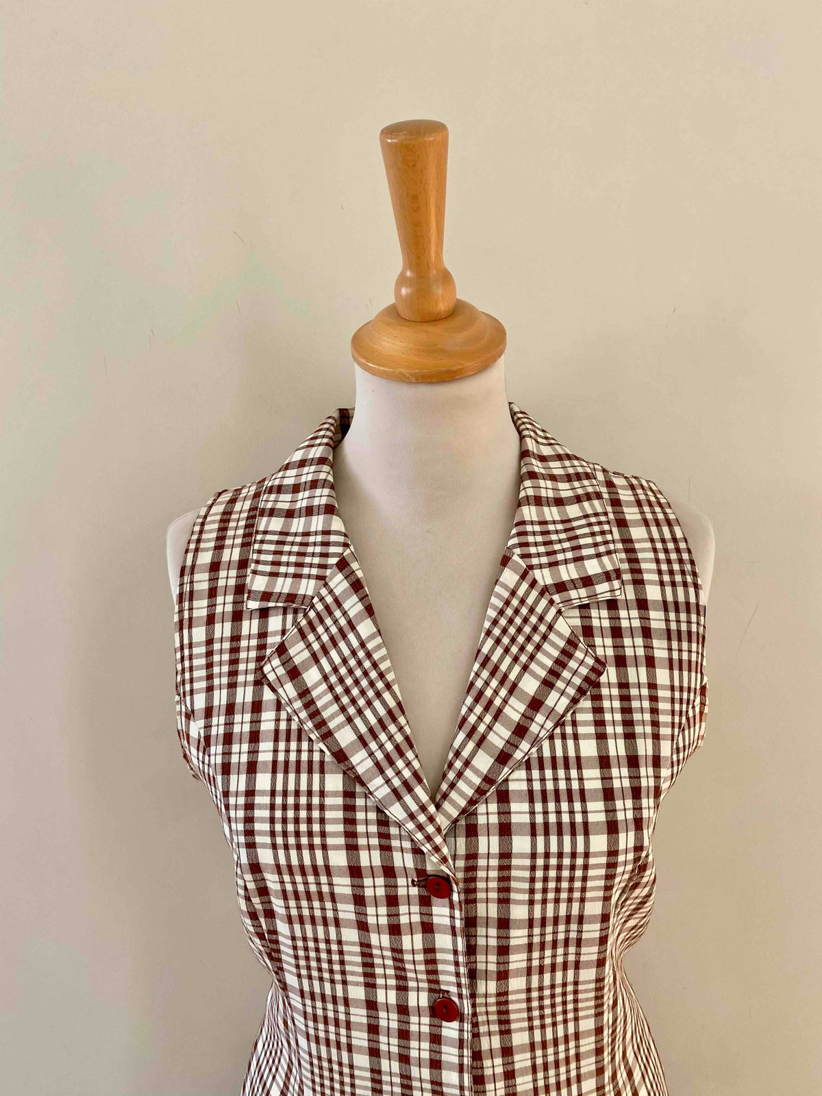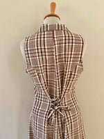 Prix unitaire parRobe chemise vichy, en viscose mélangée écrue carreaux vichy chocolat caramel, col chemisier, sans manches, boutonnée devant et dos à laçage esprit corset, fabriquée en France, taille 36 et petit 38 portée ici sur un mannequin T36, aisselles 46cm.