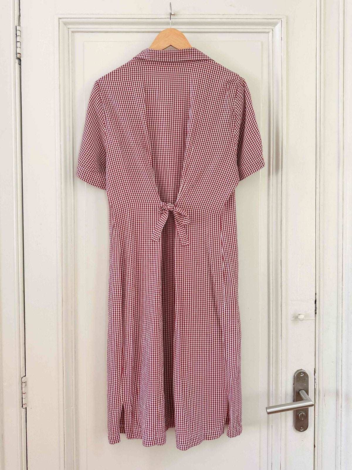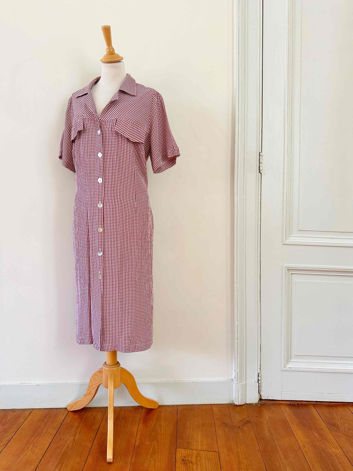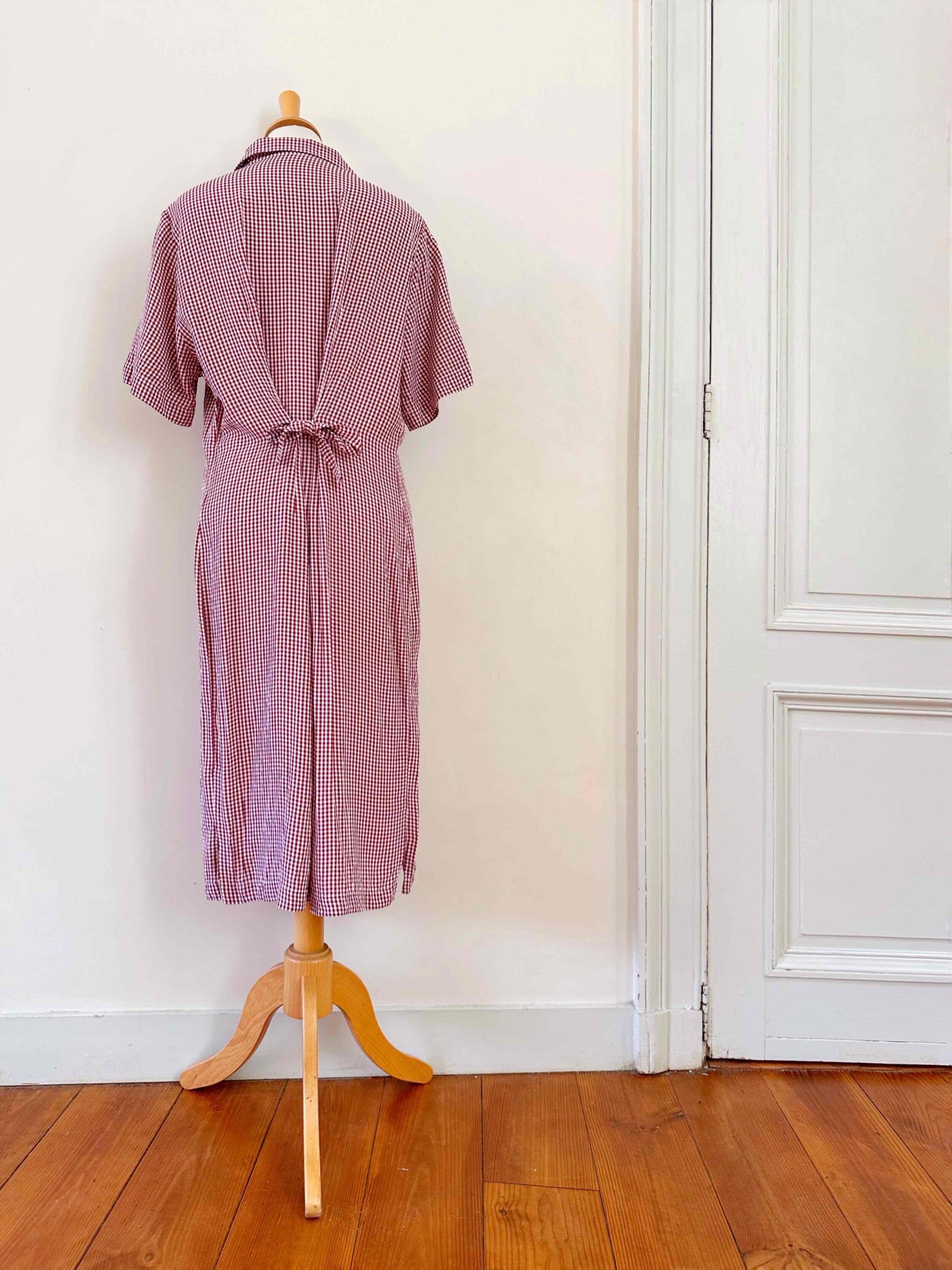 Robe chemise vichy, en viscose imprimée carreaux vichy rouges bordeaux et blancs, boutons en nacre, ceinture à nouer dos, fabriquée en Italie, convient aux tailles 38 et 40 portée ici sur un mannequin T36, aisselles 52cm.