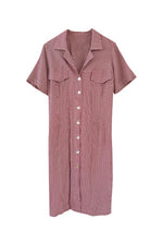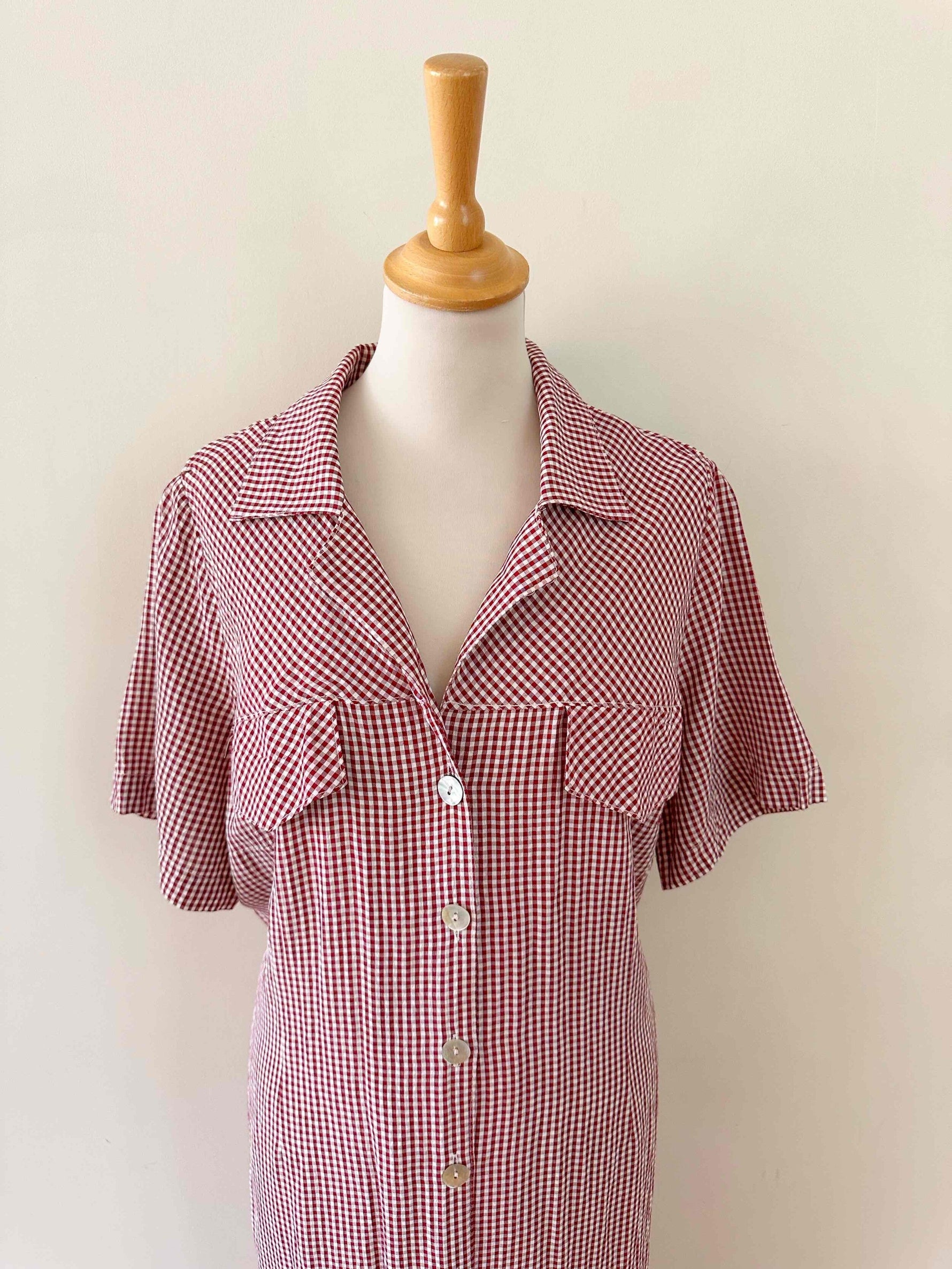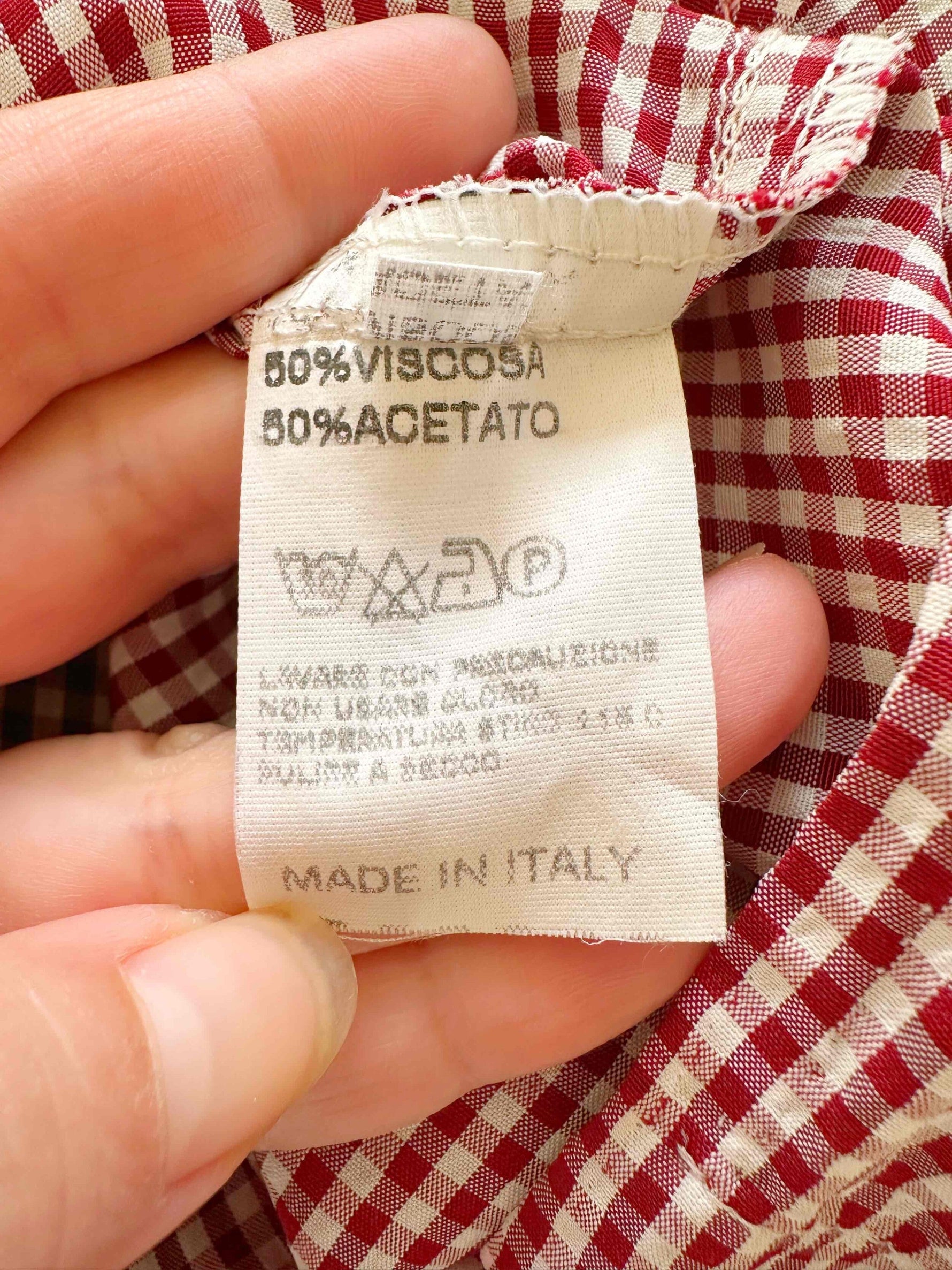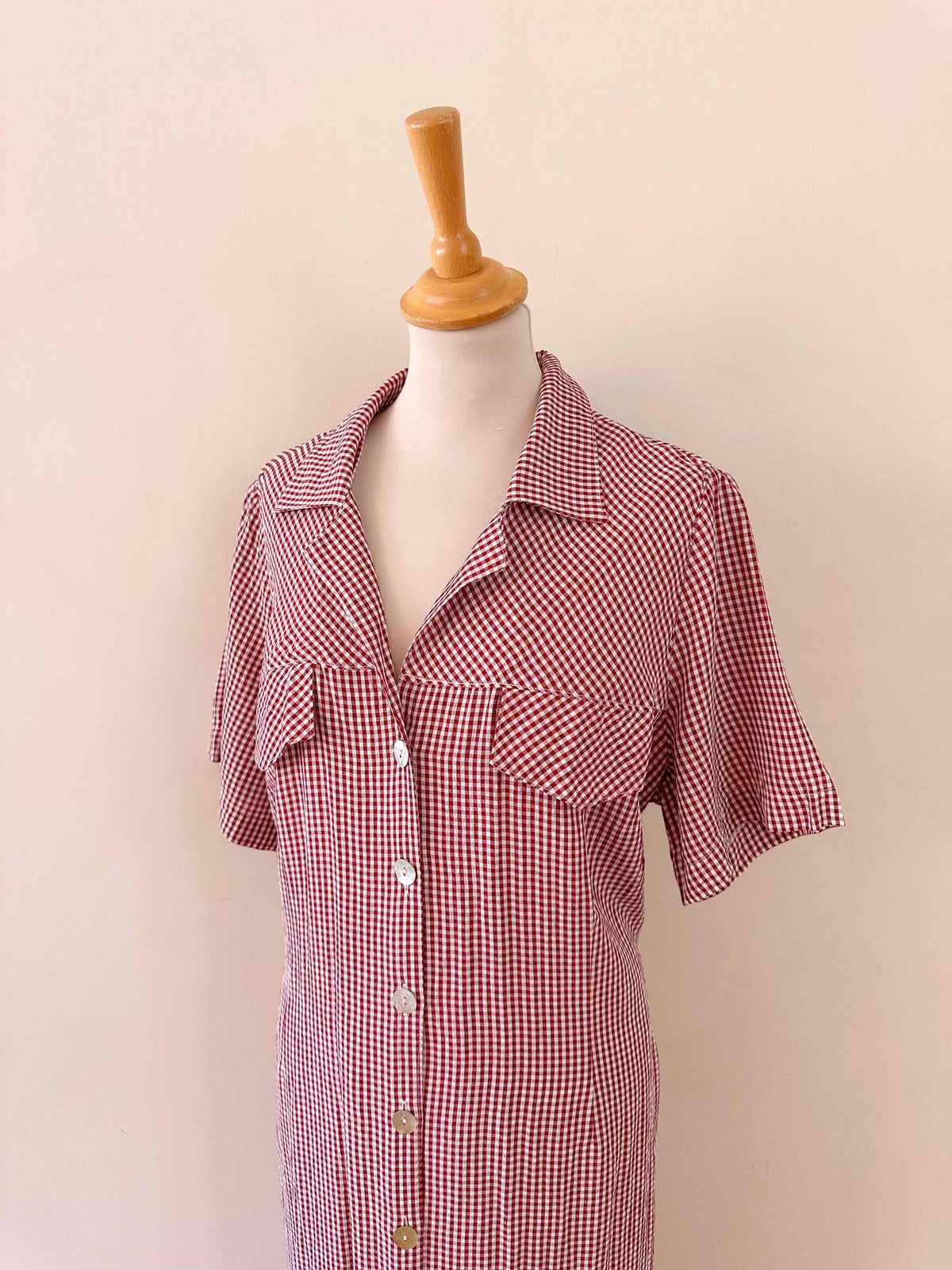 Robe chemise vichy, en viscose imprimée carreaux vichy rouges bordeaux et blancs, boutons en nacre, ceinture à nouer dos, fabriquée en Italie, convient aux tailles 38 et 40 portée ici sur un mannequin T36, aisselles 52cm.