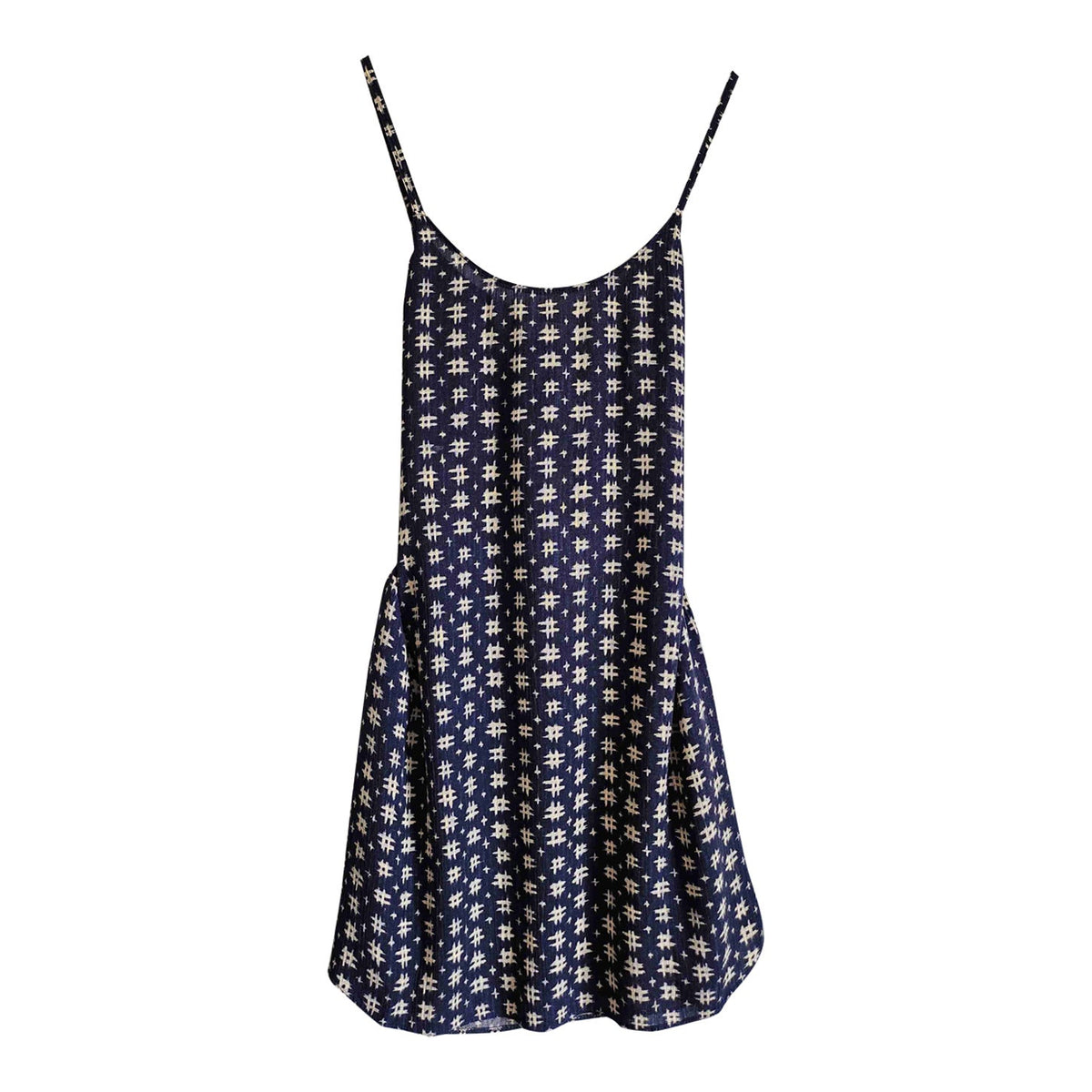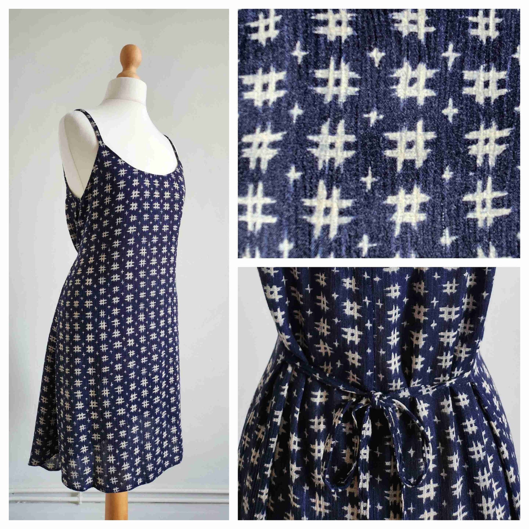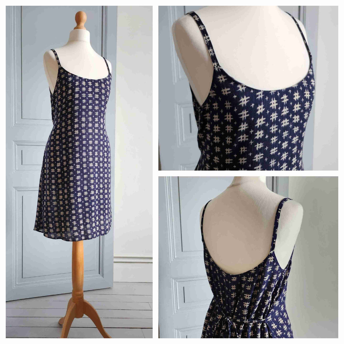 Prix unitaire parRobe courte à fines bretelles en viscose bleu nuit à motifs écrus, forme trapèze fluide, lien à nouer au dos pour resserrer la taille. Made in UK. Poitrine 42 cm.