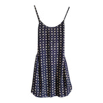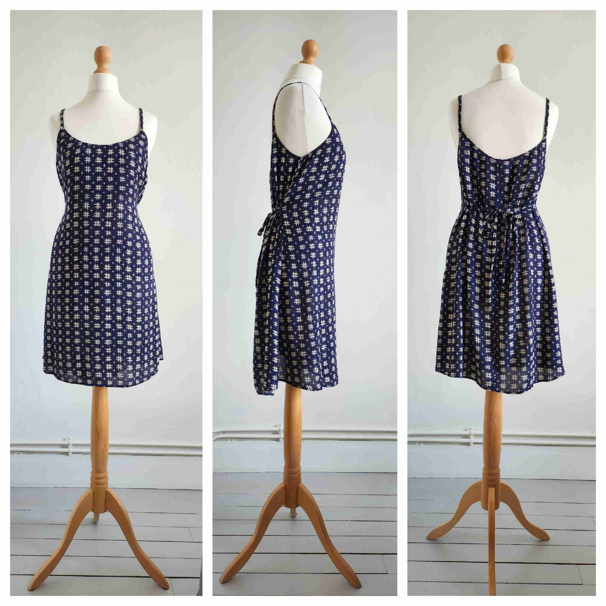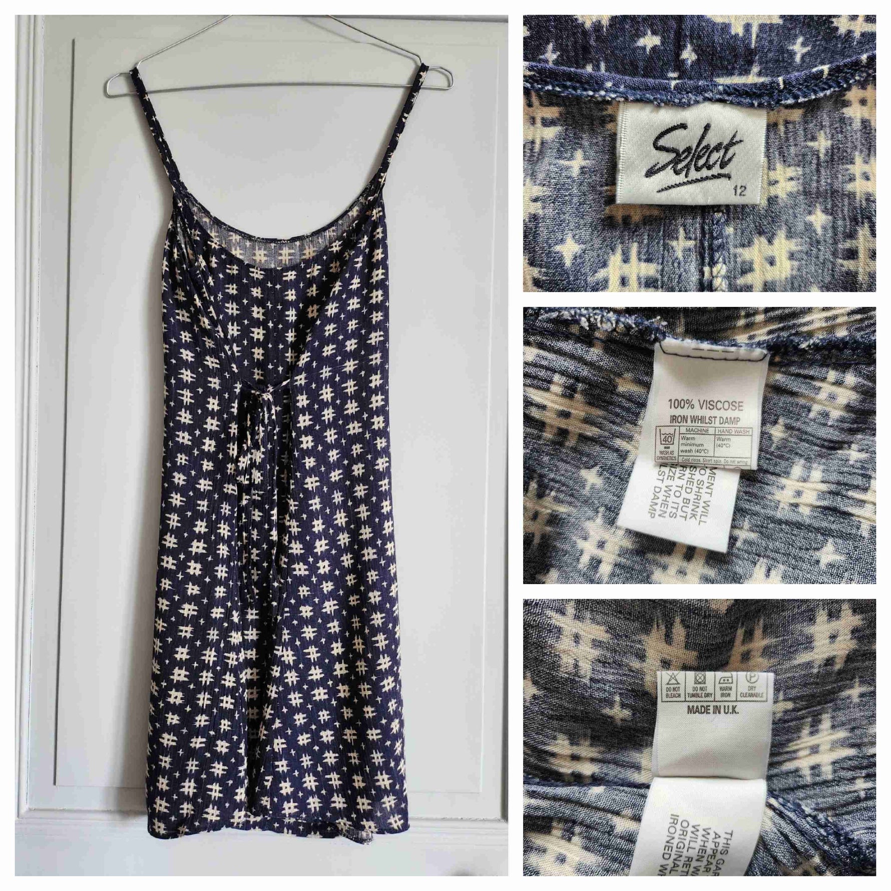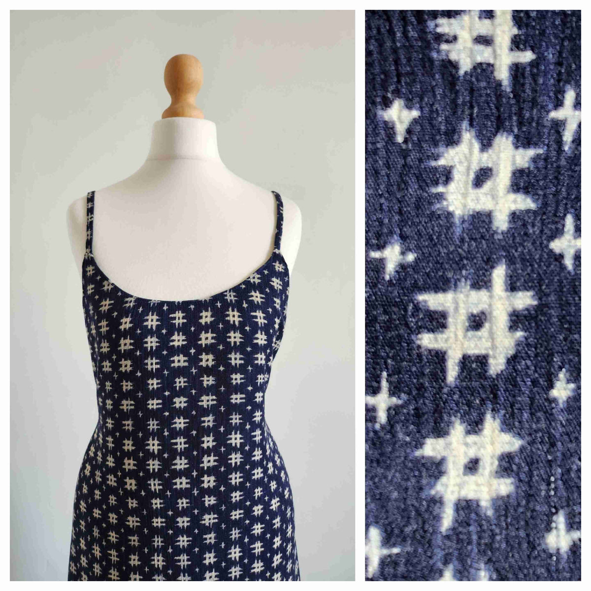 Prix unitaire parRobe courte à fines bretelles en viscose bleu nuit à motifs écrus, forme trapèze fluide, lien à nouer au dos pour resserrer la taille. Made in UK. Poitrine 42 cm.