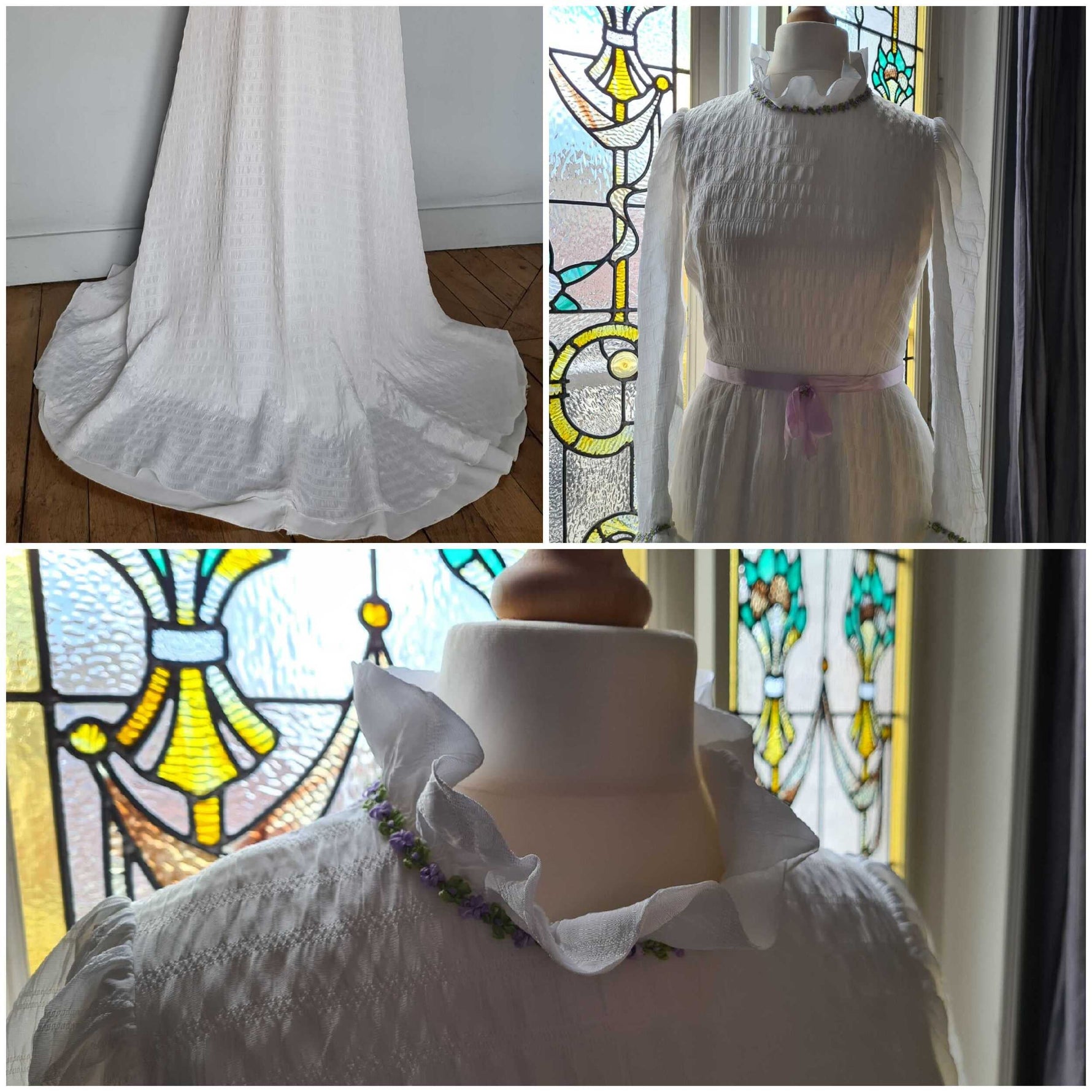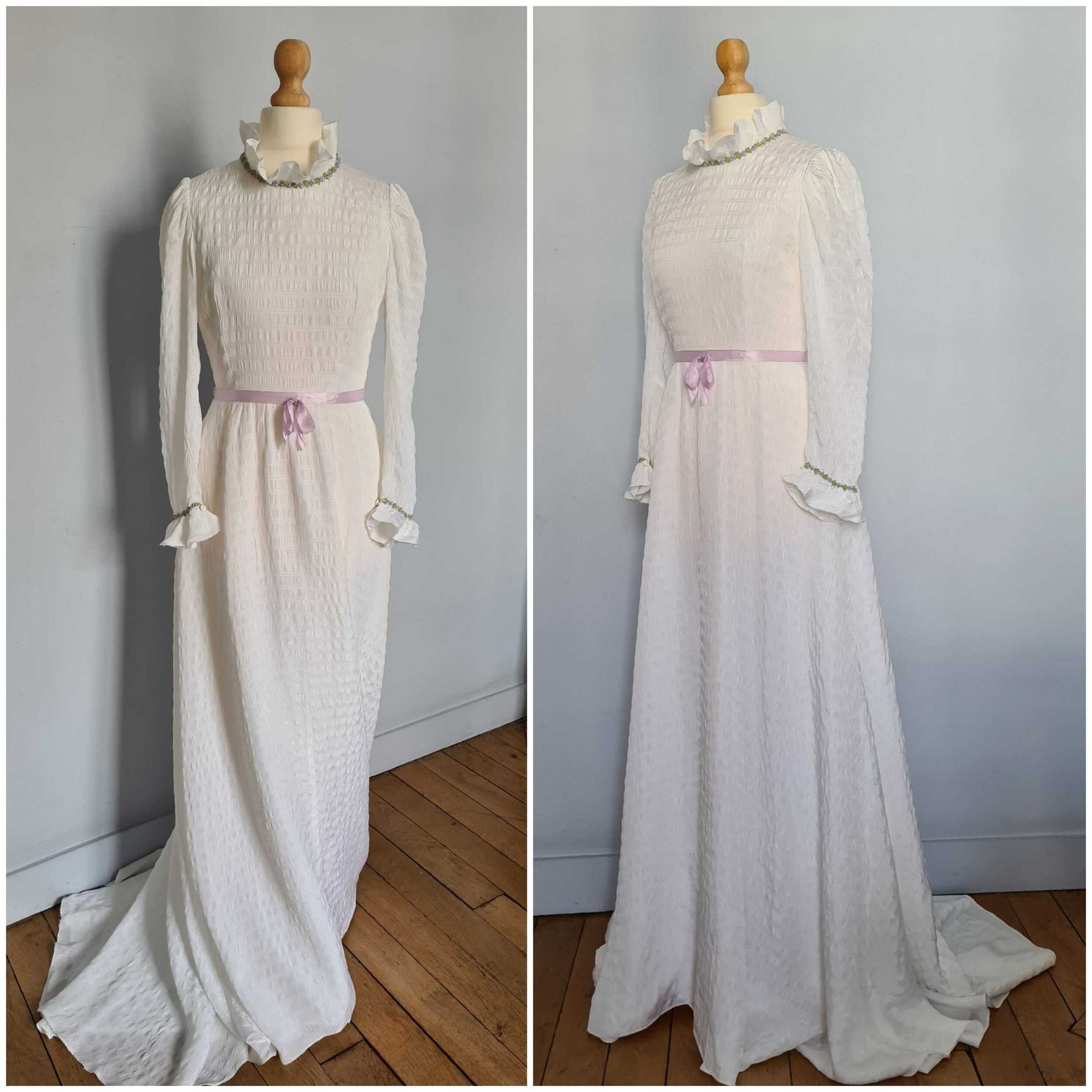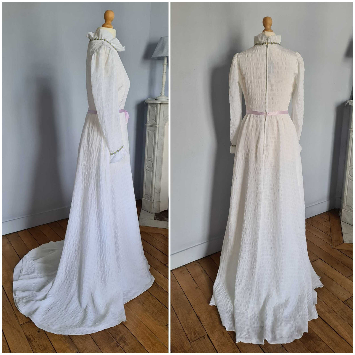 Prix unitaire parRobe de mariée blanche taille haute, en tissu moiré gaufré lumineux, doublée. manches gigot, petite traîne, col remontant à volant, poignets à volants boutonnés. Détails de petite frises de fleurs mauve & vert tendre et ruban de satin parme à la taille. Grande fermeture zippée + deux agrafes au dos. Composition du tissu non indiquée, estimation coton mélangé. Les manches sont non doublées. Magnifique sobriété d'inspiration edwardienne années 70. Une pièce de la marque Pronuptia fabriquée en France.