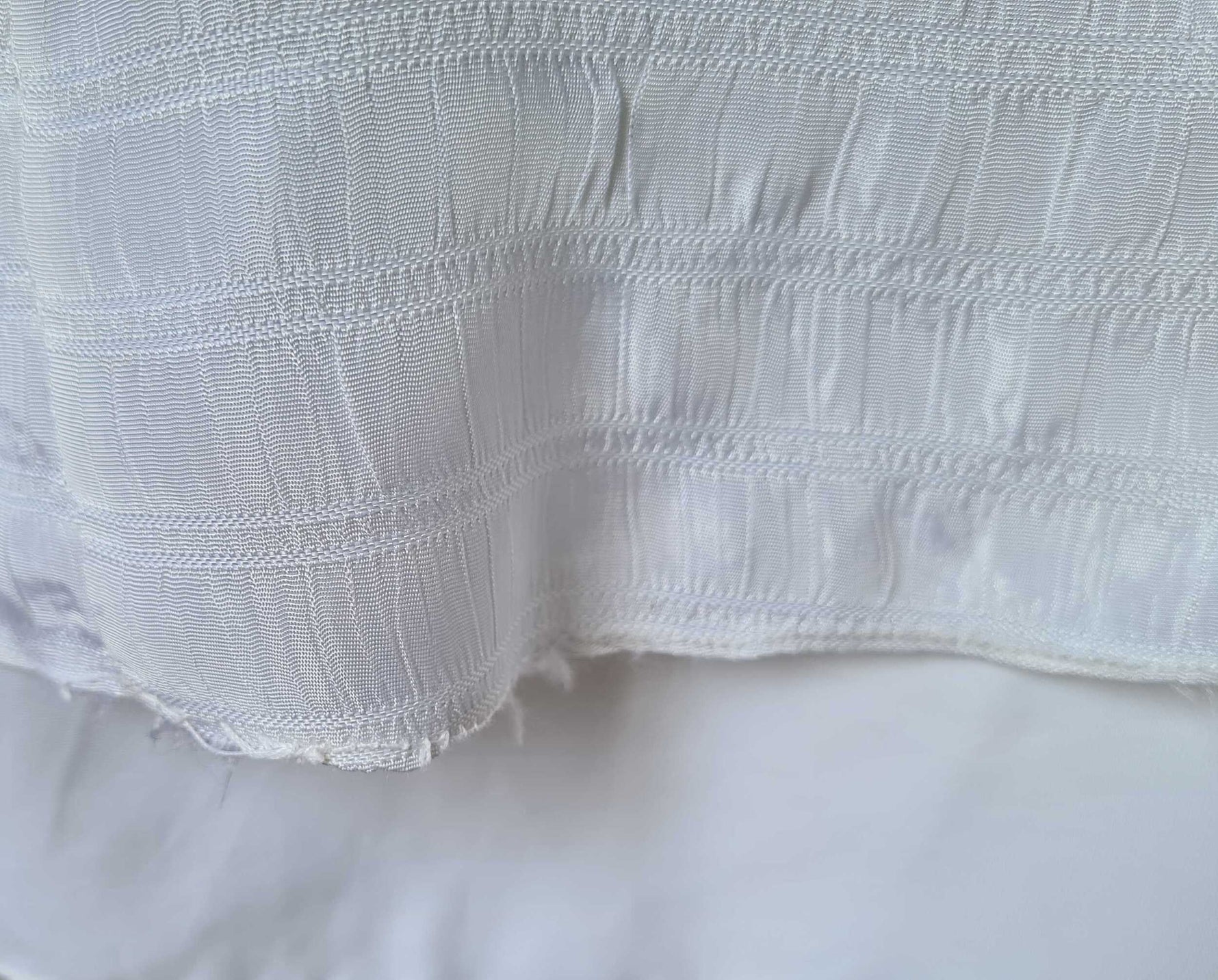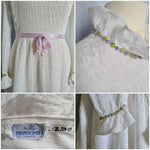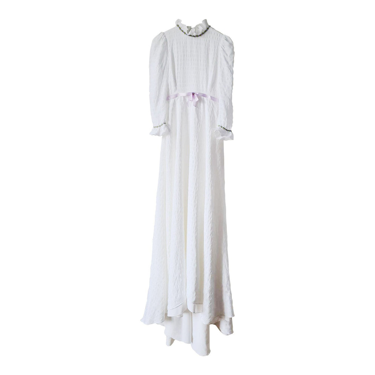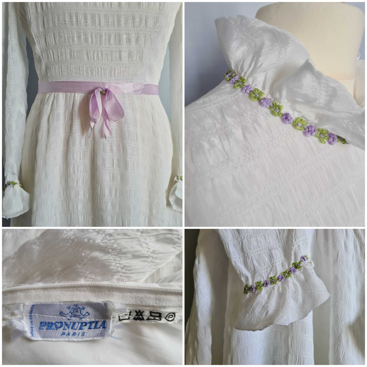 Prix unitaire parRobe de mariée blanche taille haute, en tissu moiré gaufré lumineux, doublée. manches gigot, petite traîne, col remontant à volant, poignets à volants boutonnés. Détails de petite frises de fleurs mauve & vert tendre et ruban de satin parme à la taille. Grande fermeture zippée + deux agrafes au dos. Composition du tissu non indiquée, estimation coton mélangé. Les manches sont non doublées. Magnifique sobriété d'inspiration edwardienne années 70. Une pièce de la marque Pronuptia fabriquée en France.
