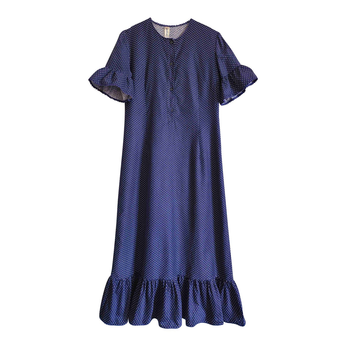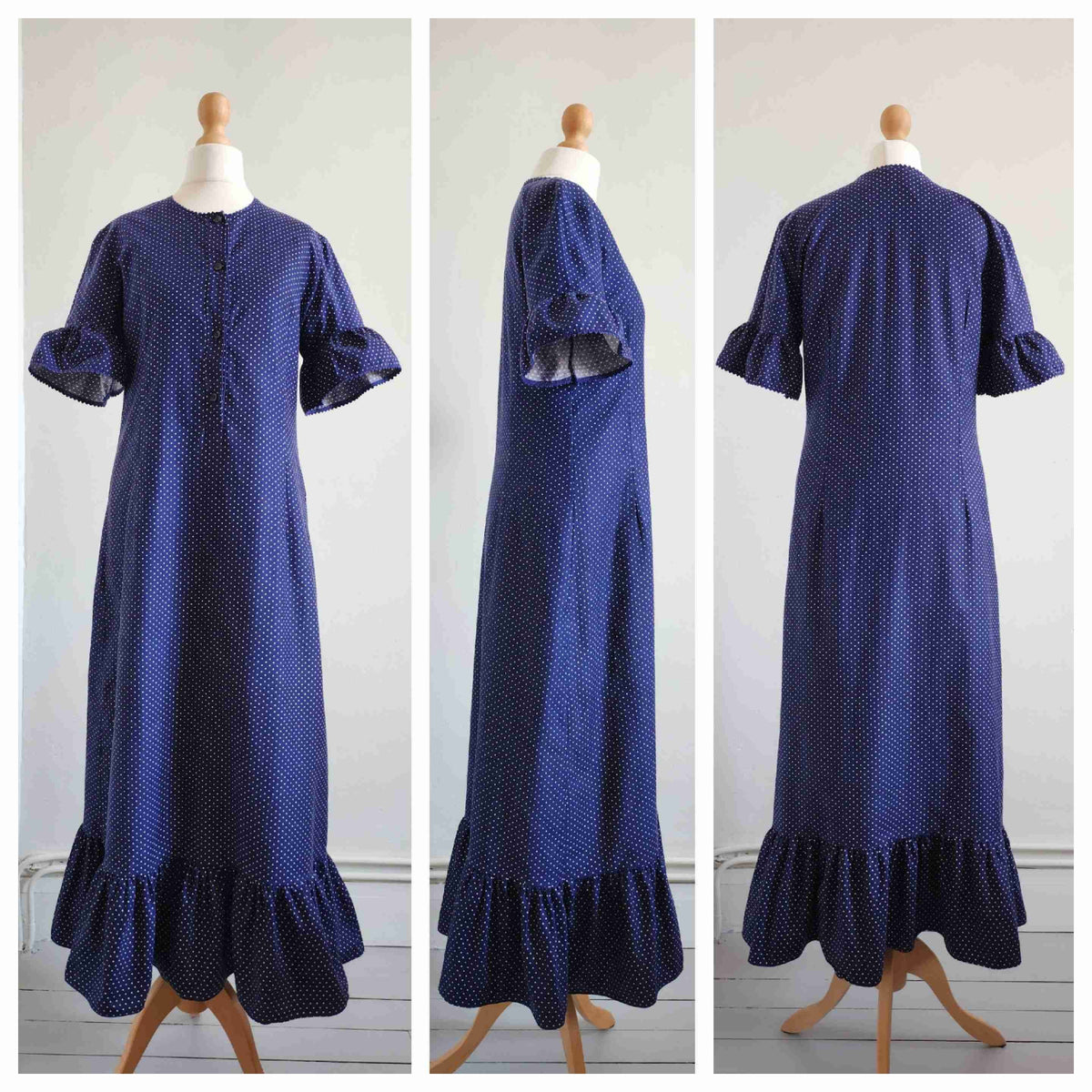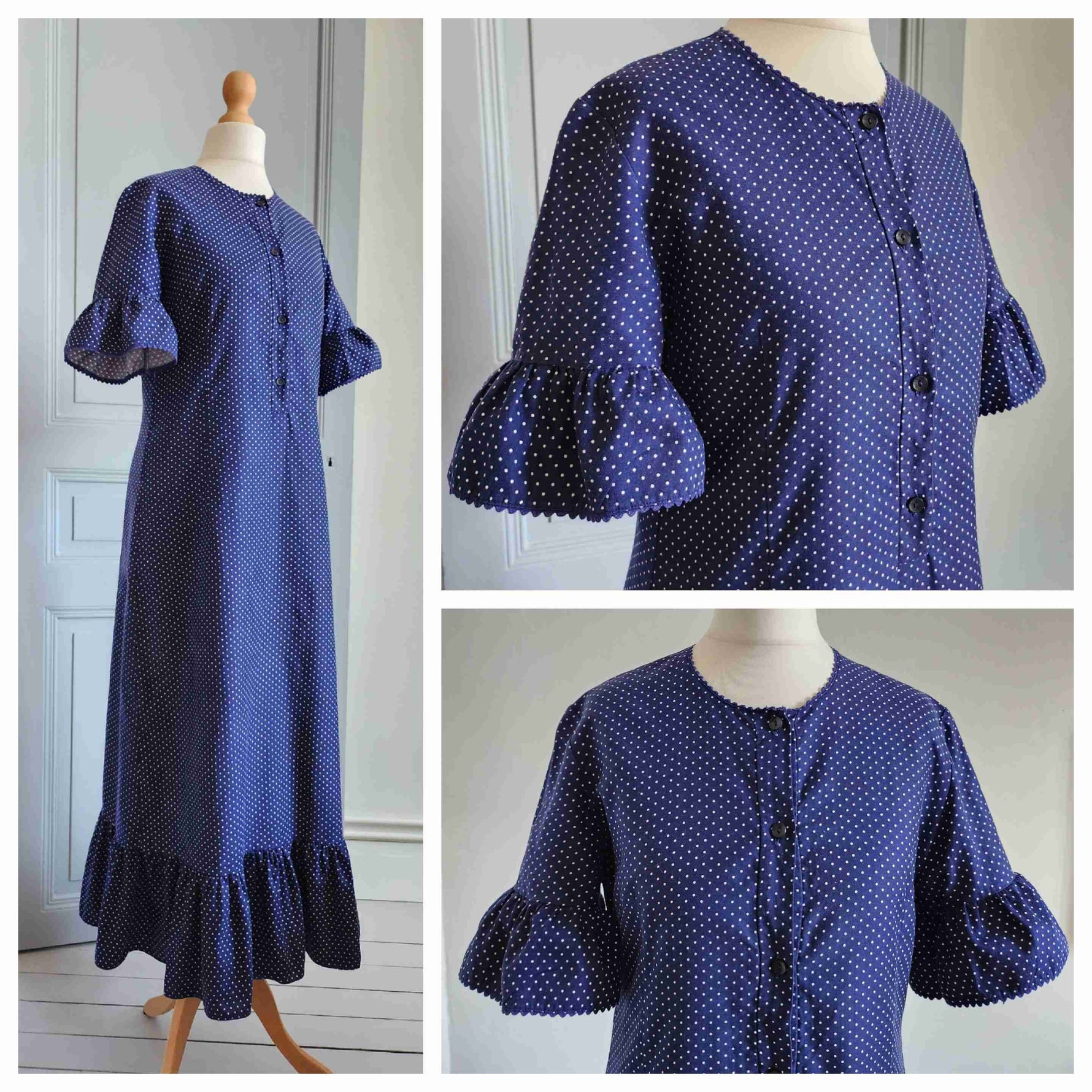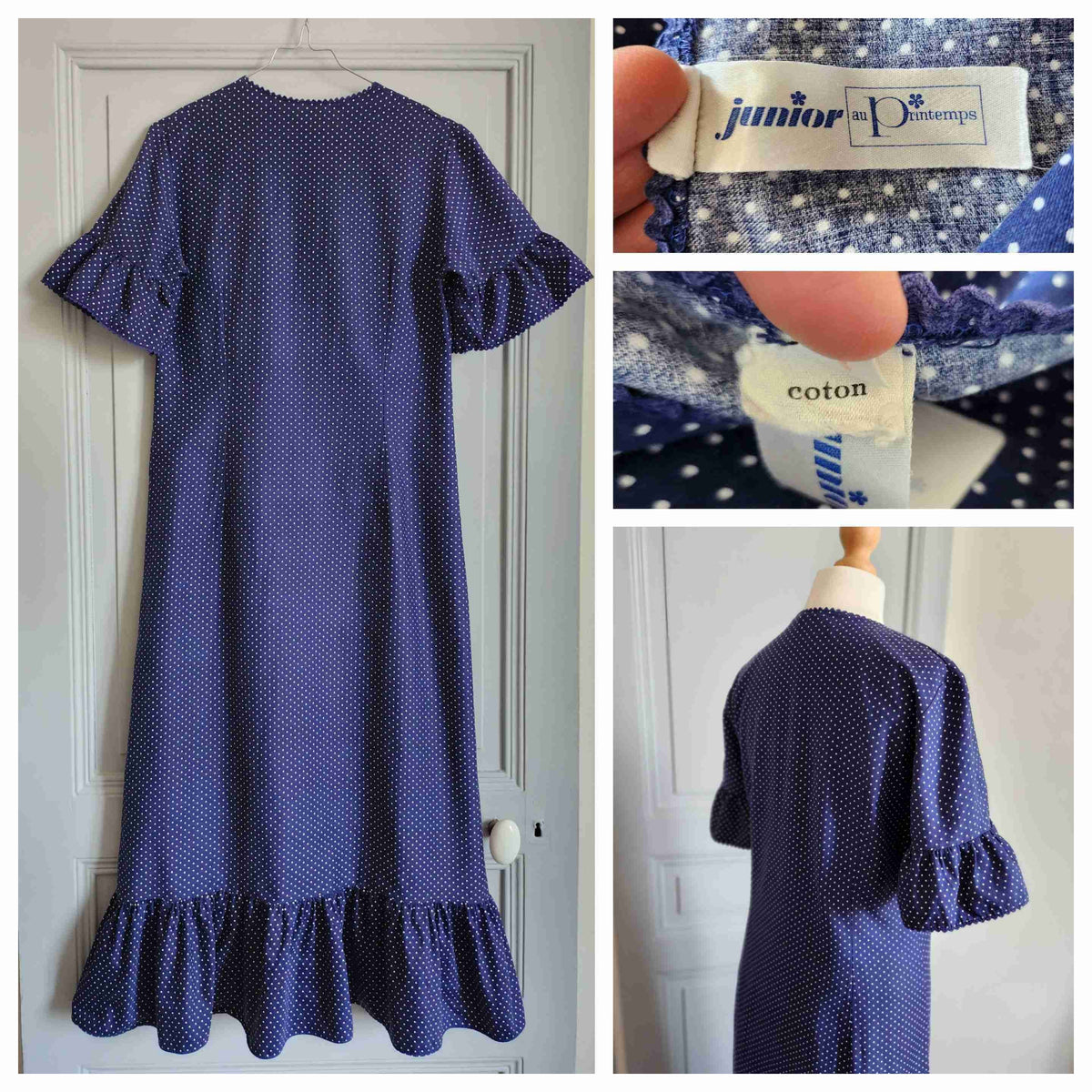 Prix unitaire parRobe en toile coton bleu outremer à mini pois blancs, manches courtes et base volantées, encolure et manches finition croquet, boutonnière buste. Annees 70. Poitrine 45 cm.