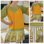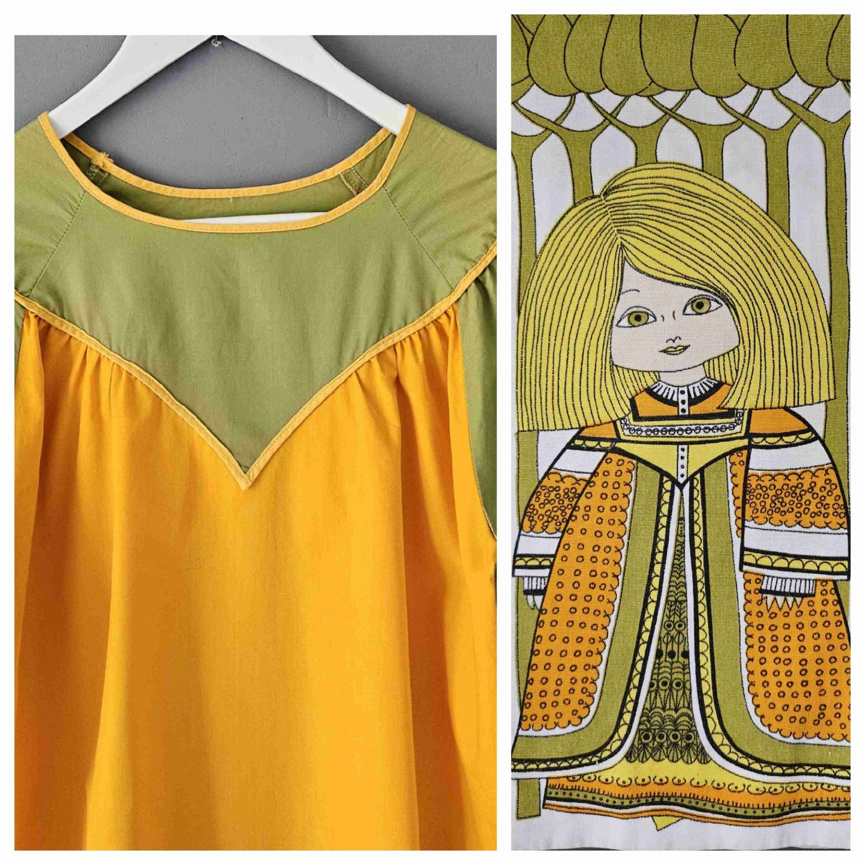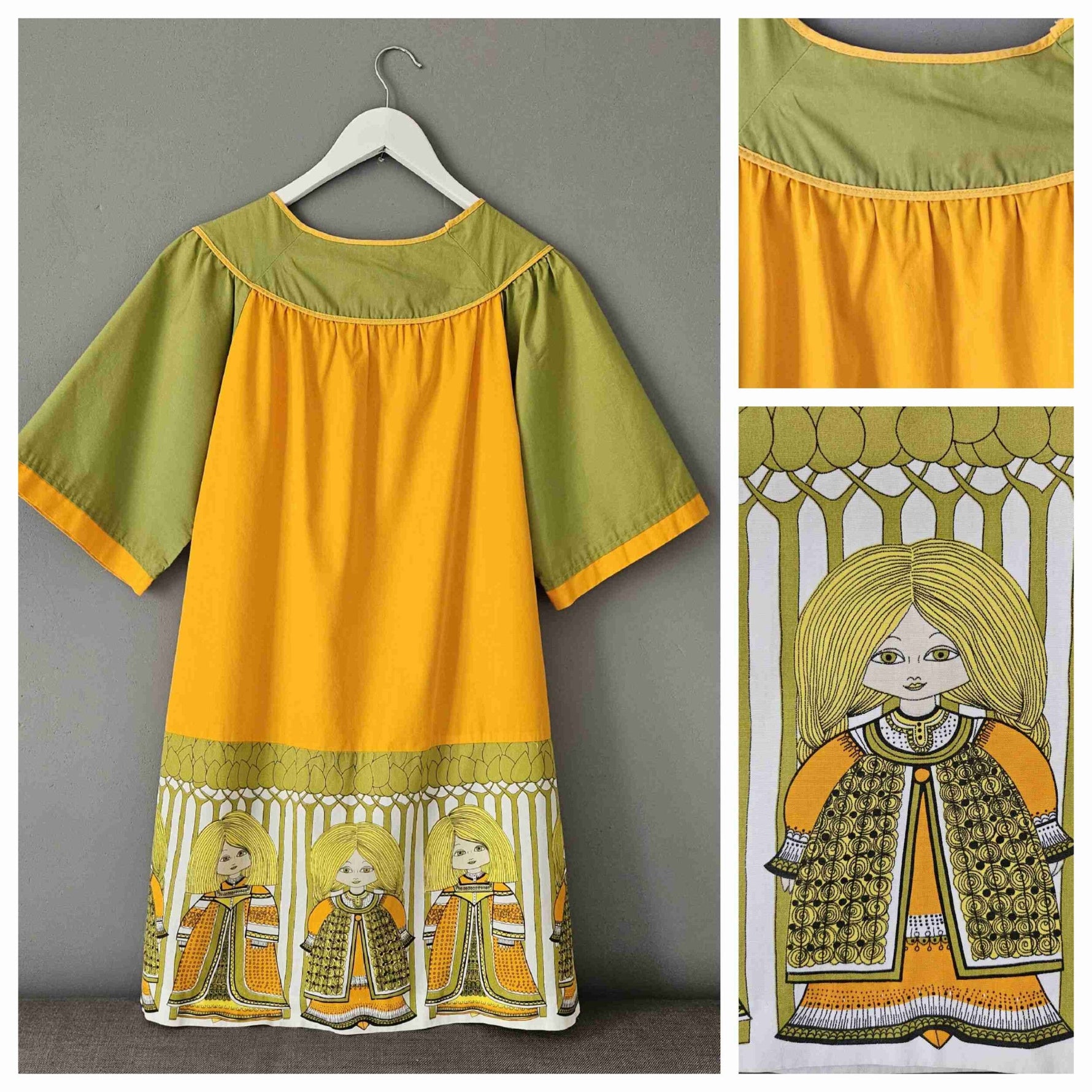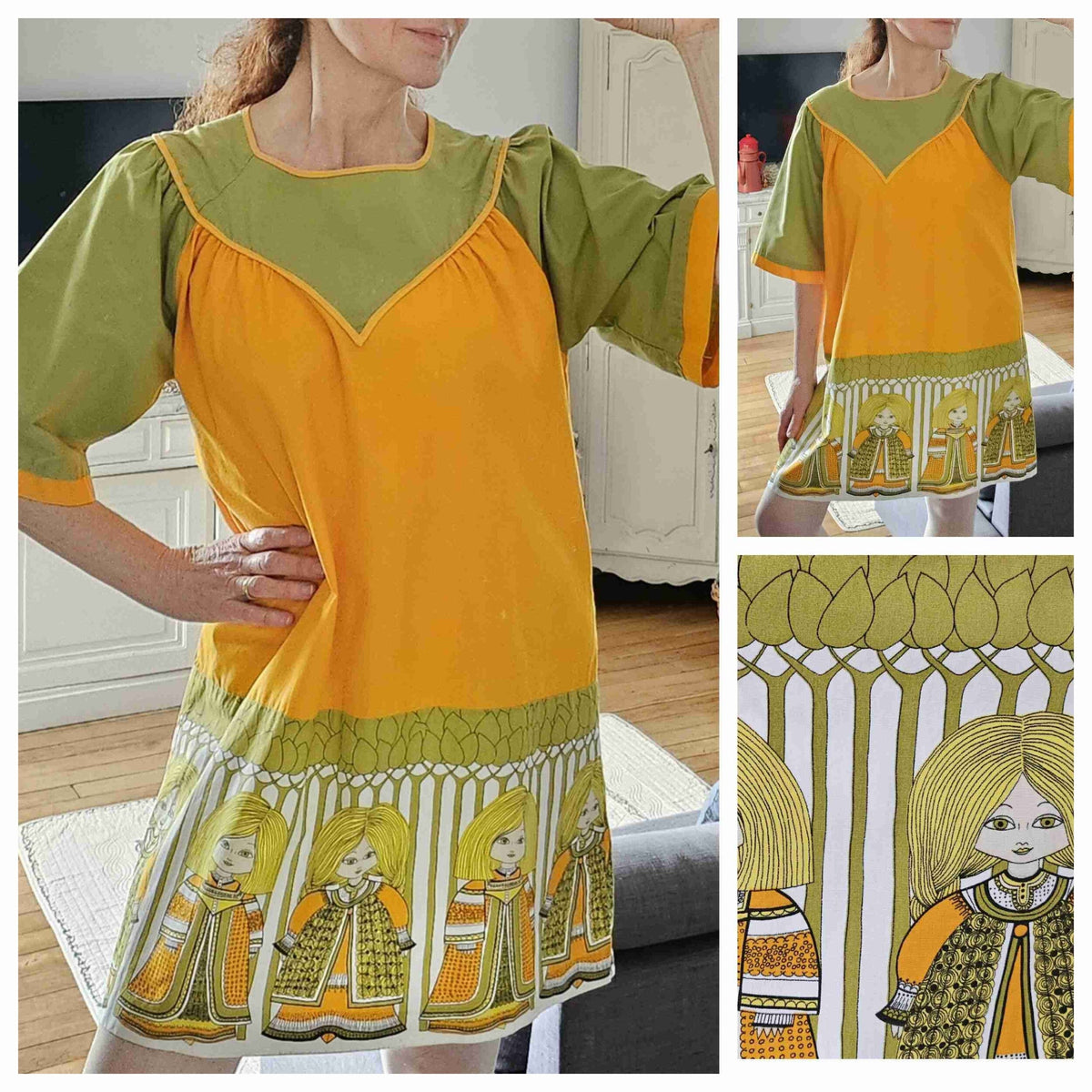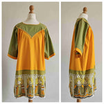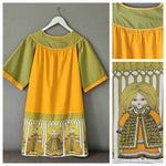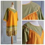 Prix unitaire parMini robe trapèze en fil de coton orange et kaki, manches courtes, fronces poitrine, dos et manches, base imprimée folklore nordique. A enfiler. Poitrine 55 cm.