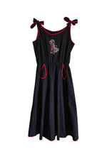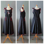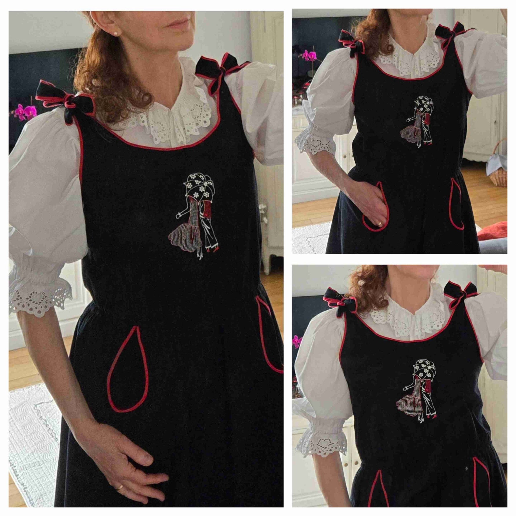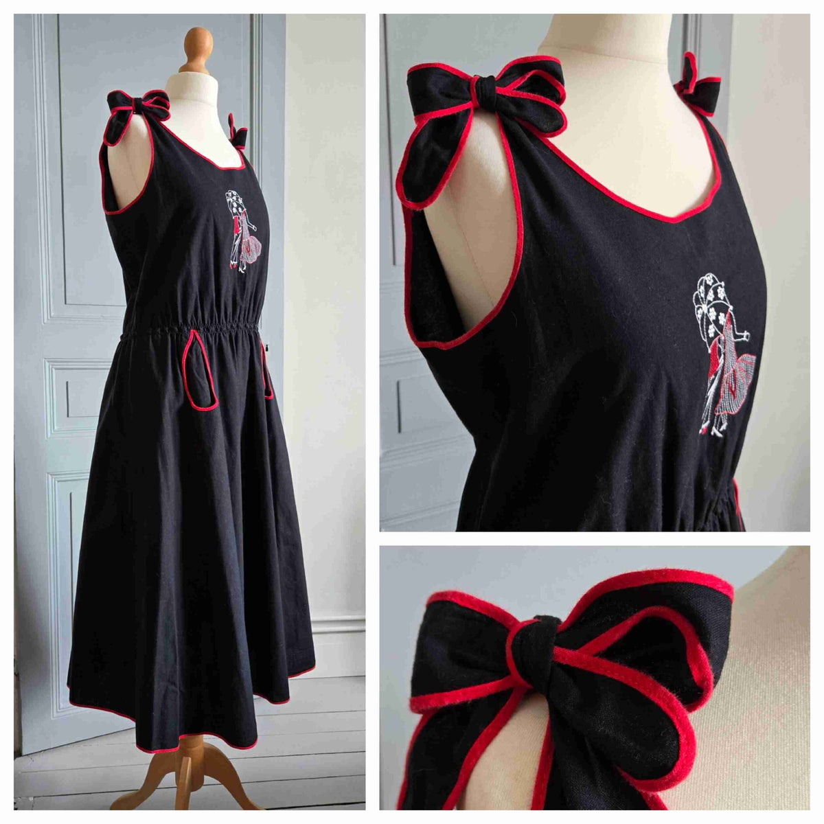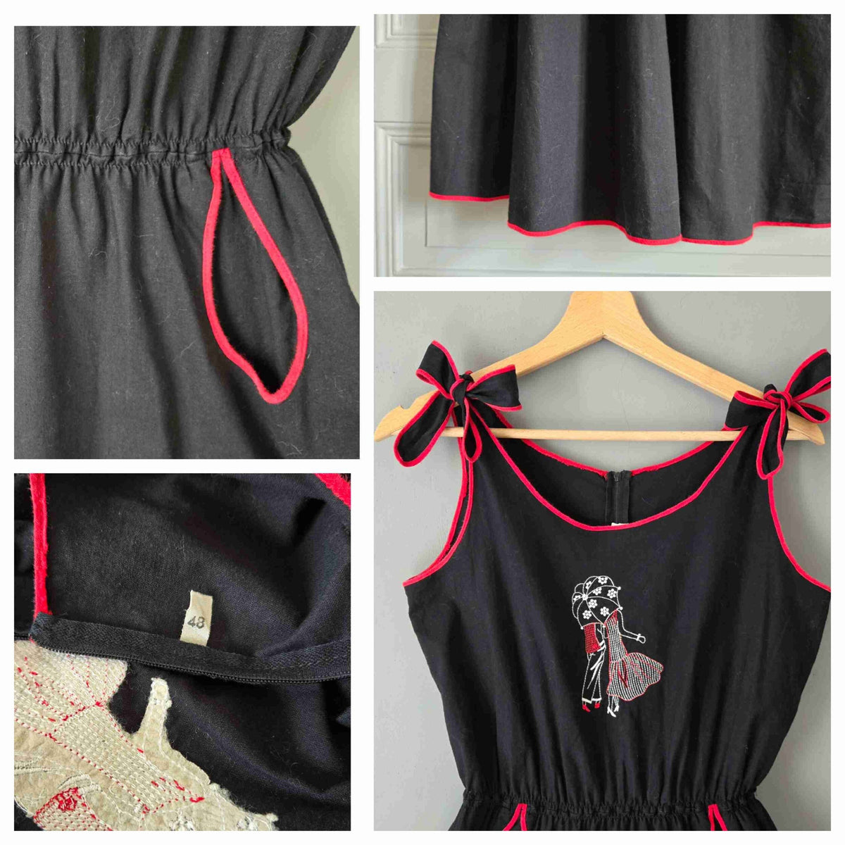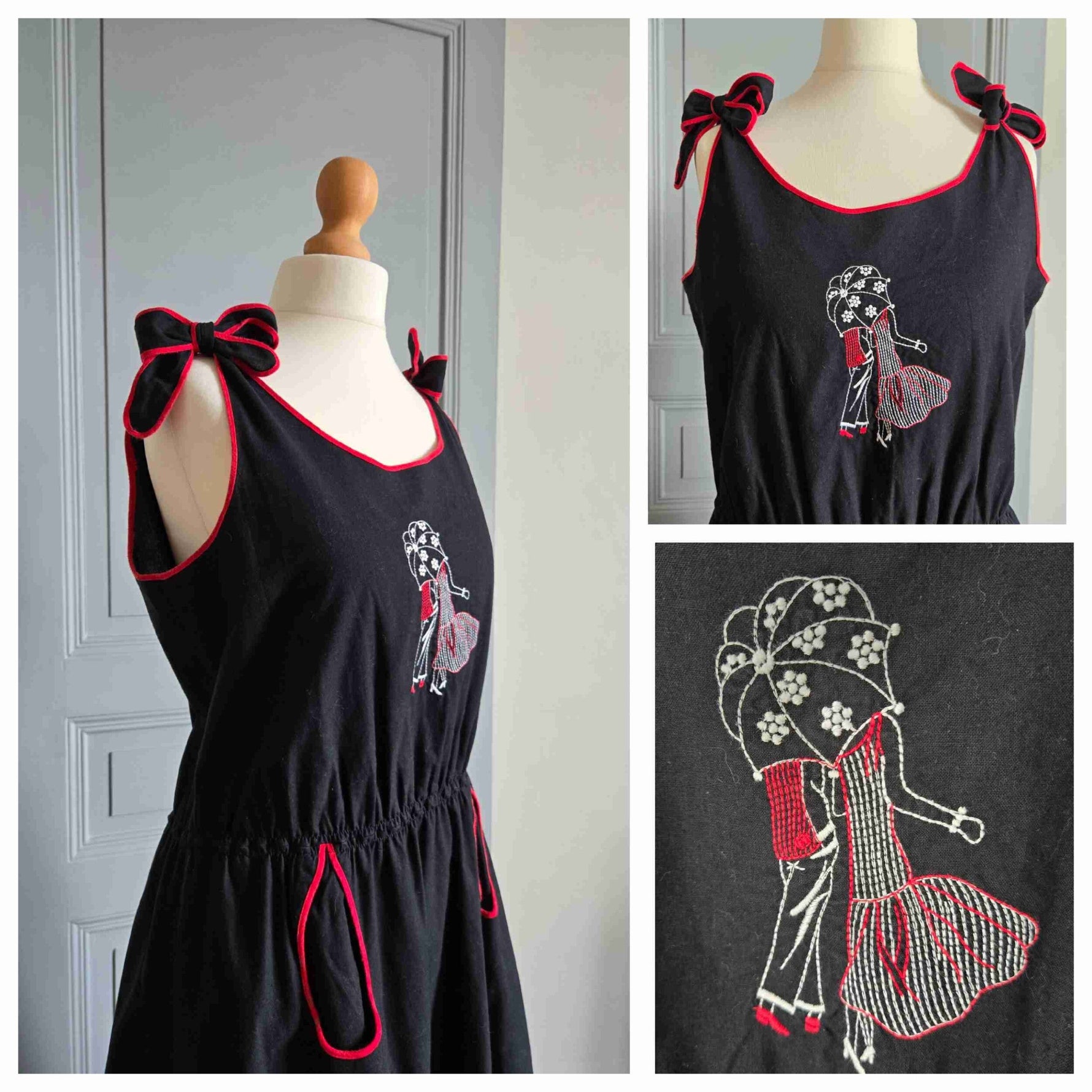 Prix unitaire parRobe midi sans manches en coton noir finitions rouges, bretelles à nouer, devant brodé couple au parapluie, taille élastiquée, poches. Fermeture éclair au dos. Porté sur les photos par une personne T36. Pièce des années 70. Poitrine 46 cm.