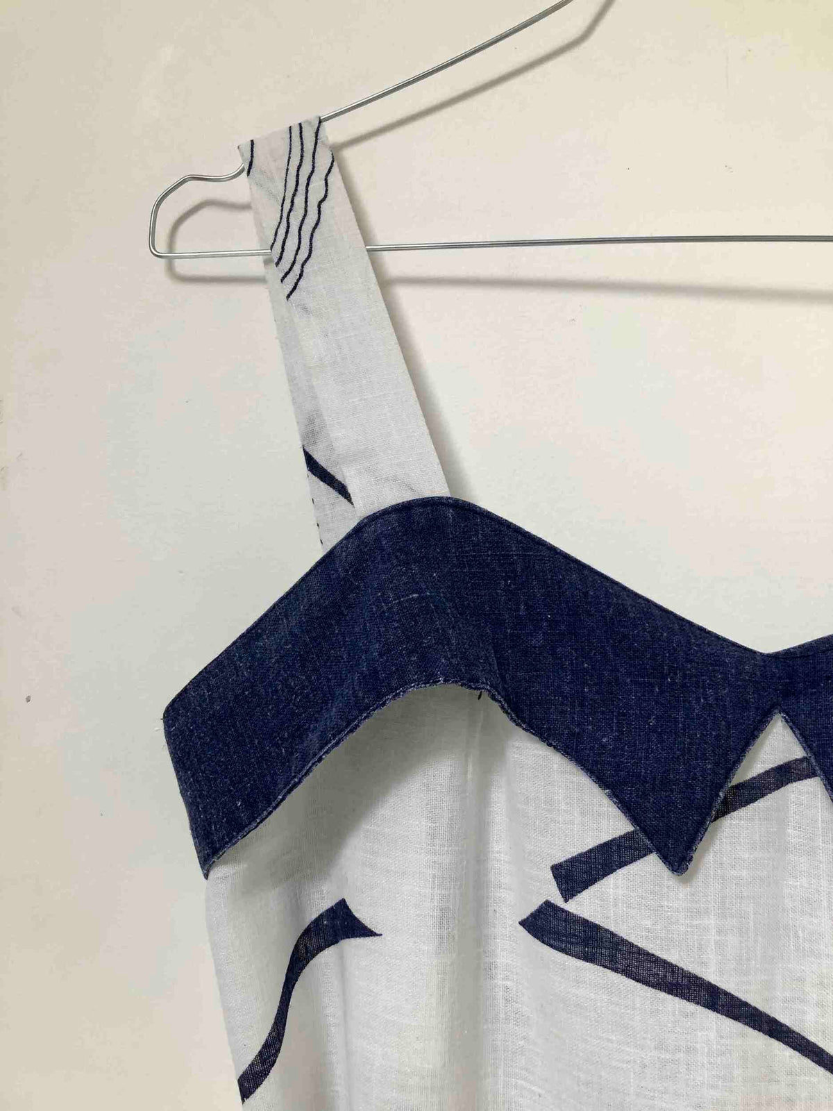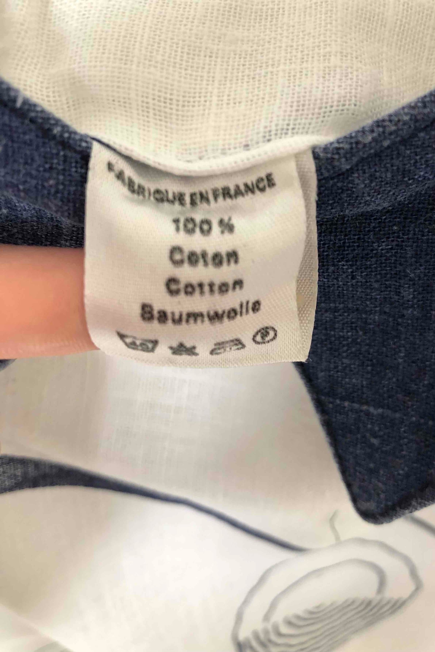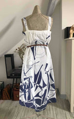 Prix unitaire parRobe en coton. Fabriquée en France. Coupe droite resserrée à la taille par une fine ceinture en cuir, élastique dans le dos, longueur midi. Le coton est léger et a une petite transparence.