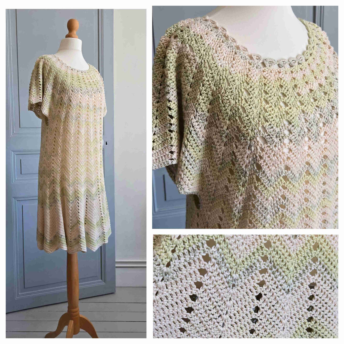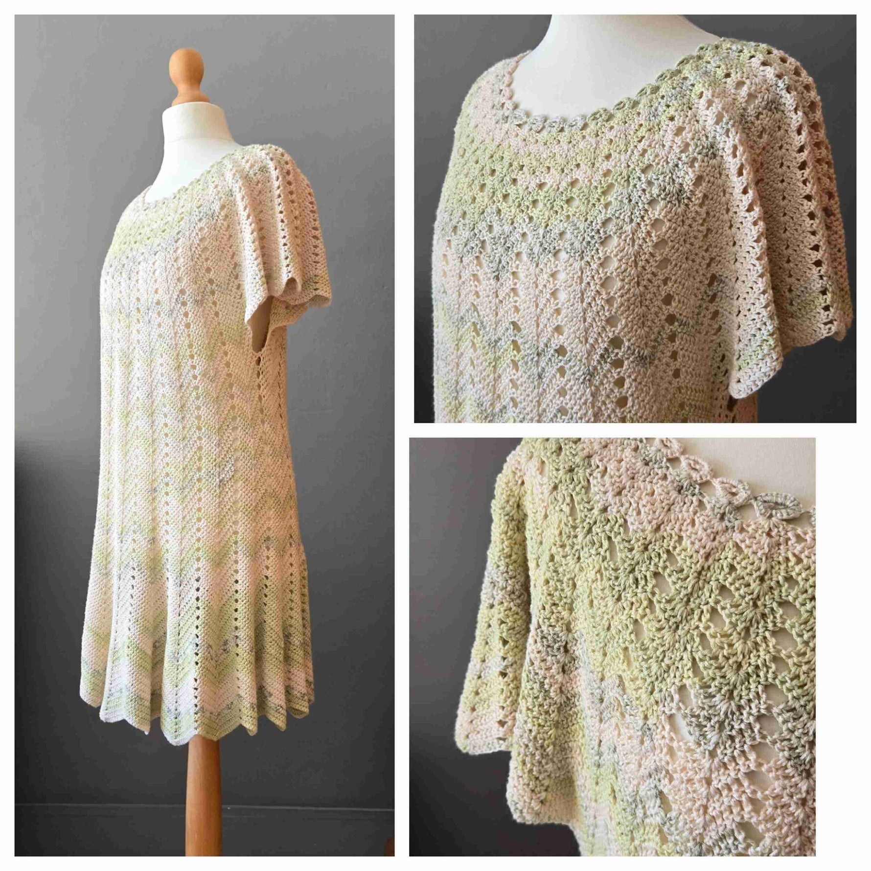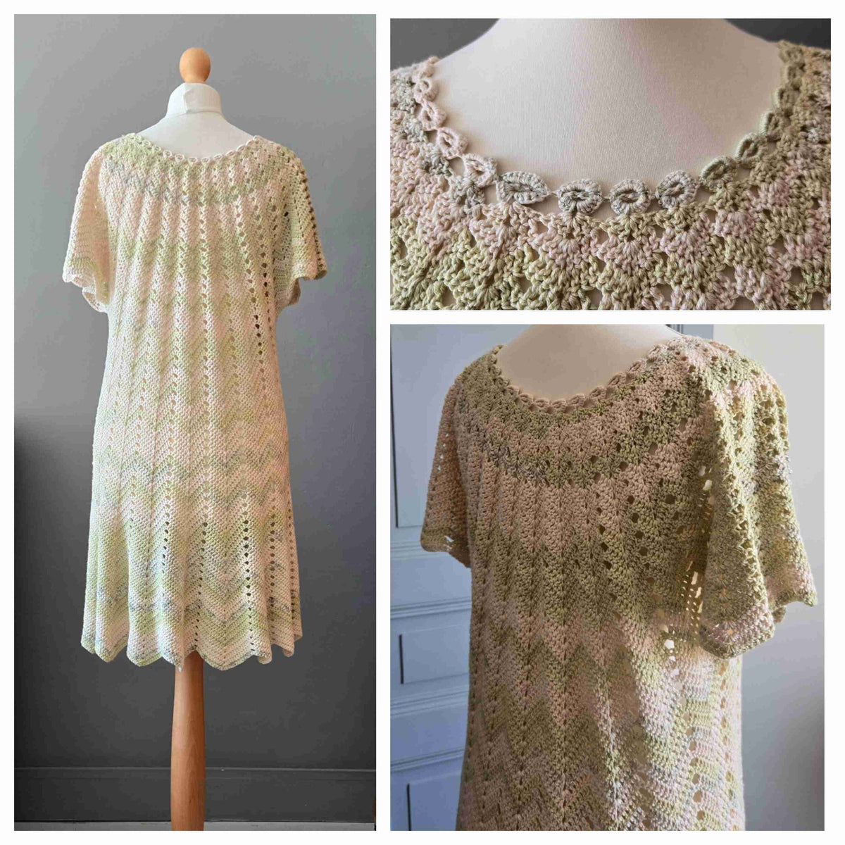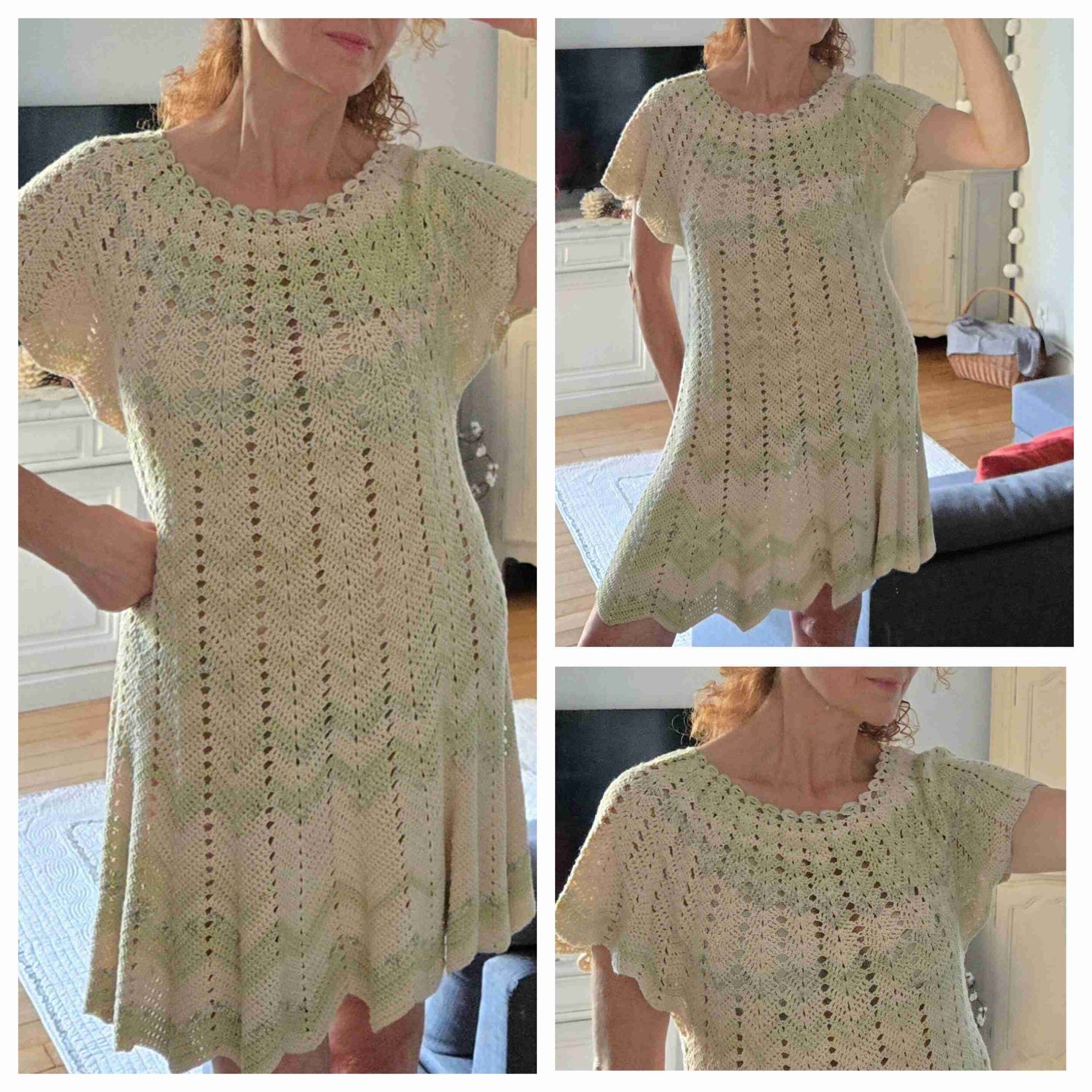 Prix unitaire parRobe en crochet de coton beige et vert amande, petites manches ranglan papillon, coupe corolle avec base festonnée. Porte sur les photos par une personne T36. Fait main. Poitrine 46 cm.