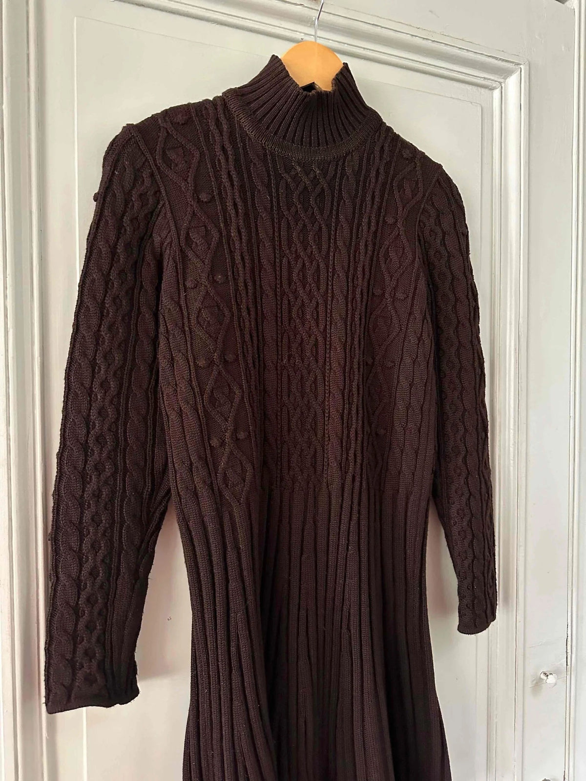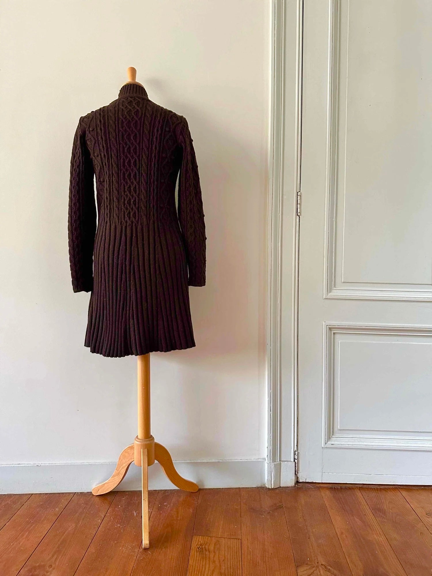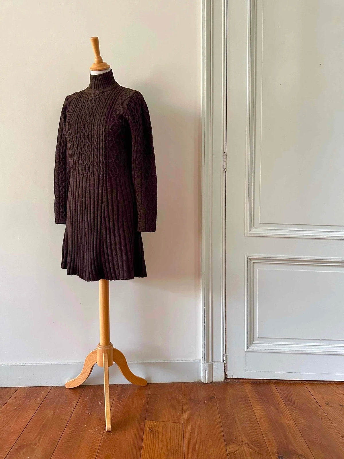 Robe en laine torsadée, laine merinos mélangée brun chocolat, col montant, maille torsadée et popcorn pompons brodés esprit irlandais, bas flare en maille côtelée, années 90s, convient aux tailles 36 et 38 portée ici sur un mannequin T36, aisselles 44cm, longueur 90cm