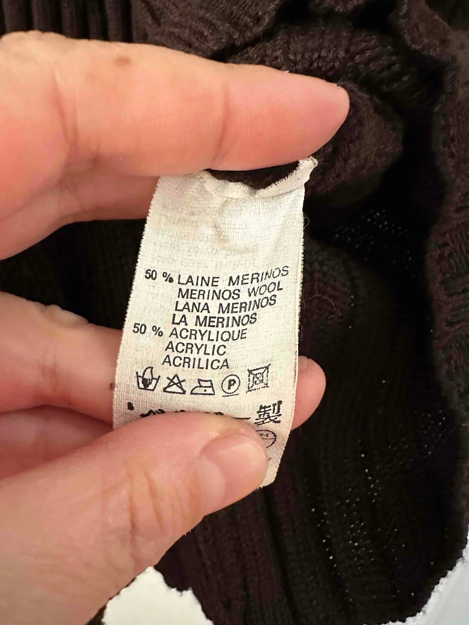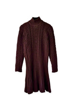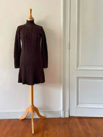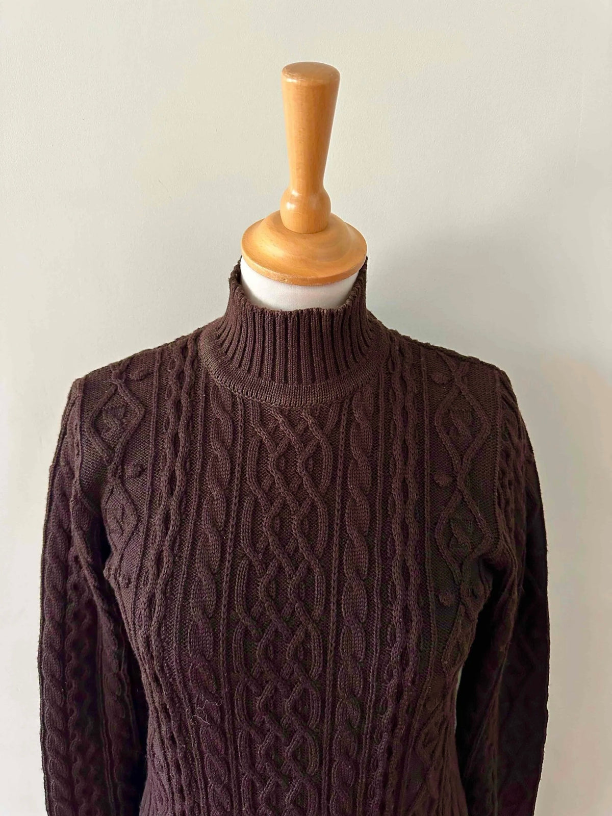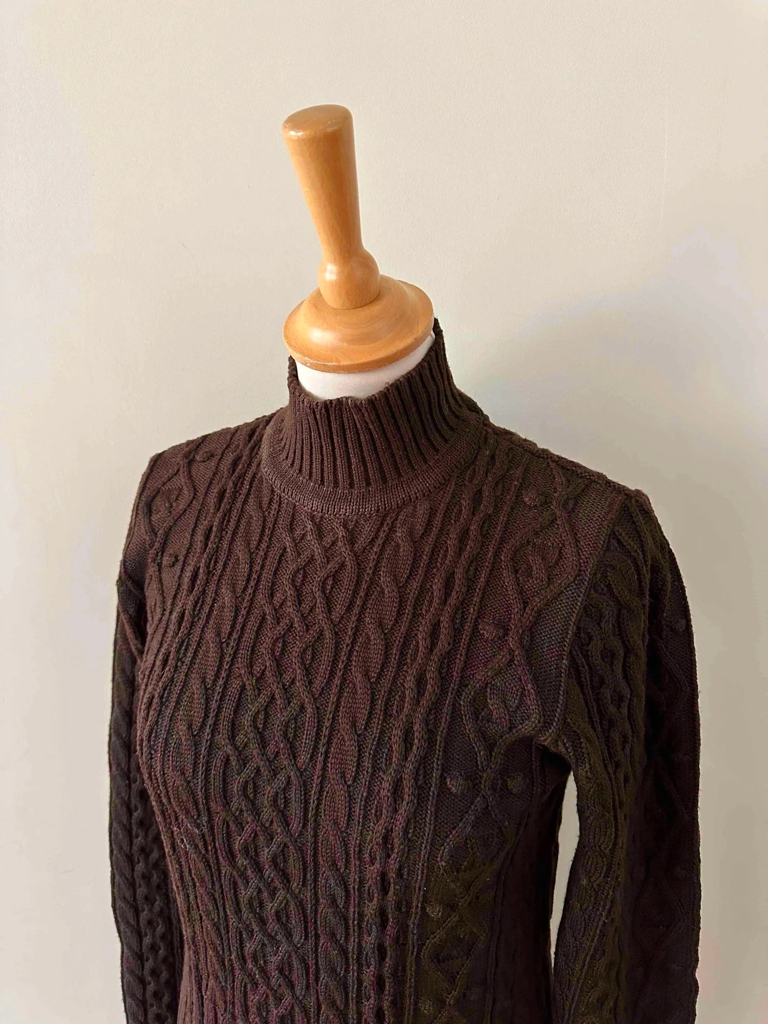 Robe en laine torsadée, laine merinos mélangée brun chocolat, col montant, maille torsadée et popcorn pompons brodés esprit irlandais, bas flare en maille côtelée, années 90s, convient aux tailles 36 et 38 portée ici sur un mannequin T36, aisselles 44cm, longueur 90cm
