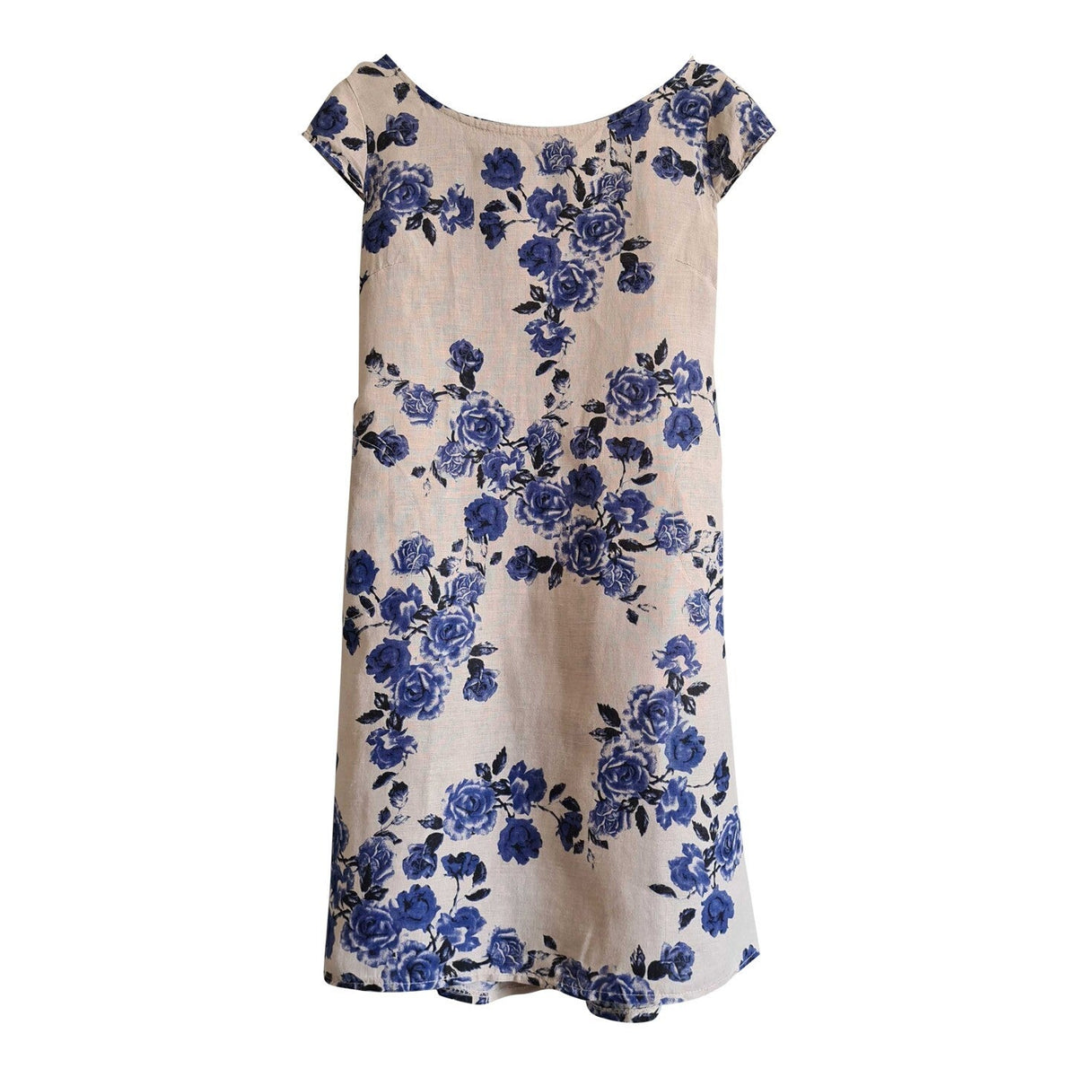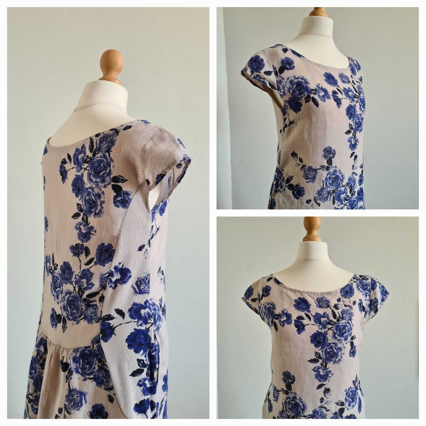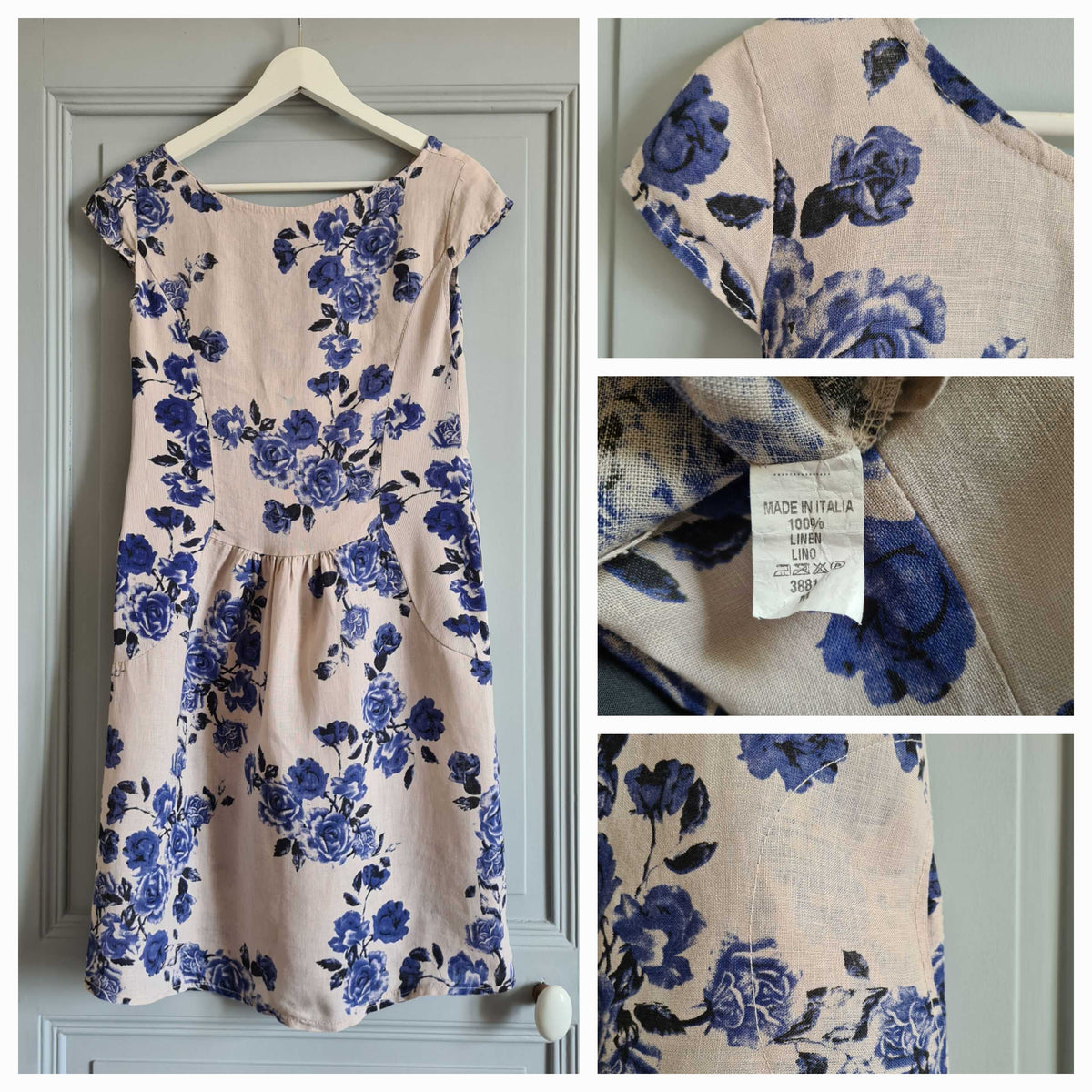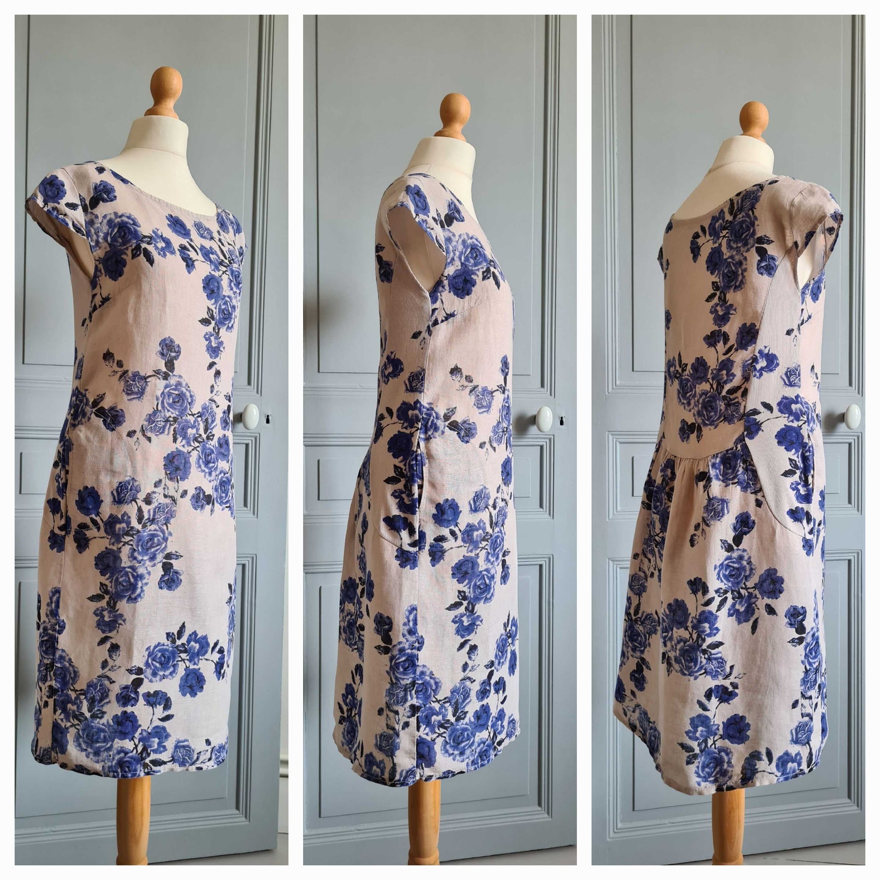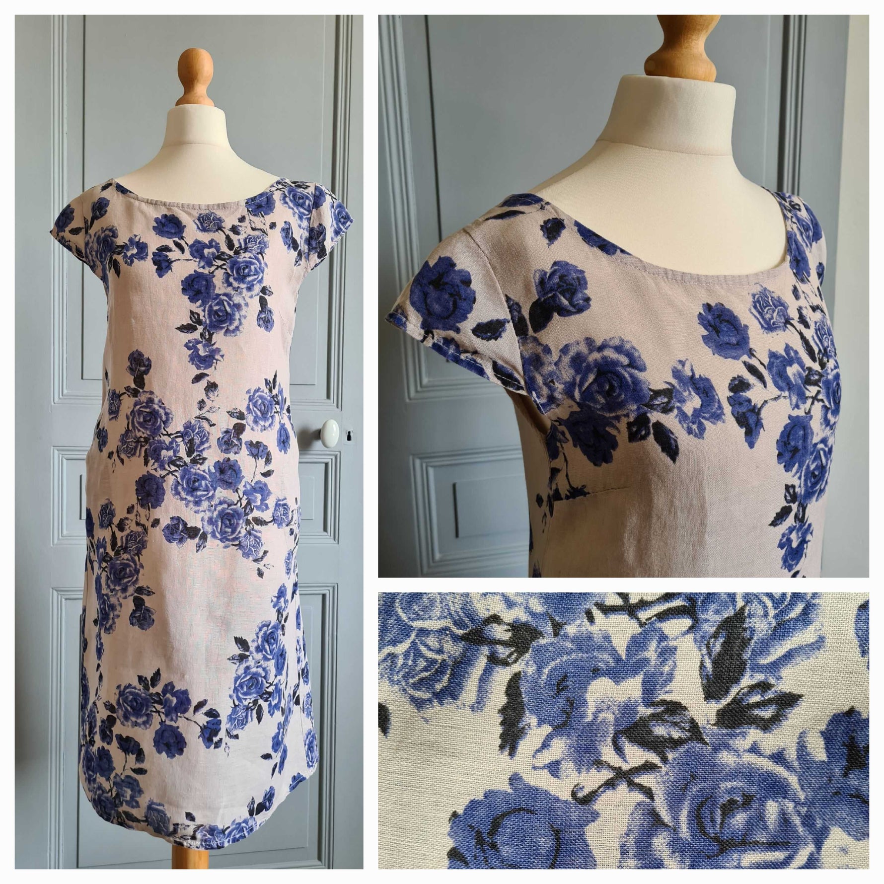 Prix unitaire parRobe en lin ton naturel à motifs de roses bleues, petites manches courtes, deux poches plaquées latérales. Coupe légèrement cintrée avec empiècement élastique sur les côtés pour plus de souplesse. Fronces à l'arrière. A enfiler. Pièce 100% lin, fabriquée en Italie. Poitrine 42 cm.