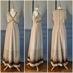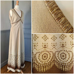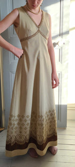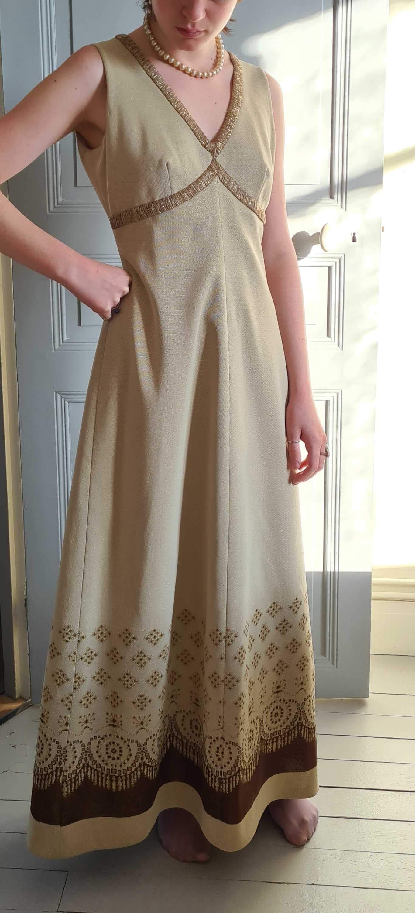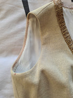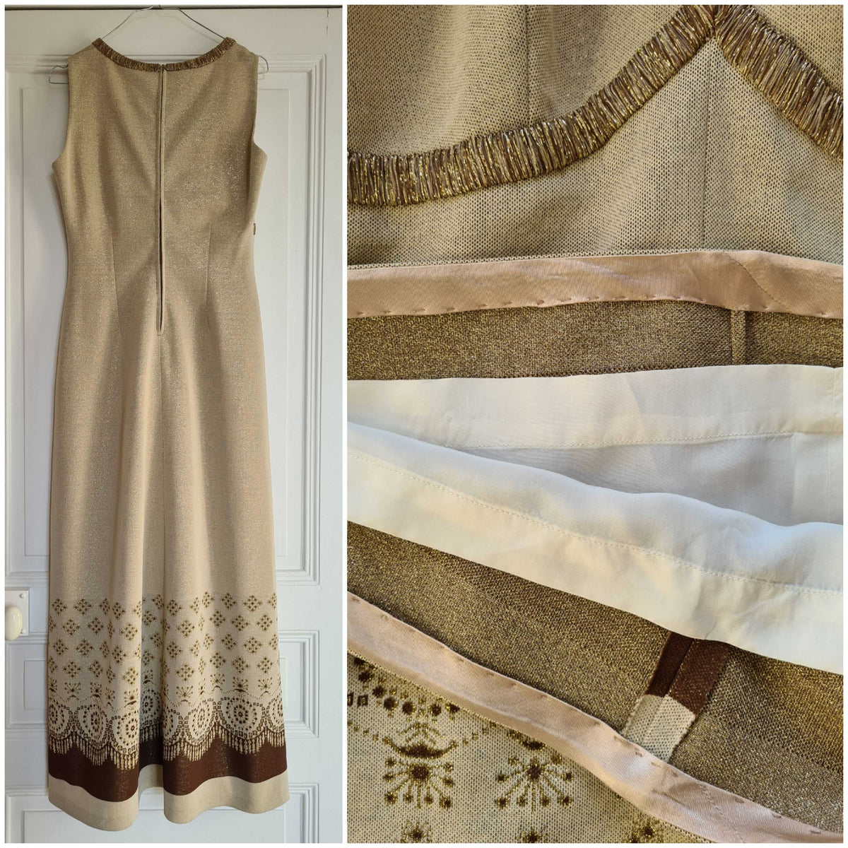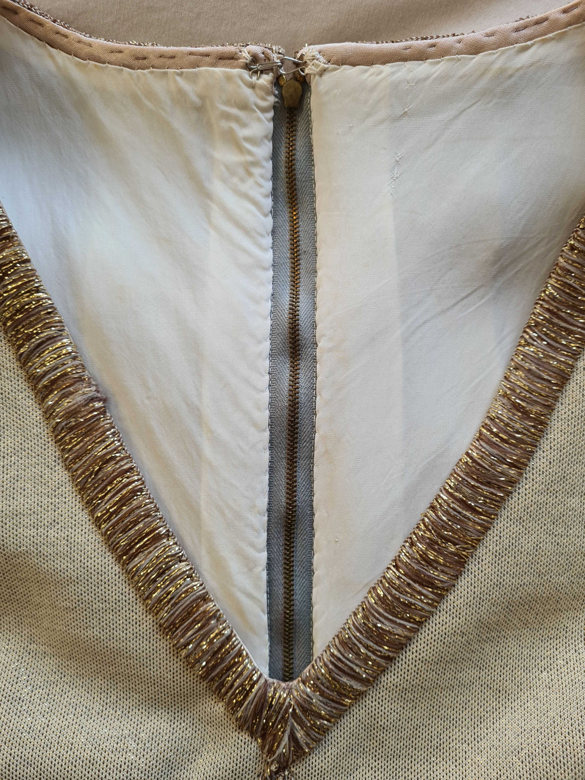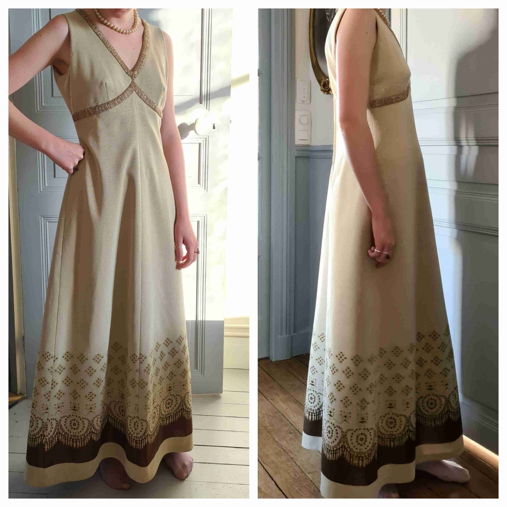 Prix unitaire parRobe sans manches en lurex beige doré, toute doublée, encolure V, taille haute marquée, coupe trapèze, base jacquard or et chocolat, glissière au dos. Longueur maxi. Portée par une taille 36 sur les photos, parfaite pour un haut 38. Une pièce unique cousue main, qualité des finitions, travail de couturière. Poitrine 46 cm